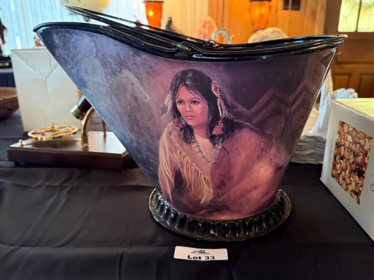 Galvanized metal handled bucket with painted native theme
