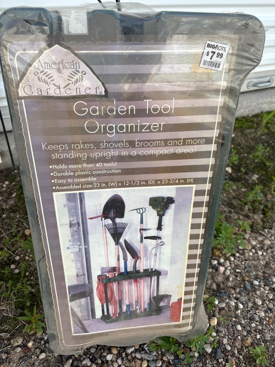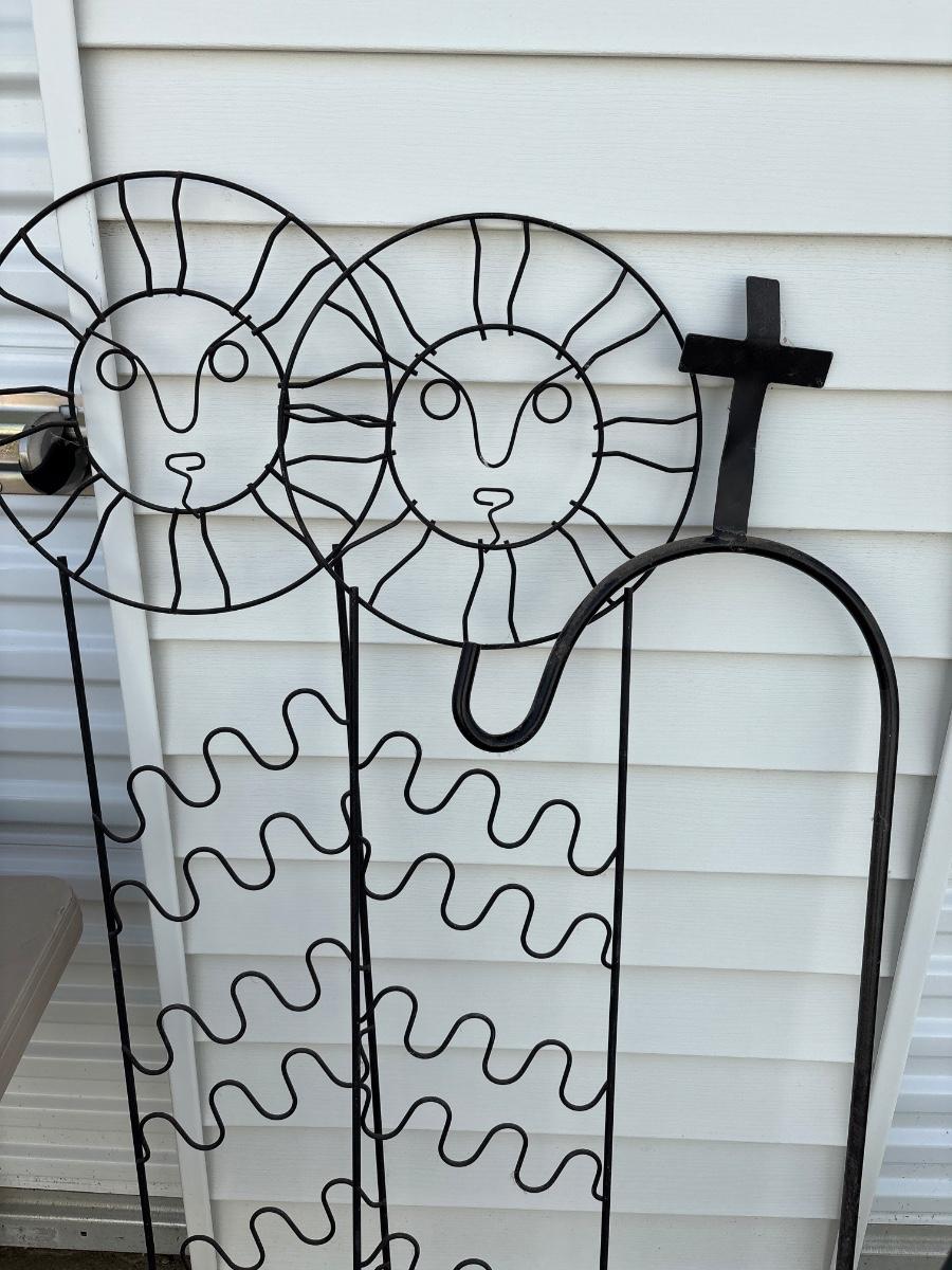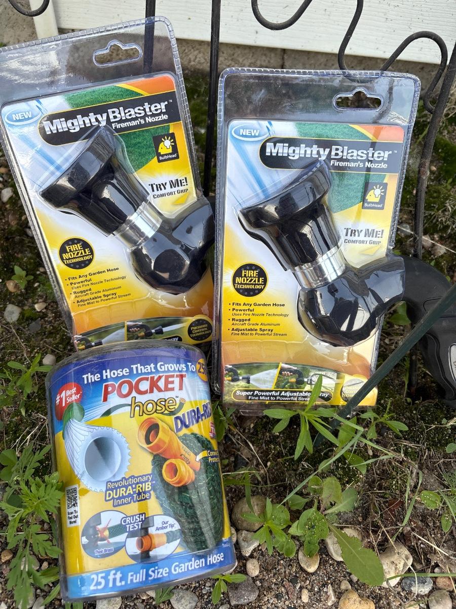 Shepherds Hook, garden art, mighty blaster, fireman, nozzles, cock, hose, and garden tool organizer