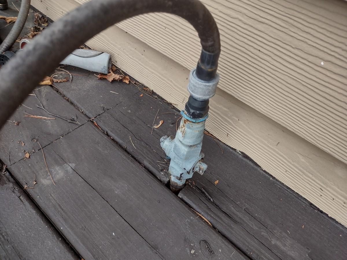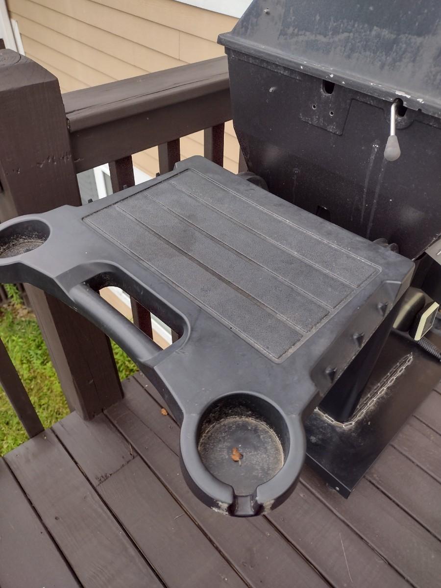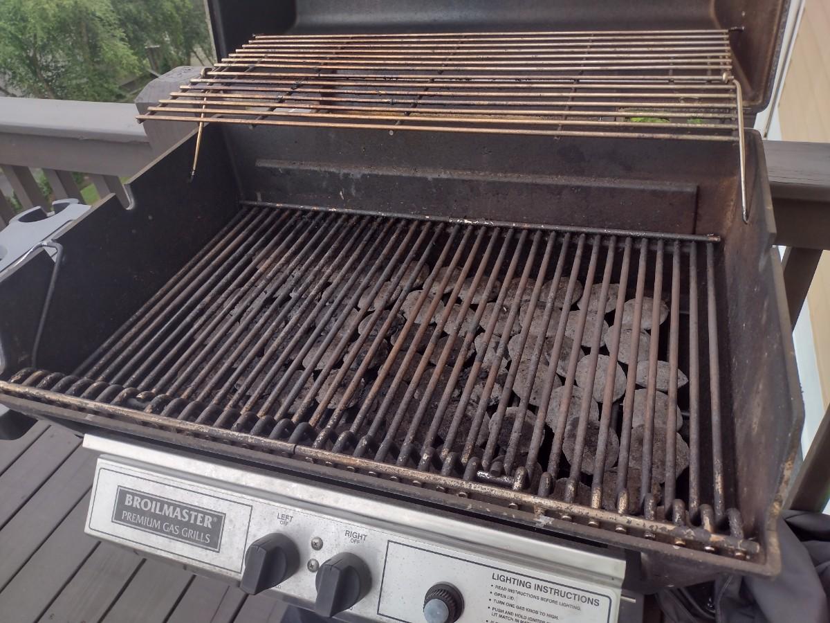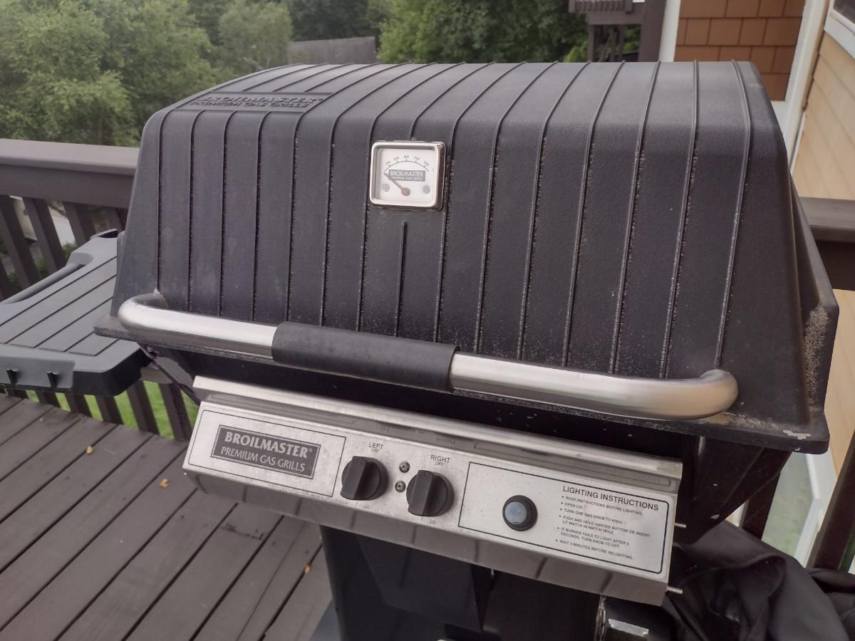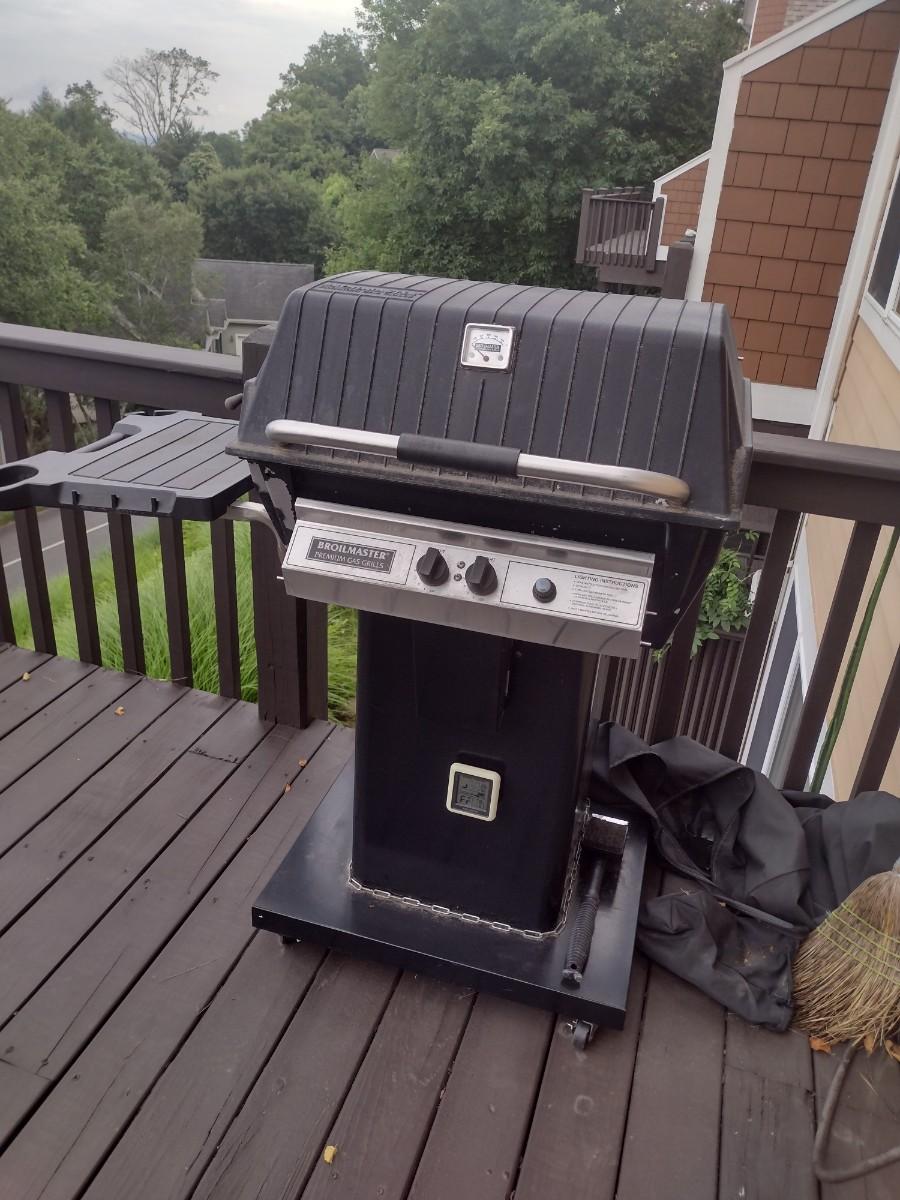 Gas Broil Master Outdoor Grill hooked to gas line at house with quick disconnect.