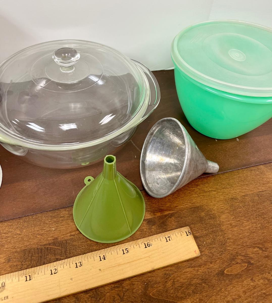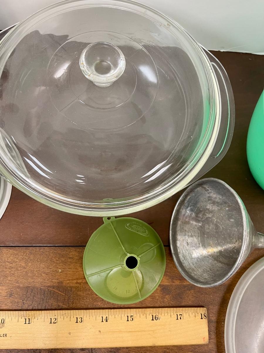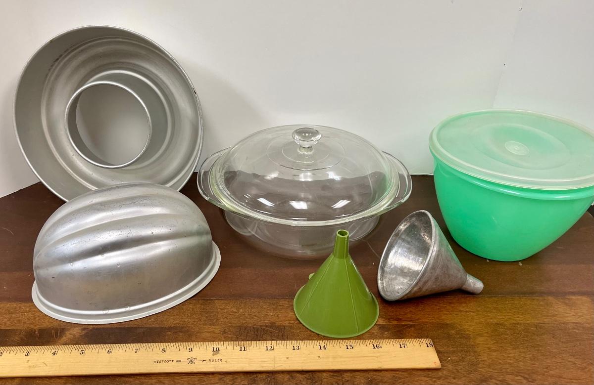 Vintage Kitchen Lot - Pyrex Casserole, Tupperware Lettuce Keeper, Funnels, jello molds