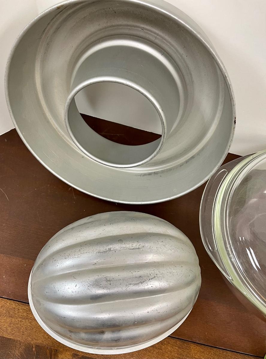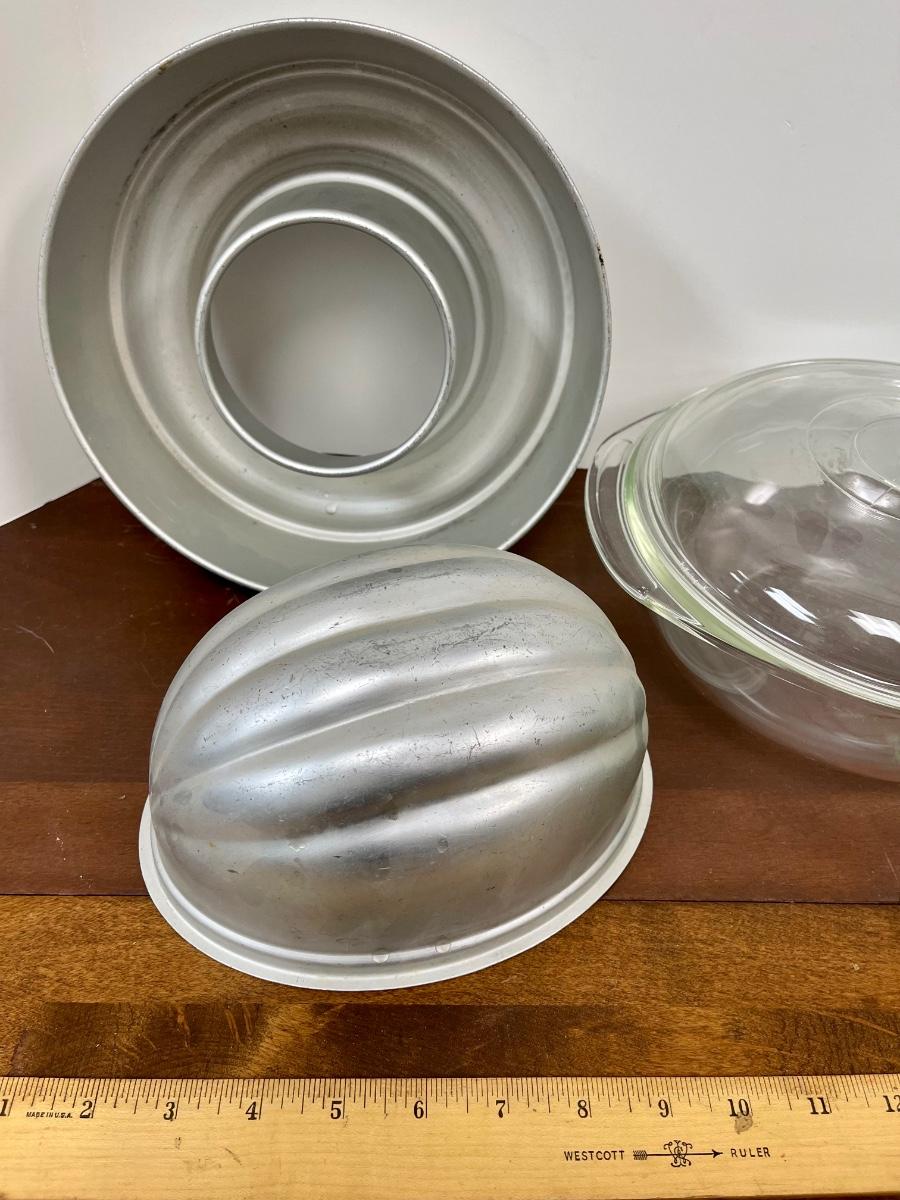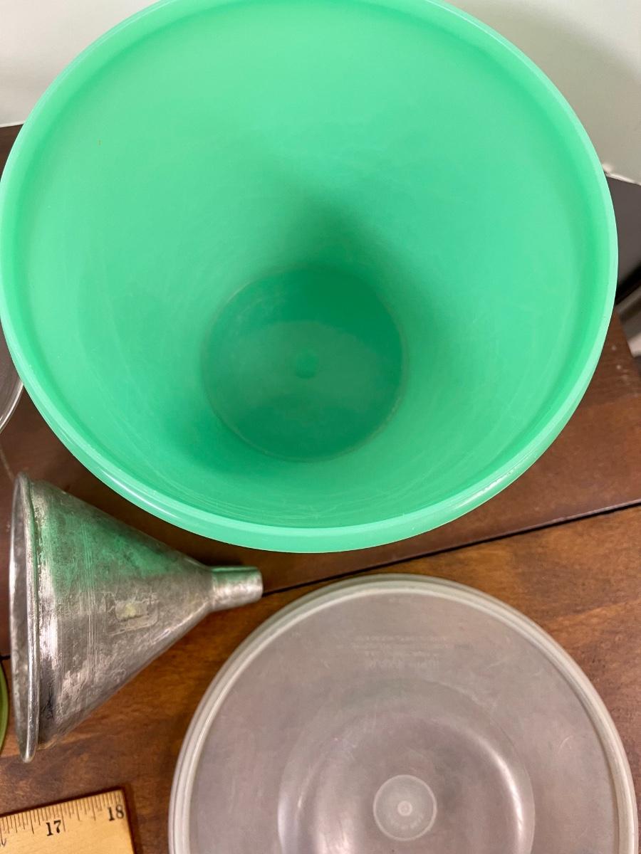 Vintage Kitchen Lot - Pyrex Casserole, Tupperware Lettuce Keeper, Funnels, jello molds