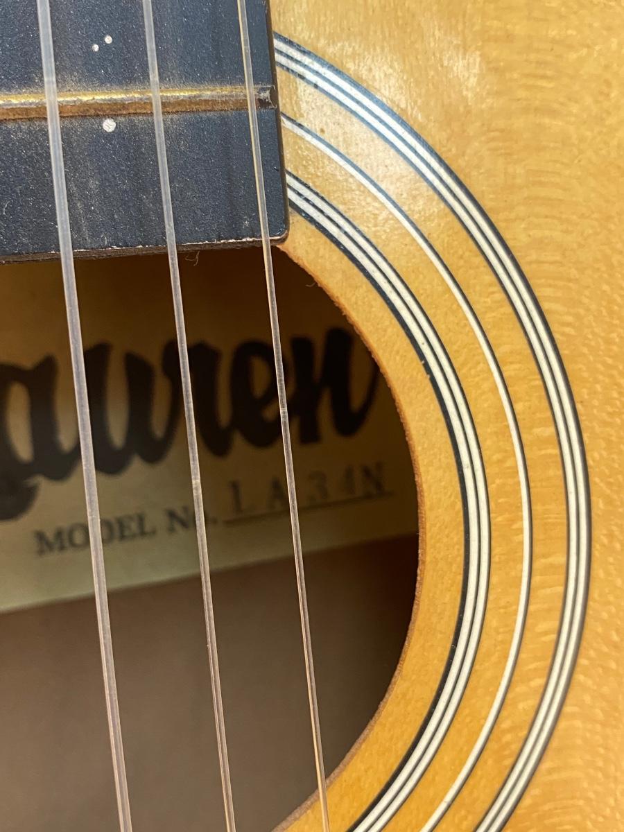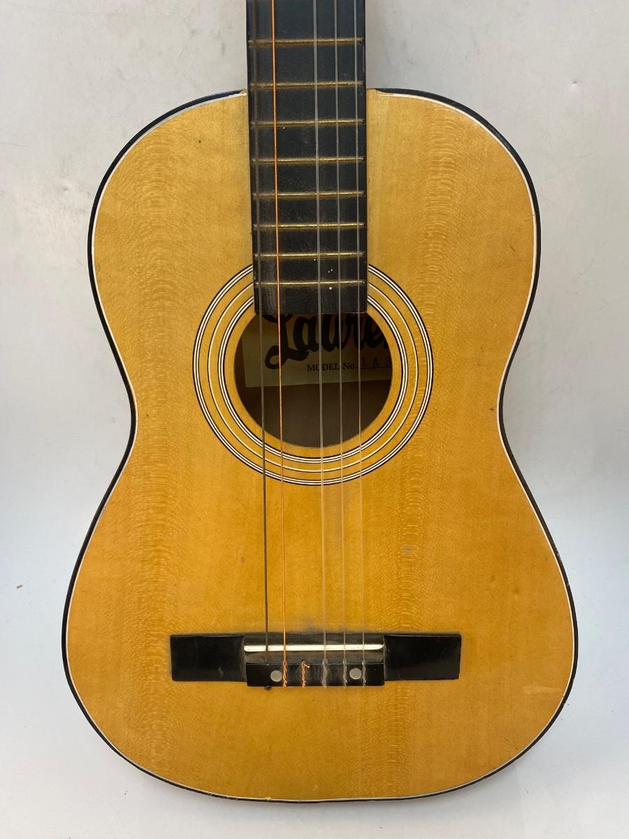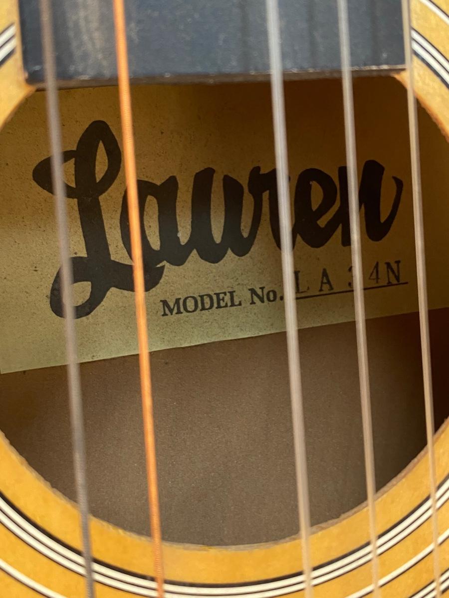 Vintage Lauren Model #LA34N Small Child's Acoustic Guitar. In fair condition. Could use new strings, one missing, and maybe serviced. Seems to be in playable condition, no body or neck damage.