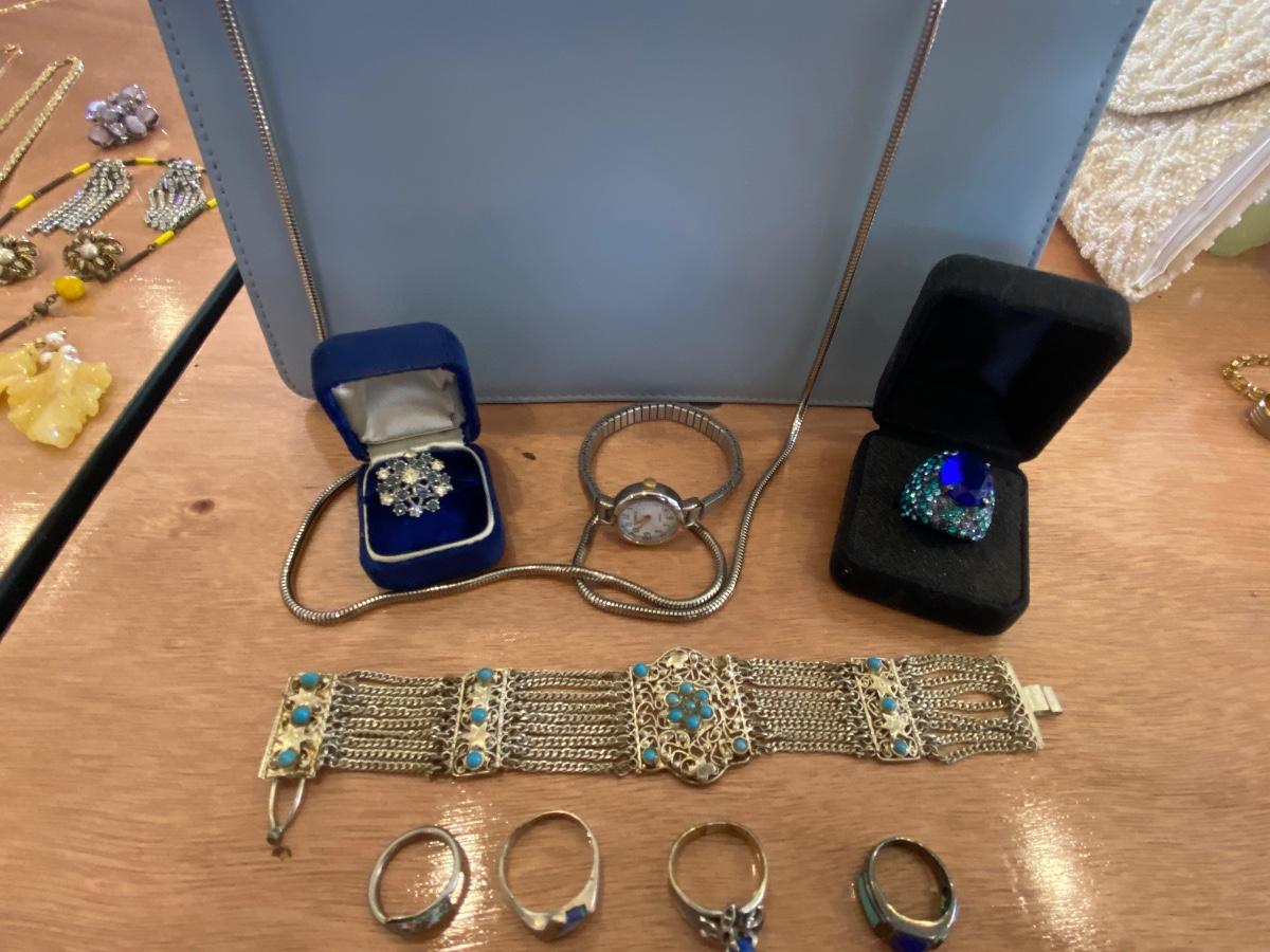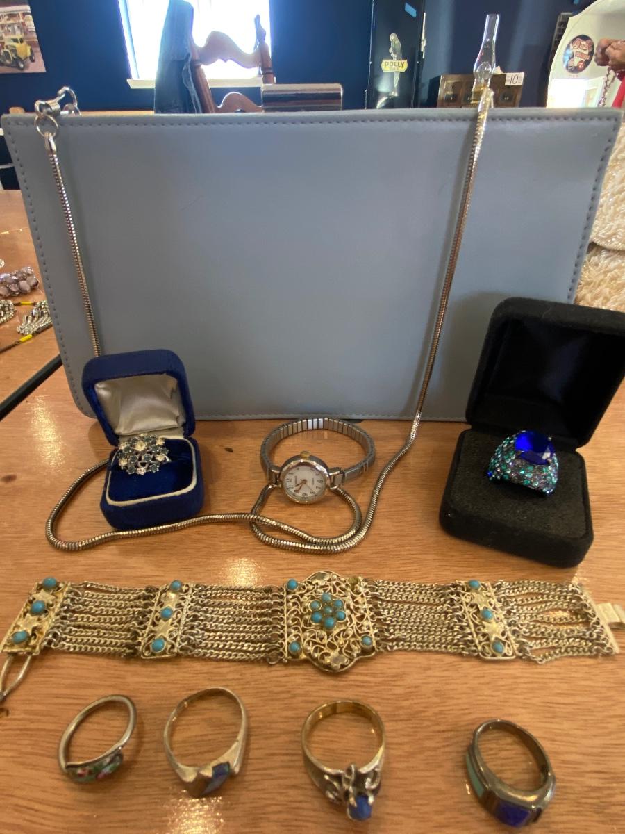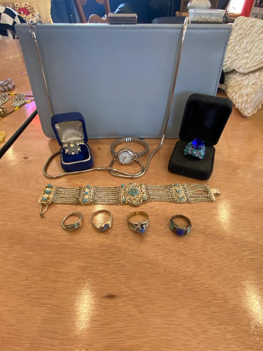 GIANI BERNINI CLUTCH AND SILVER AND BLUE TONE JEWELRY