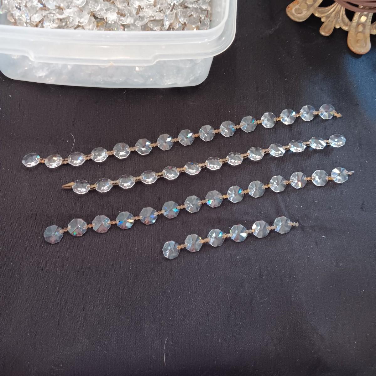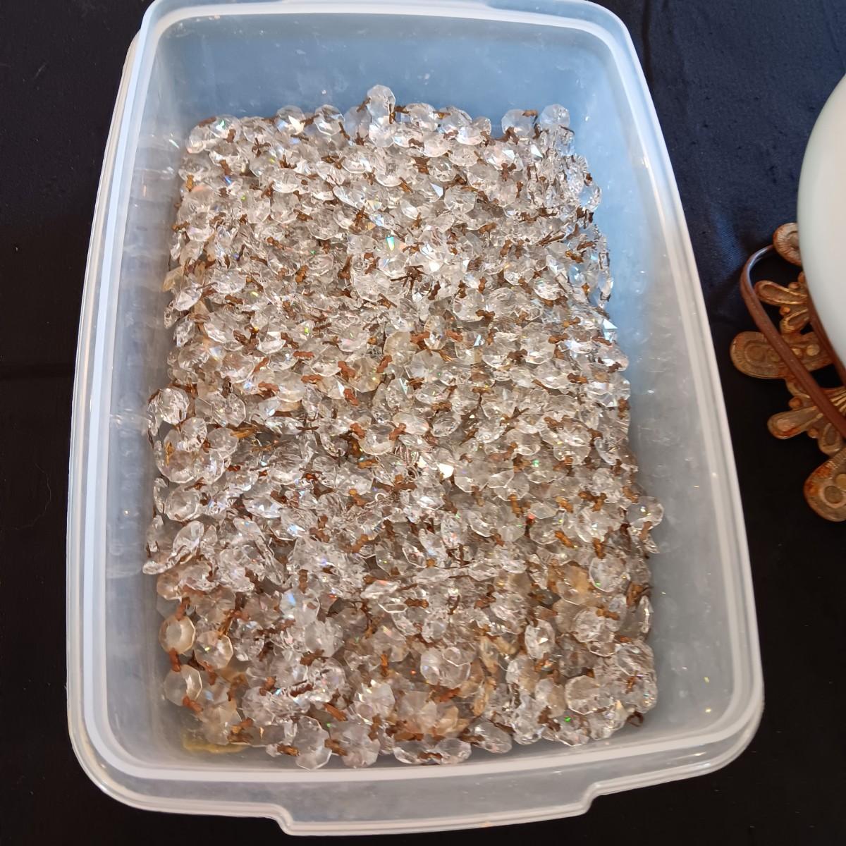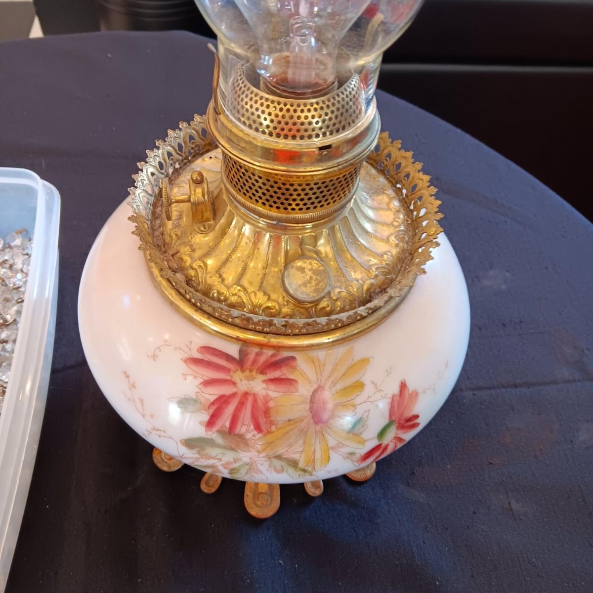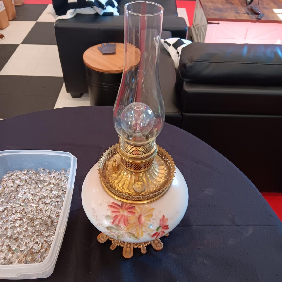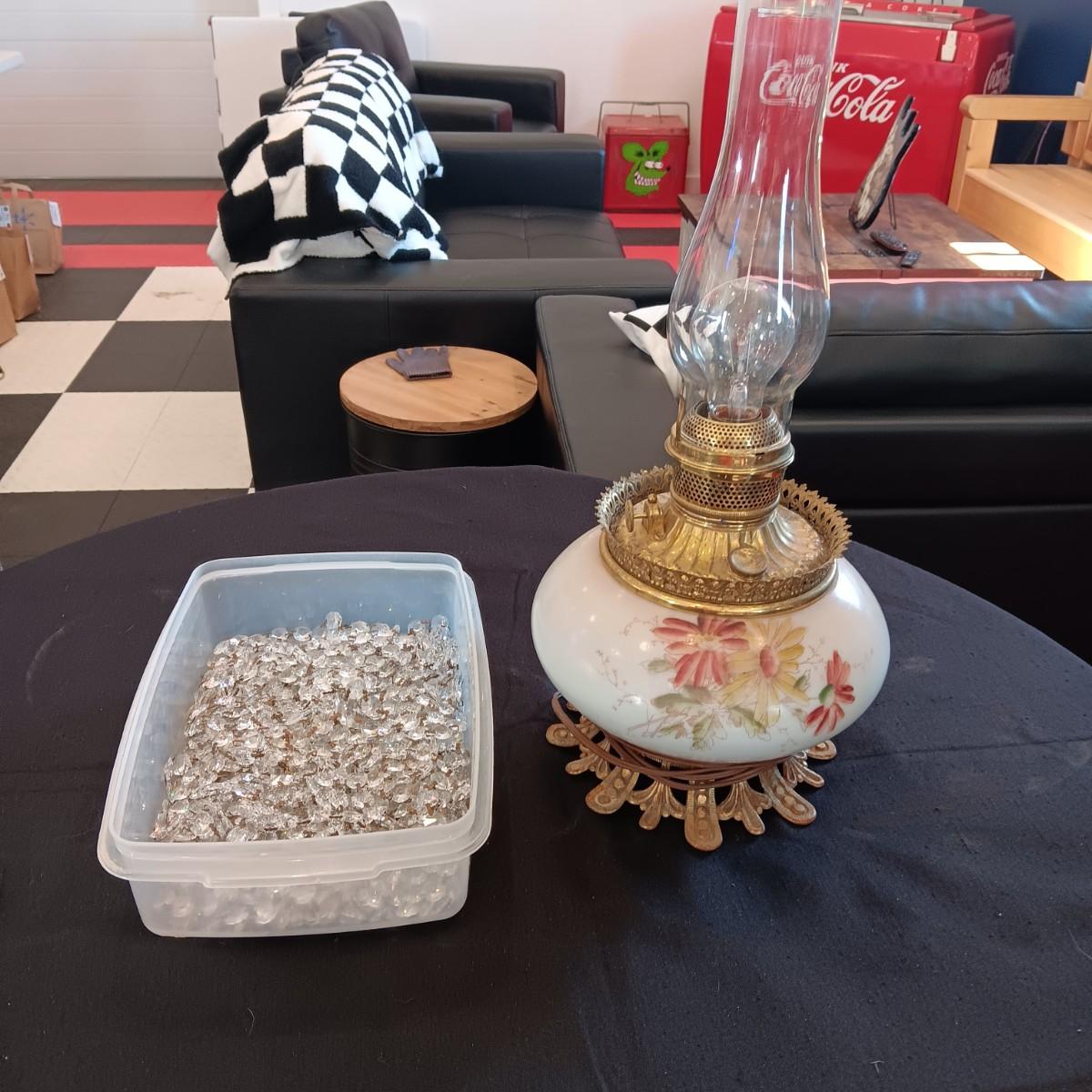 GLASS STRUNG CRYSTALS AND A PARTIAL OIL LAMP CONVERTED TO ELECTRIC