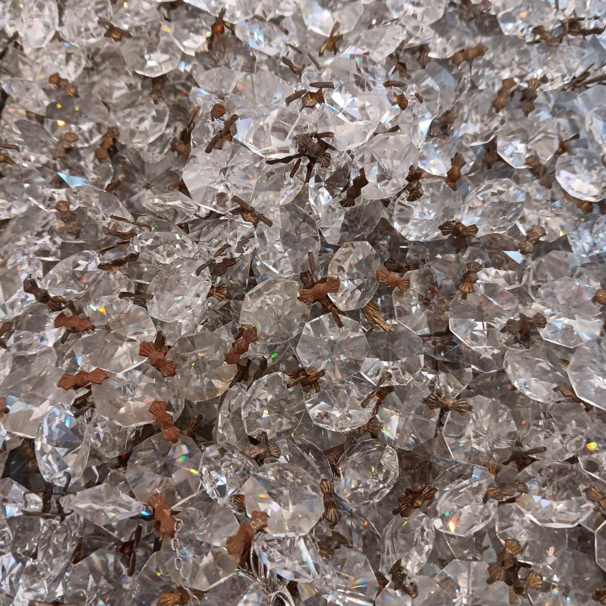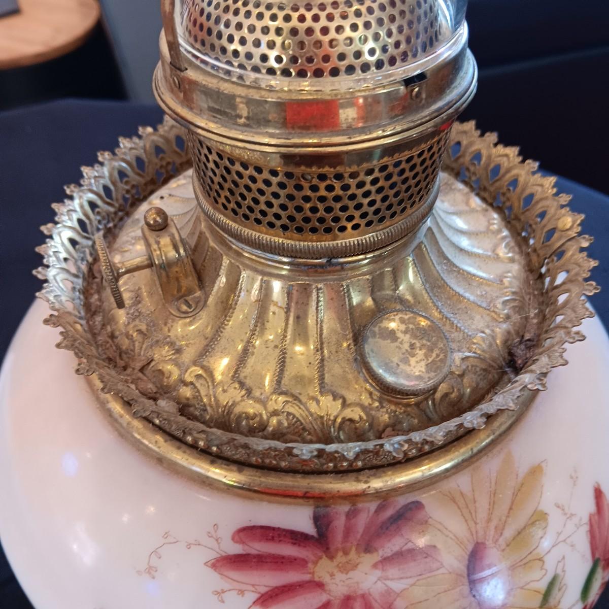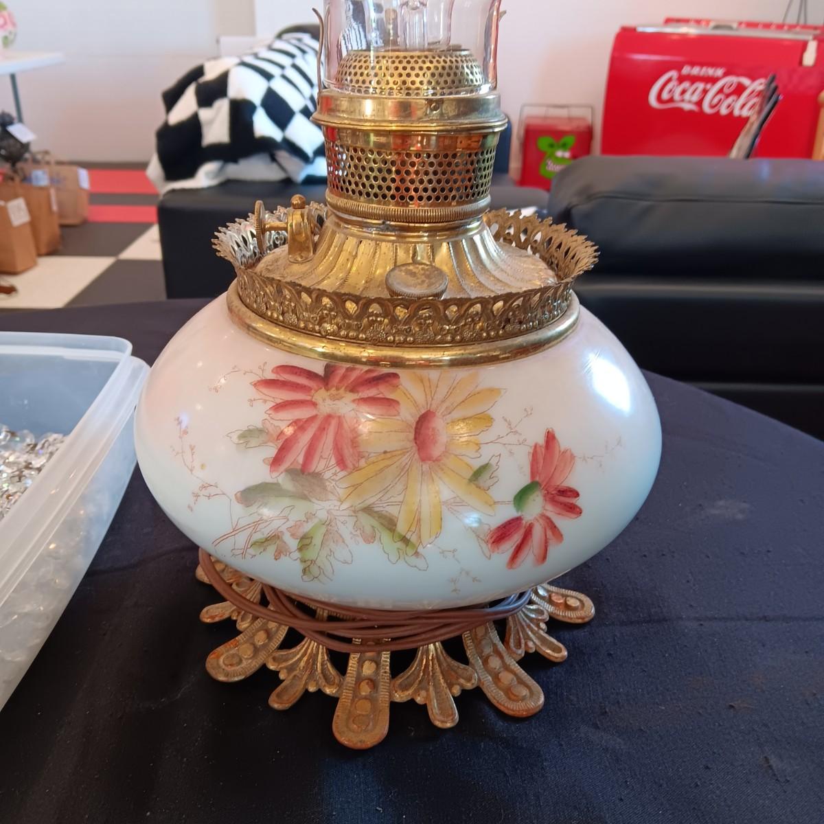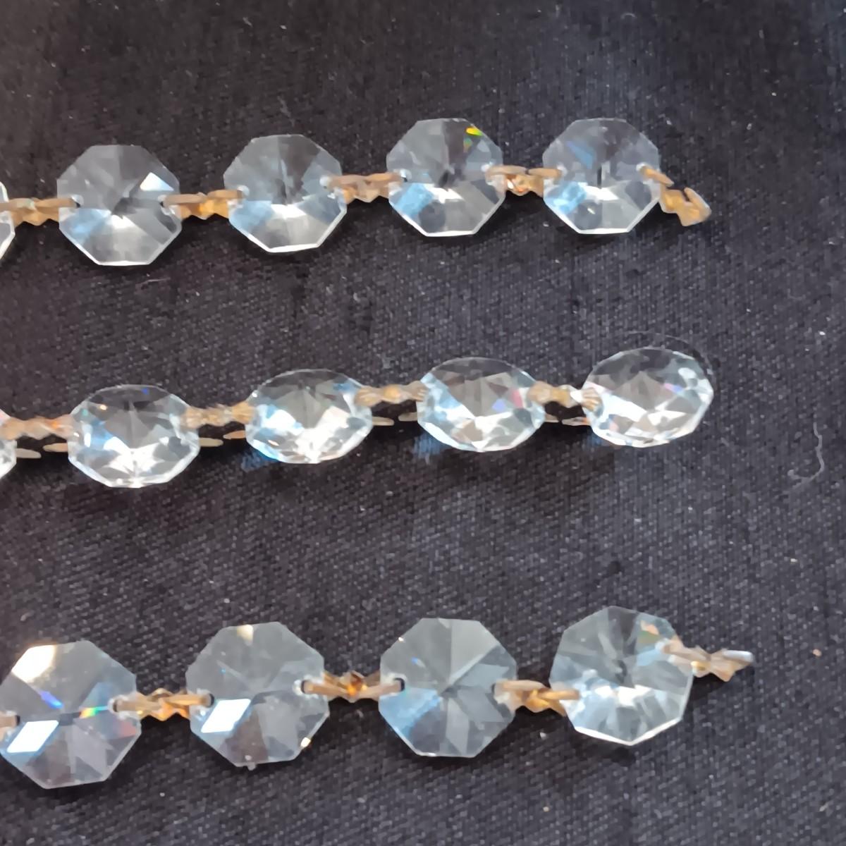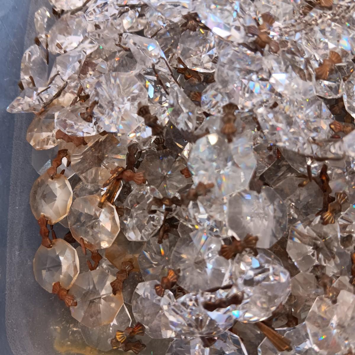 GLASS STRUNG CRYSTALS AND A PARTIAL OIL LAMP CONVERTED TO ELECTRIC