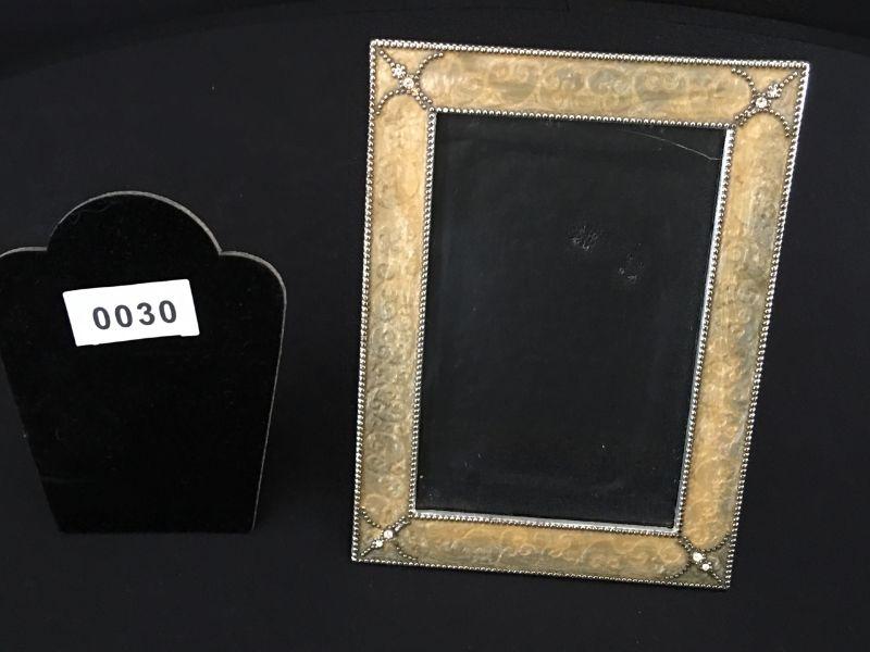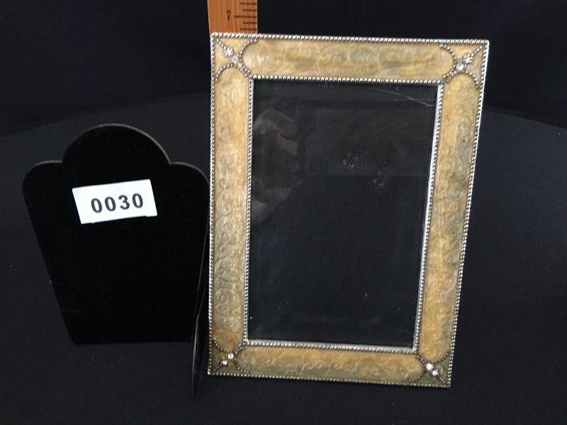 Gold enamel like picture frame with "diamond" crystals for a 4x6 or 5x7 photo. Item #30
