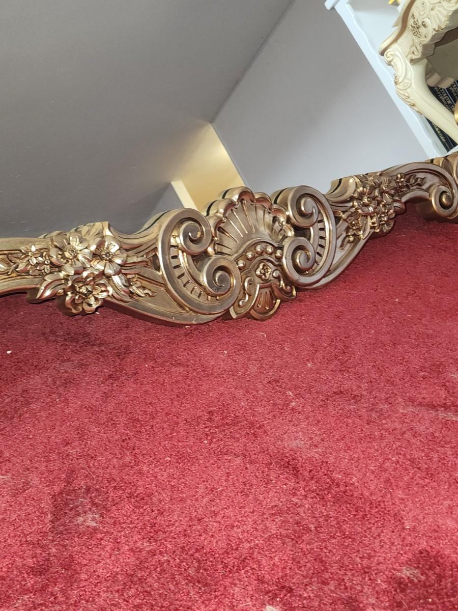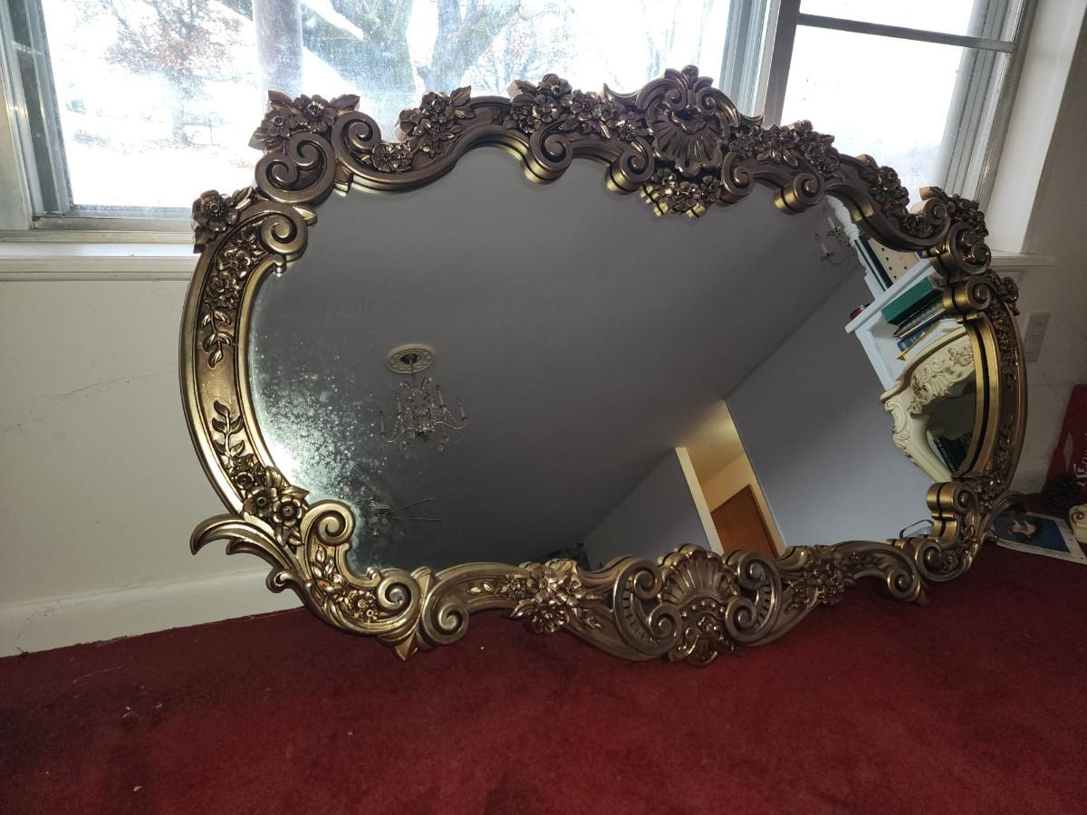 58 by 38 inches. Gold framed resin mirror. We have two available so you are not seeing double.