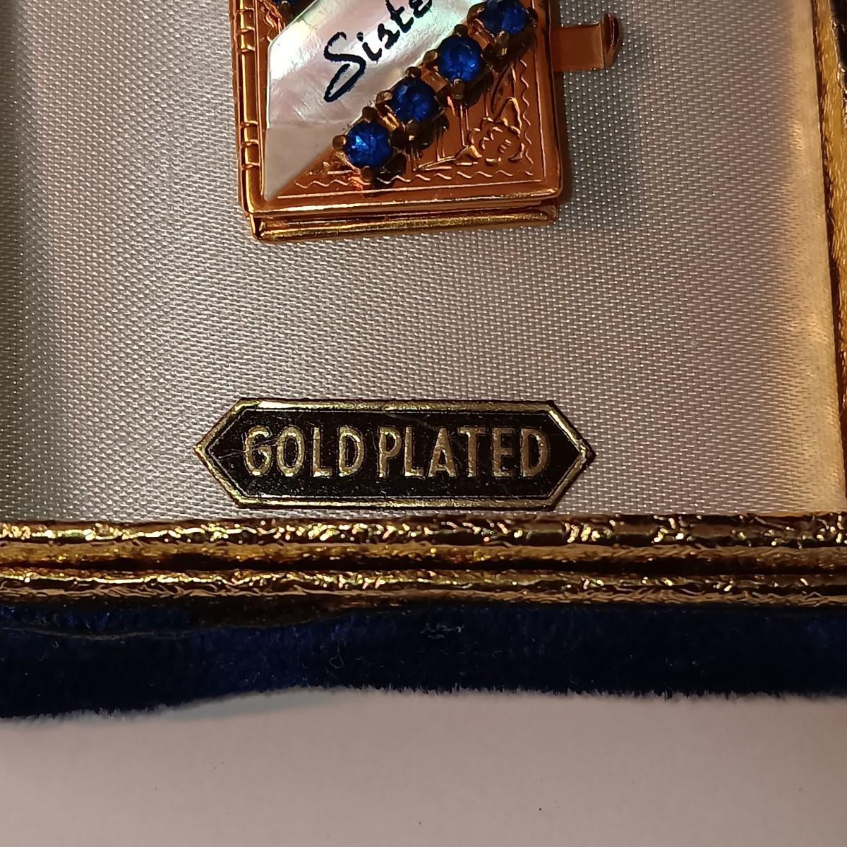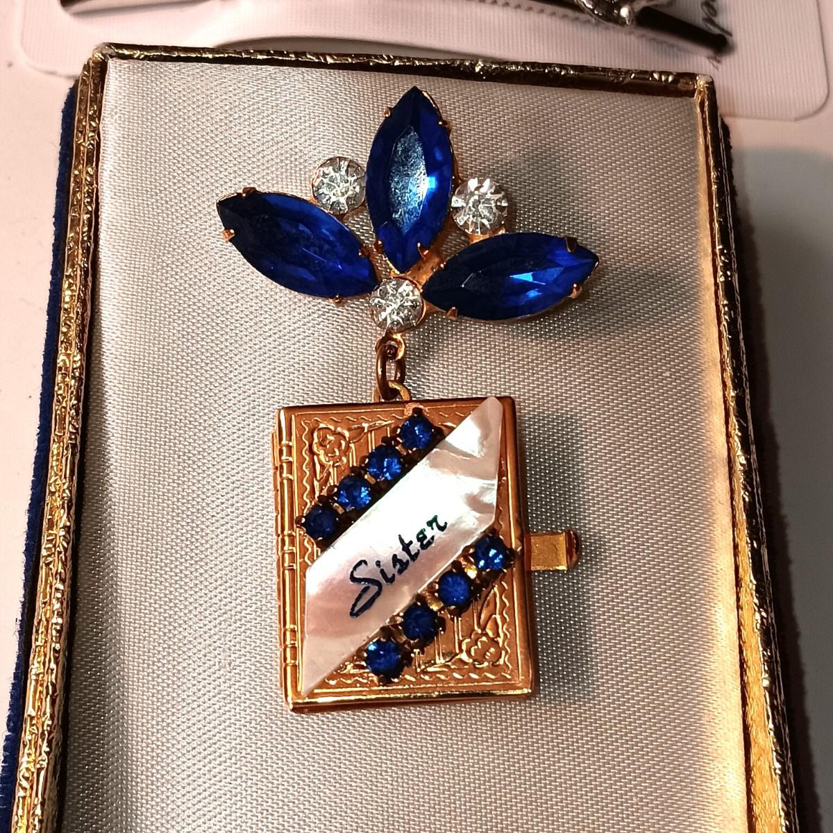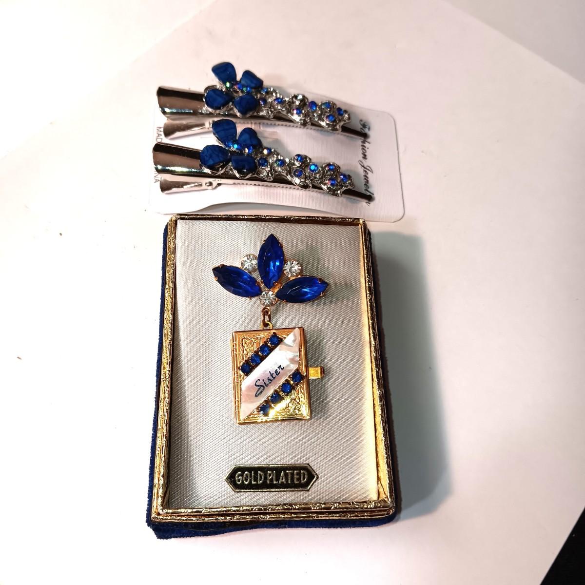 GOLD PLATED "SISTER" LOCKET BROOCH WITH BLUE STONES AND 2 NEW HAIR CLIPS