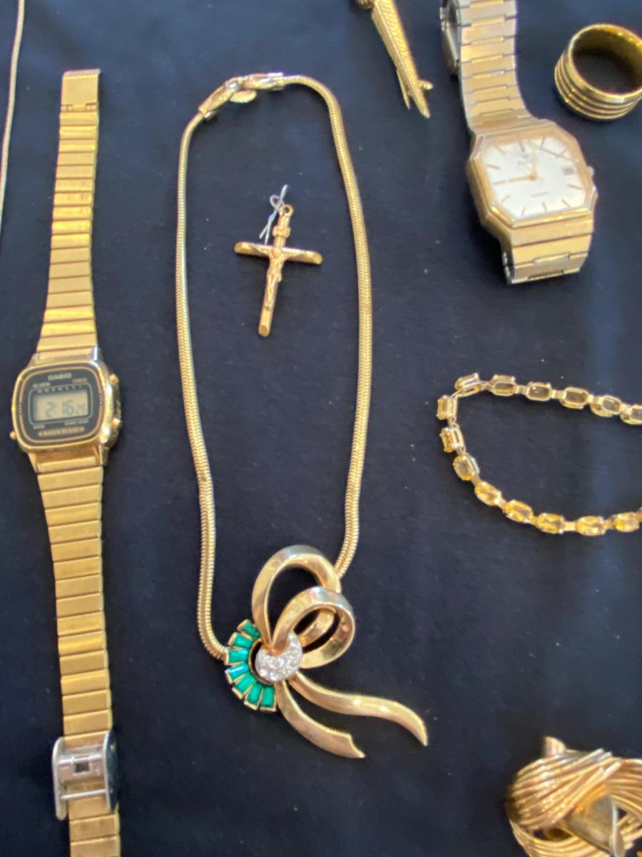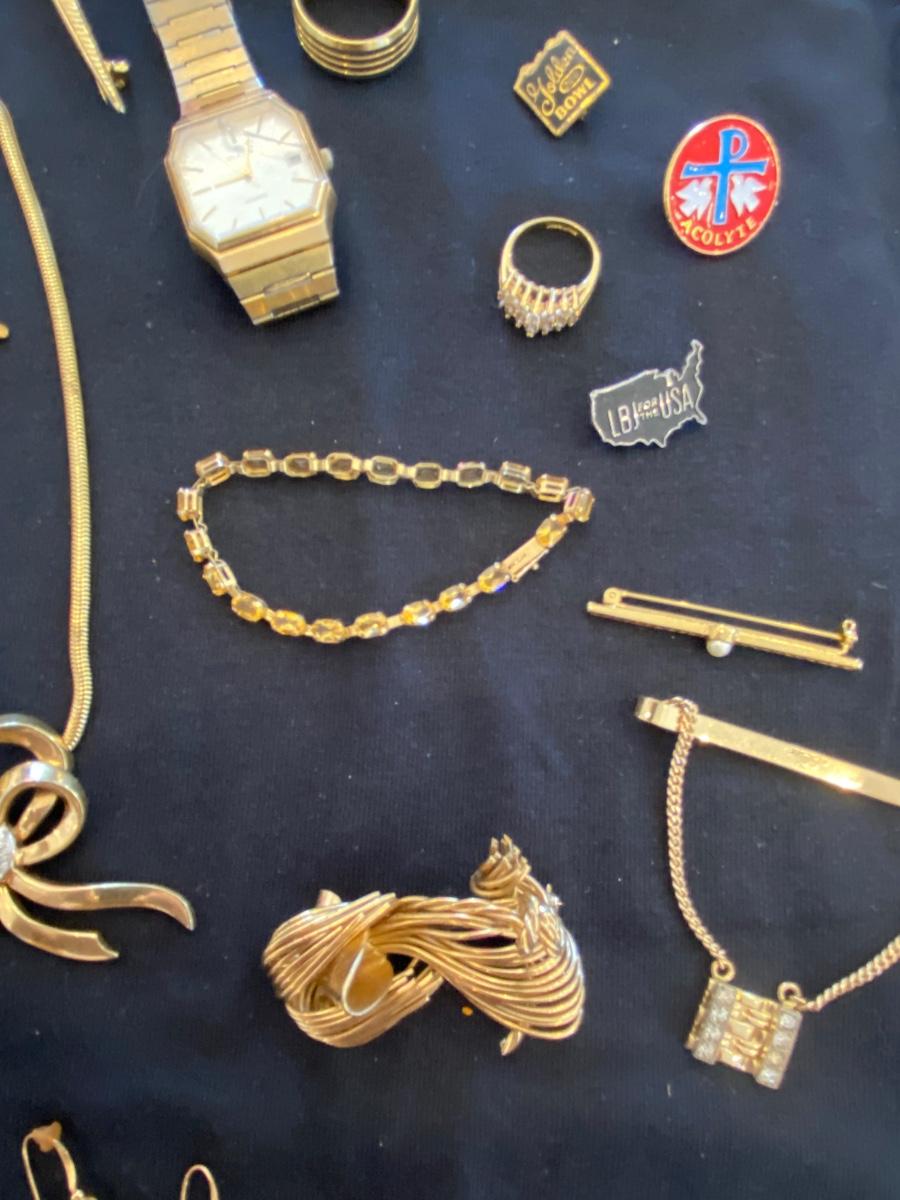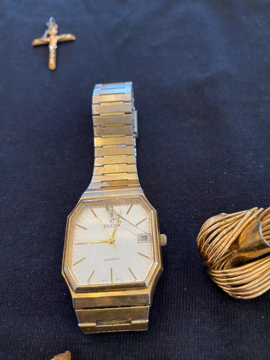GOLD TONE COSTUME JEWELRY, AND MEN’S ELGIN WATCH.