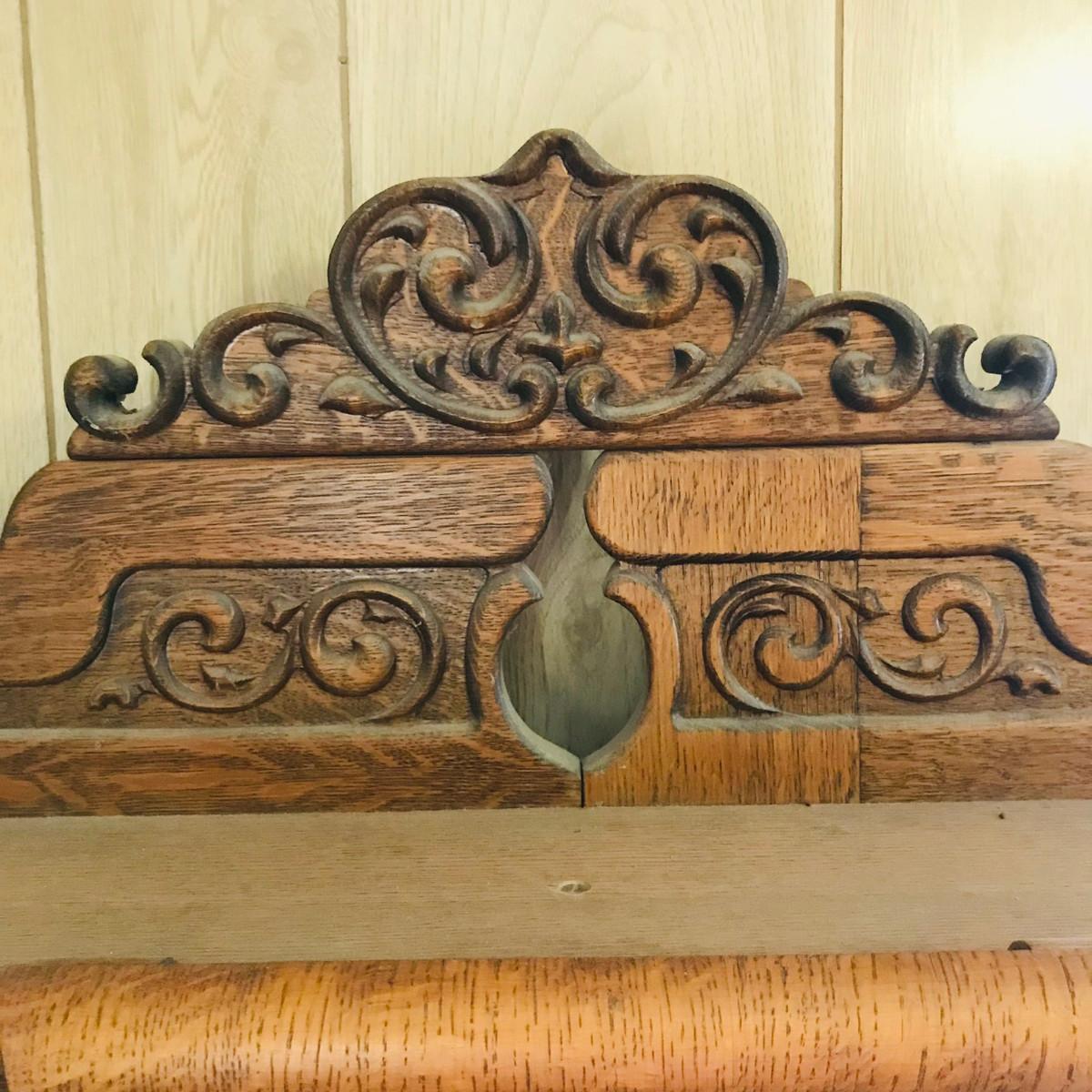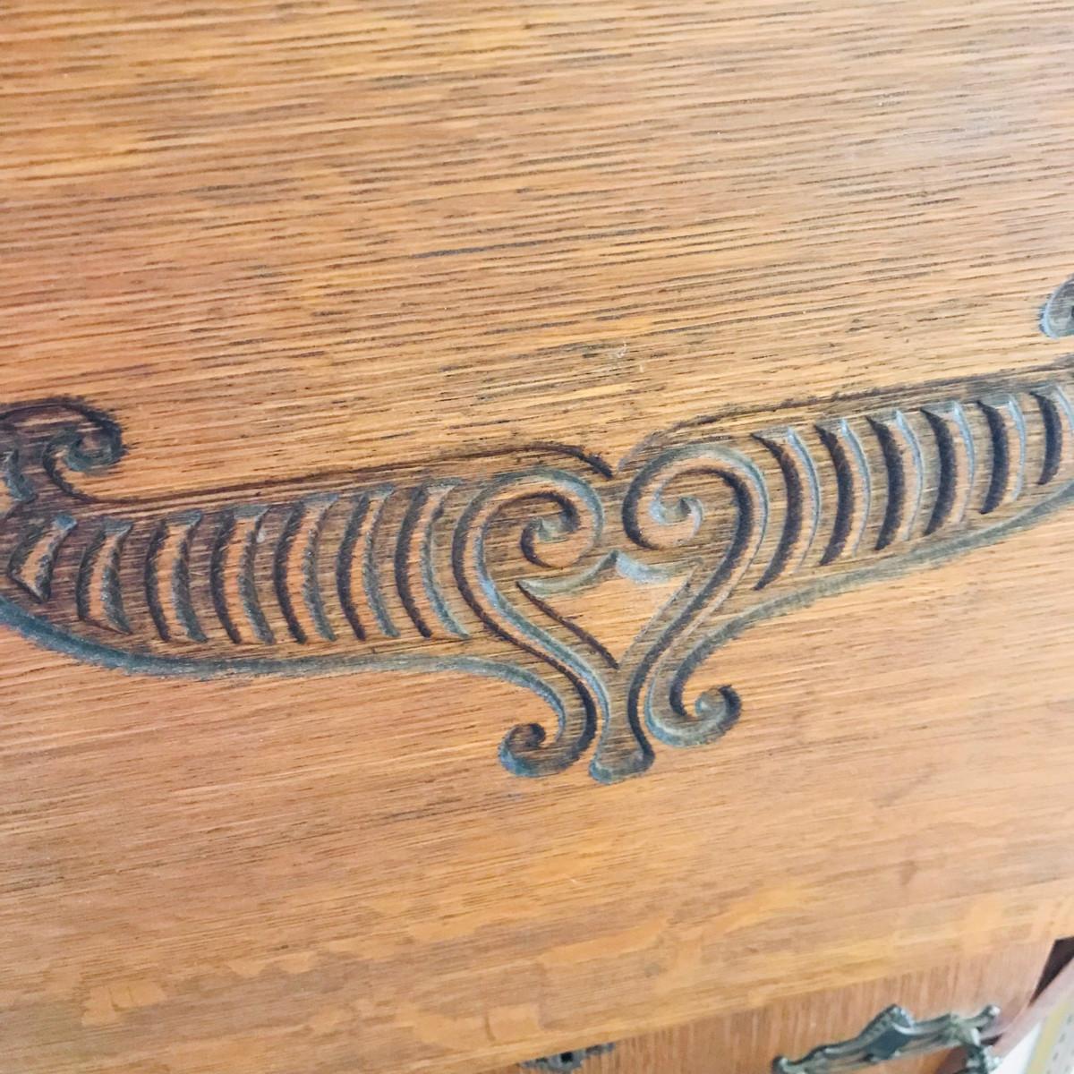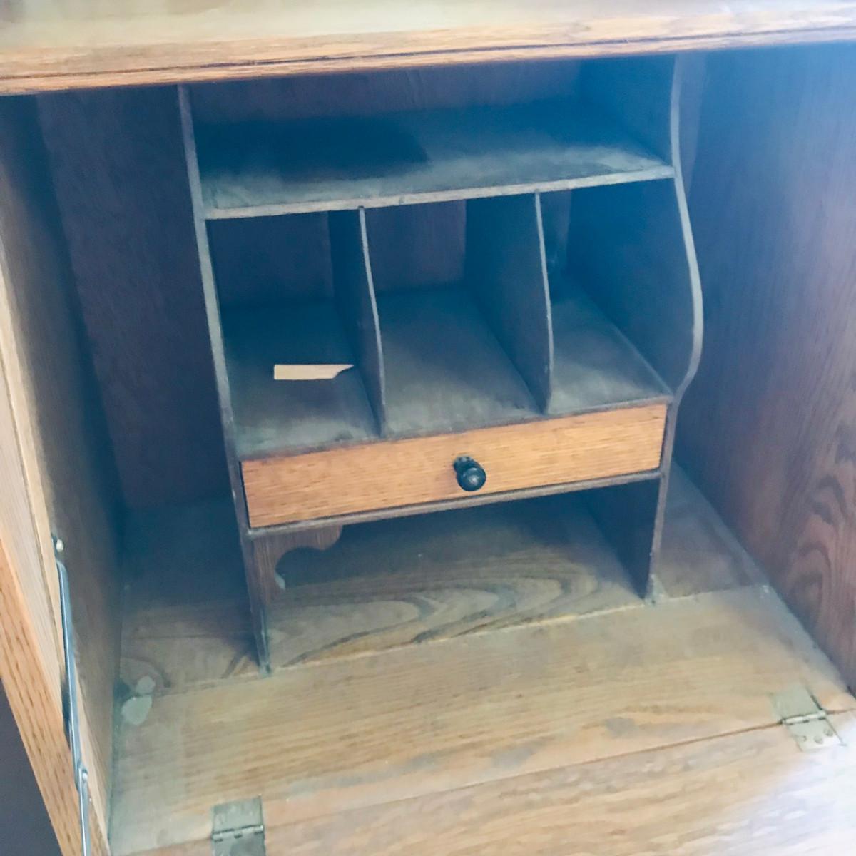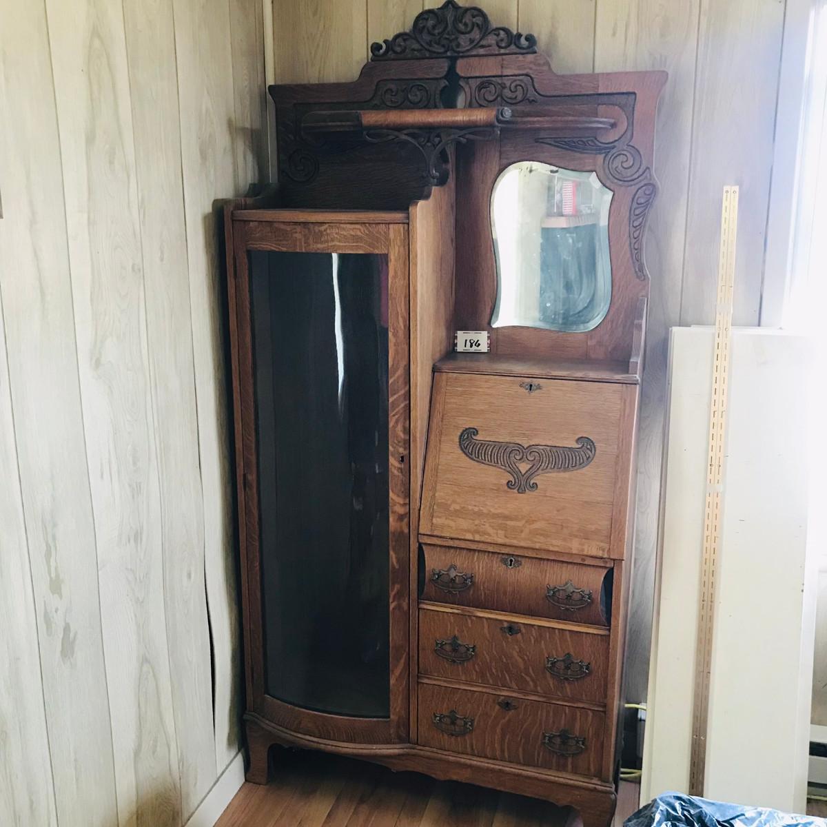 This is a fabulous piece, lots of gingerbread design! Have the KEY!! The shelves are on the bottom. Complete, the handle for the book case is not attached but there!
