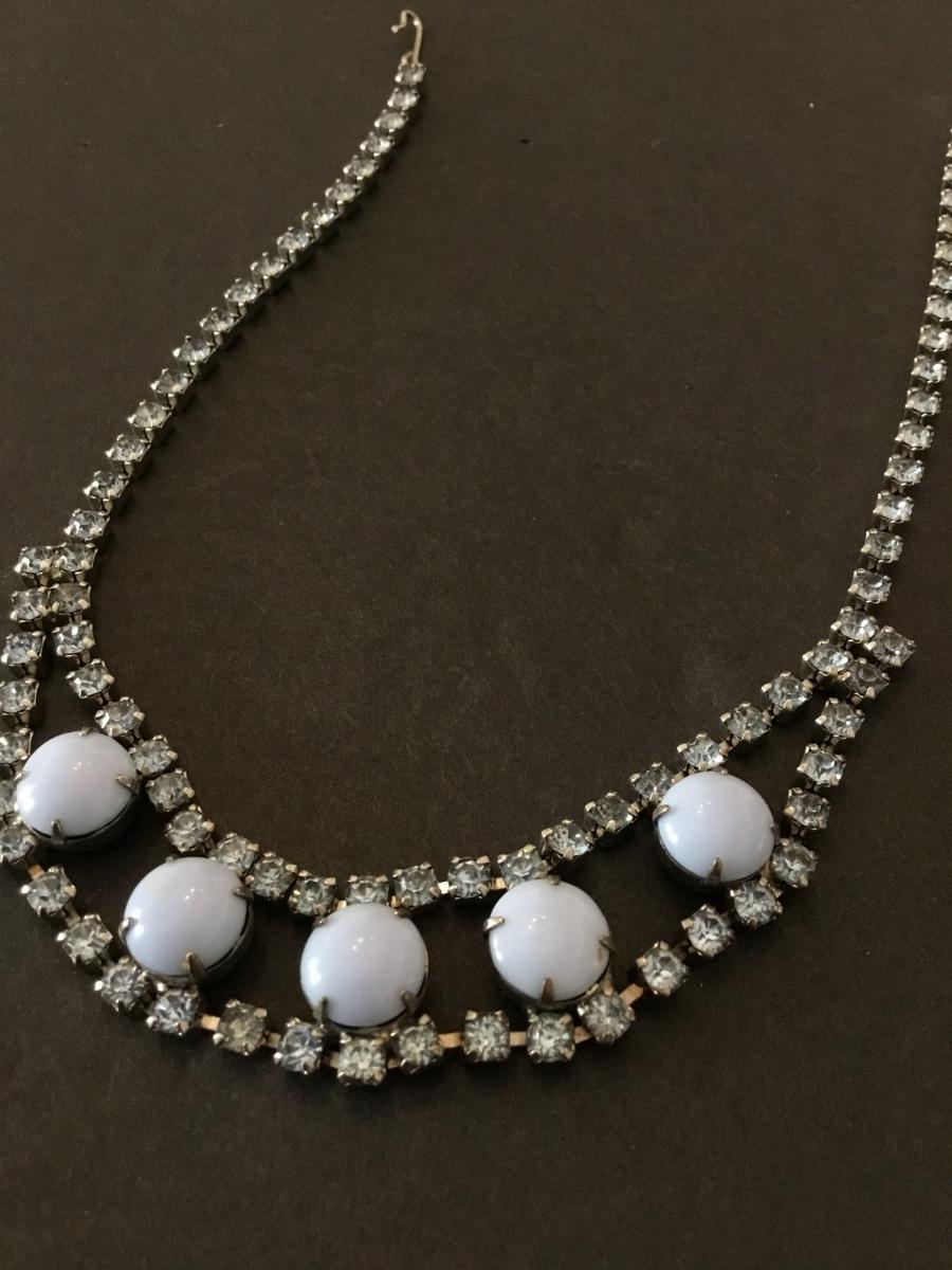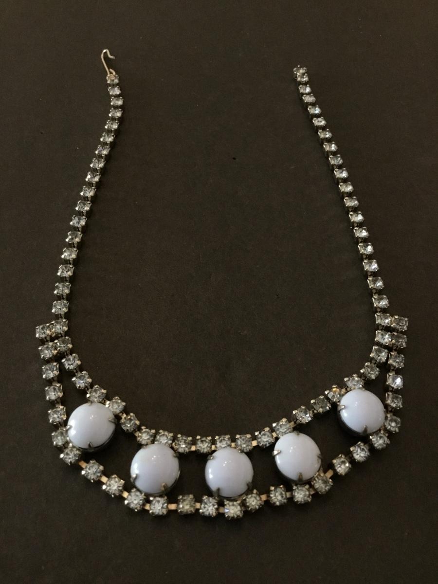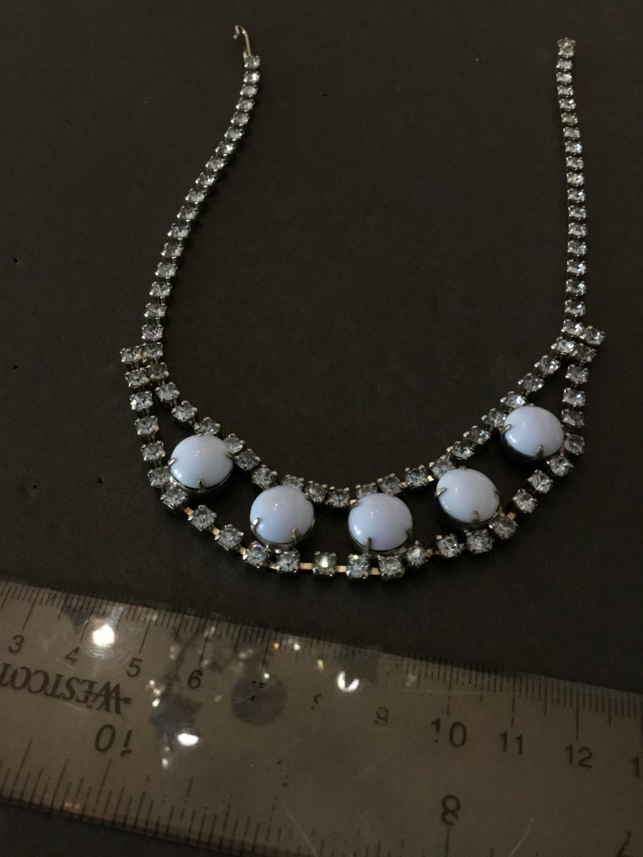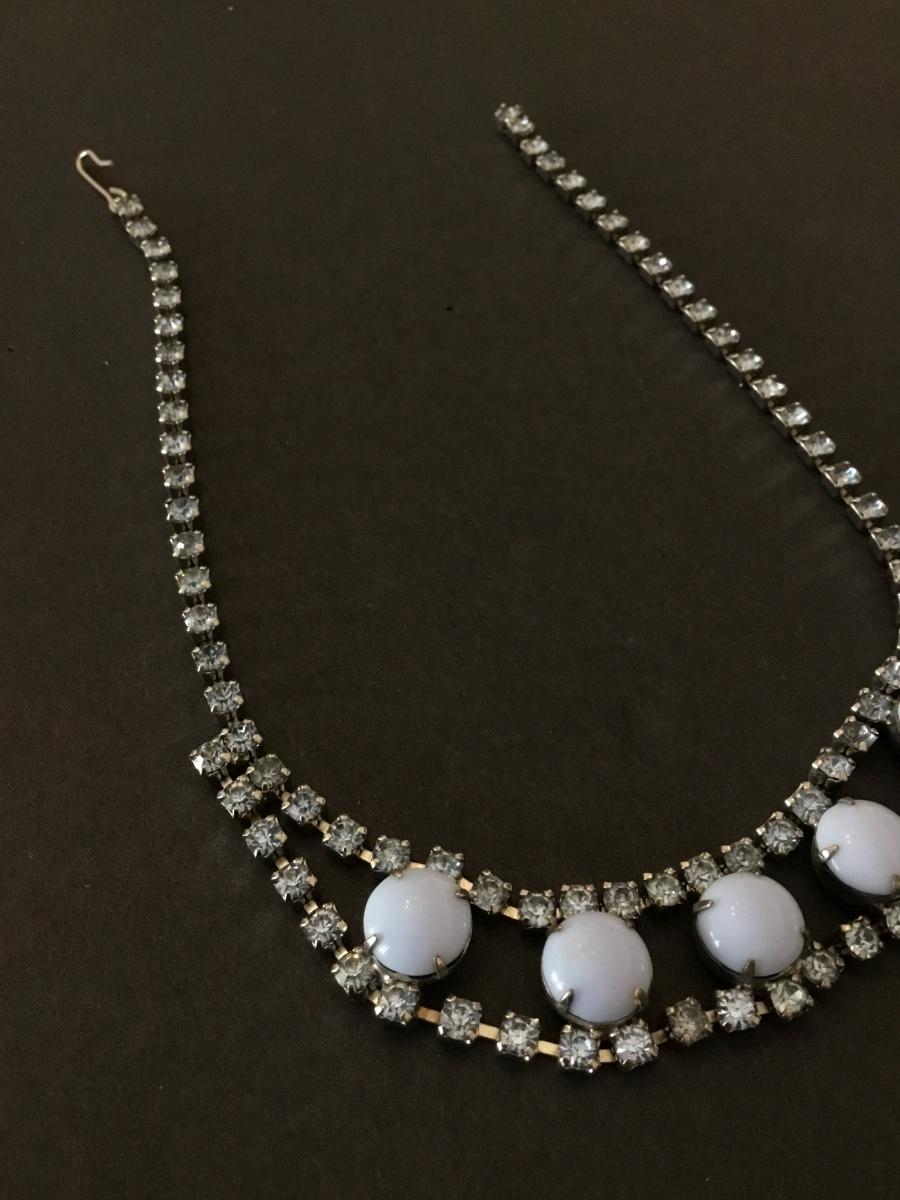 Gorgeous, art deco, blue, crystal rhinestone, blue milk, glass choker necklace