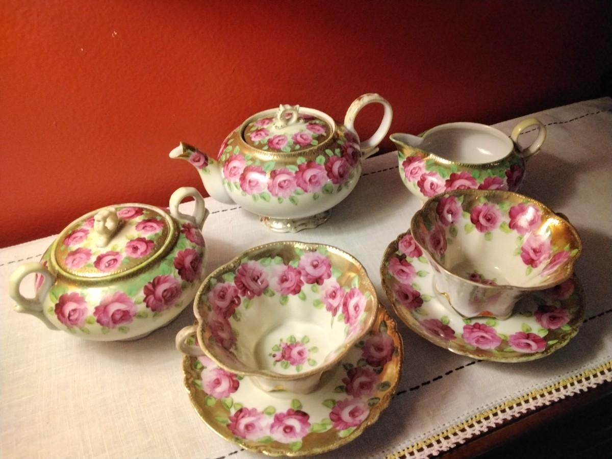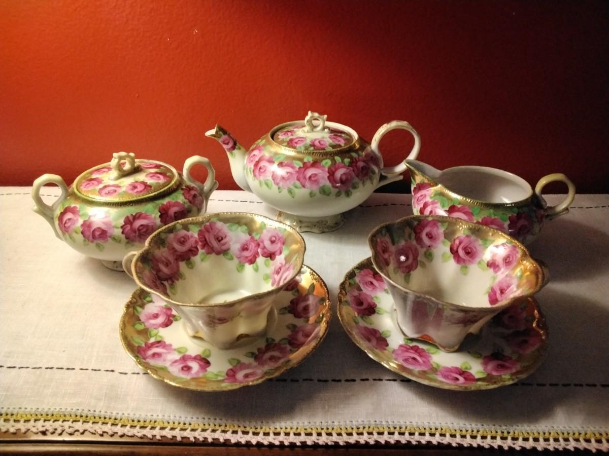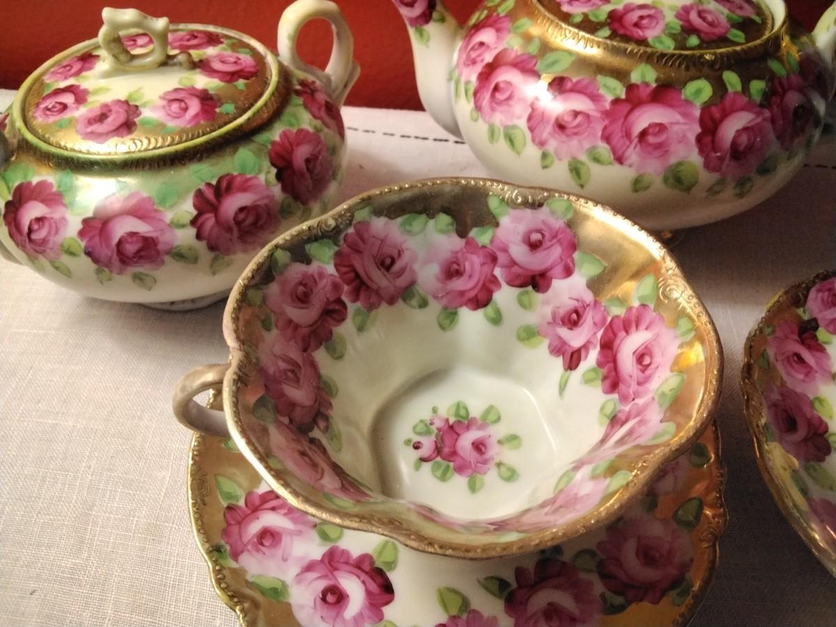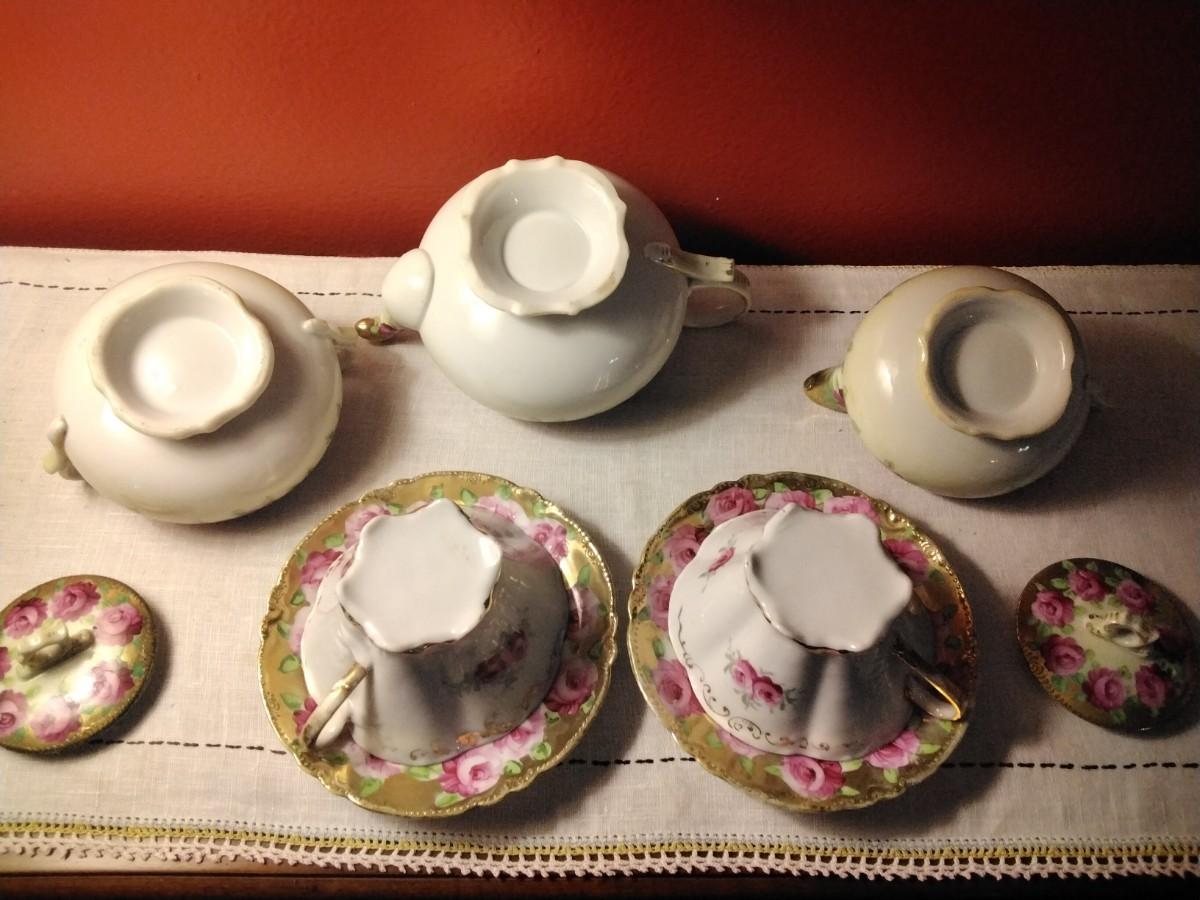 Over 100 years old this tea set is some of the finest, thinnest bone china you can find! It's in perfect condition! You can see just the tiniest drip in one cup of gold paint and the brush mark trying to pick it up. This set is just breathtaking!
