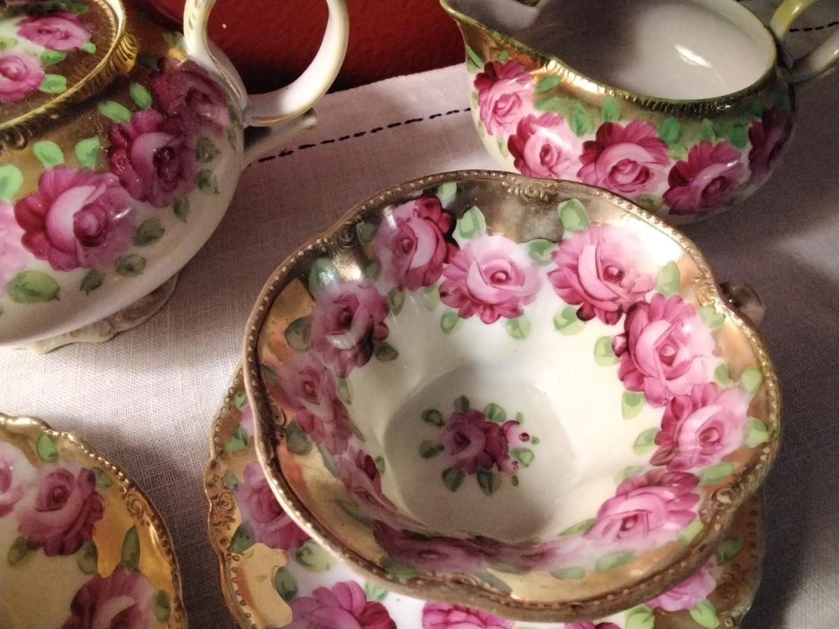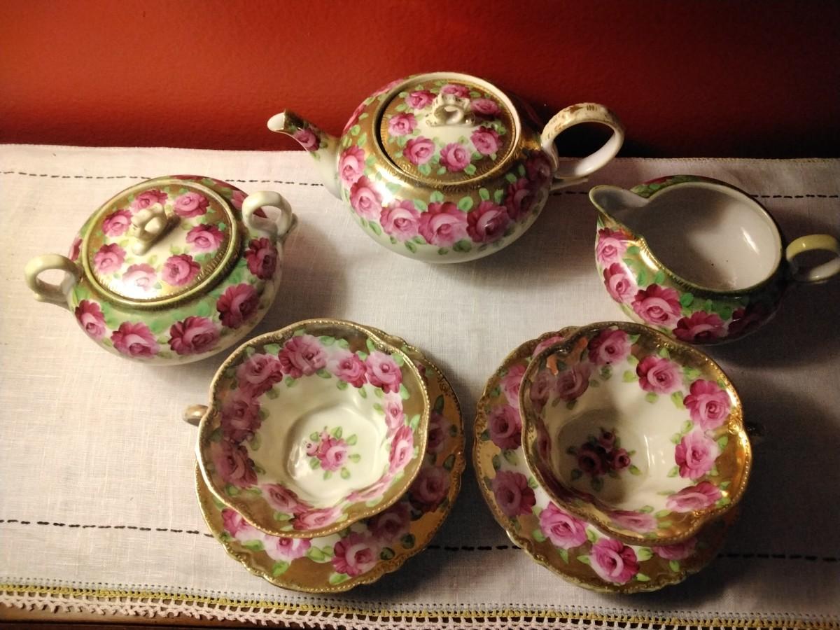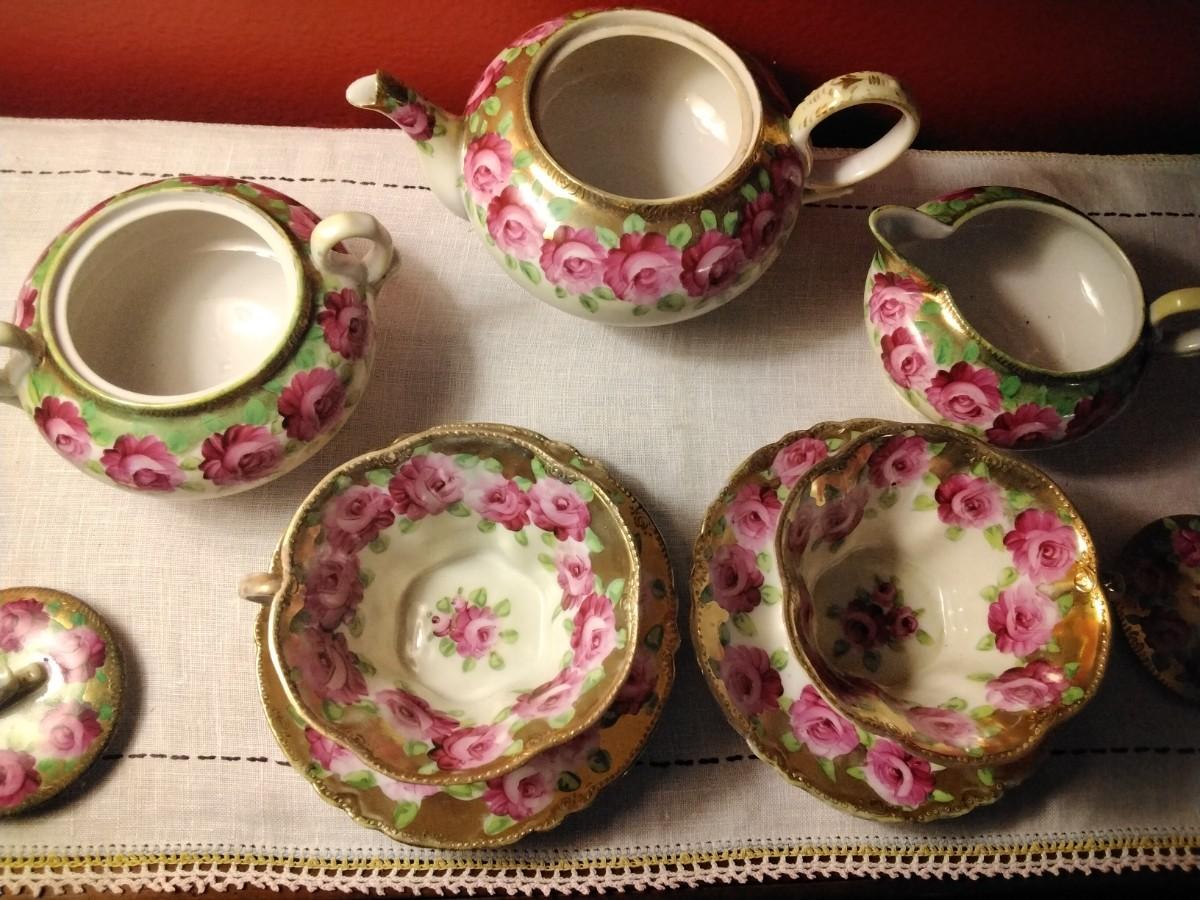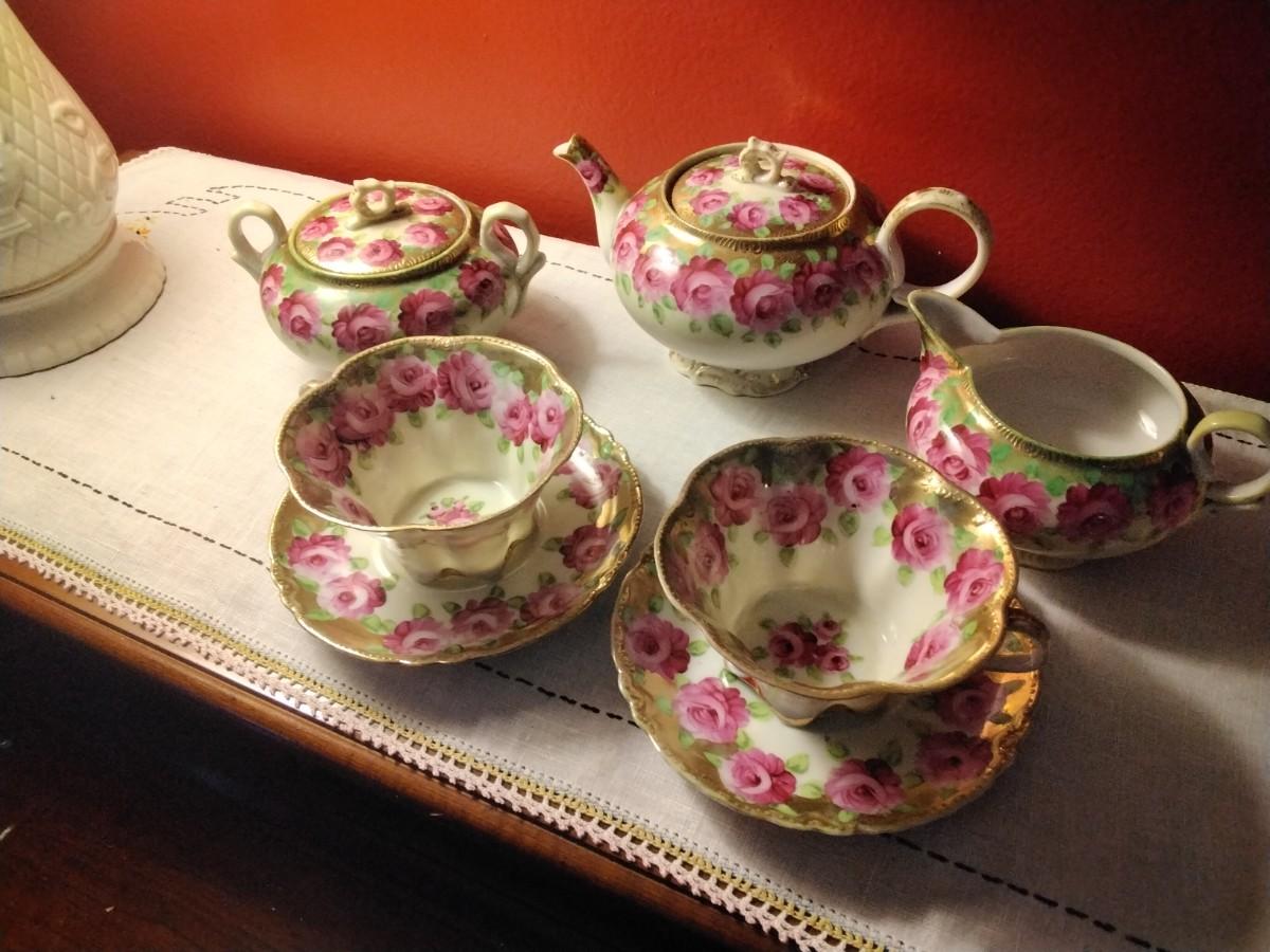 Over 100 years old this tea set is some of the finest, thinnest bone china you can find! It's in perfect condition! You can see just the tiniest drip in one cup of gold paint and the brush mark trying to pick it up. This set is just breathtaking!