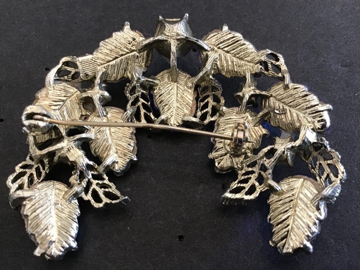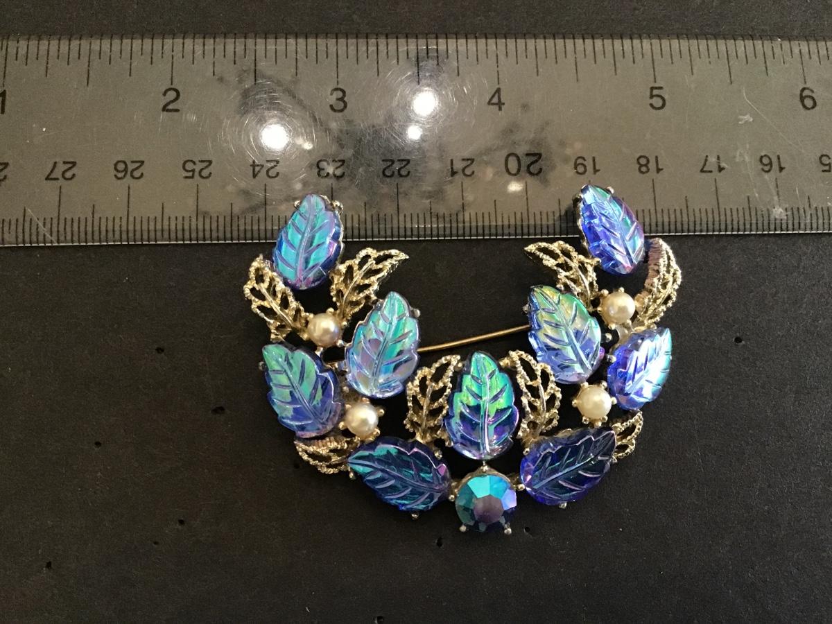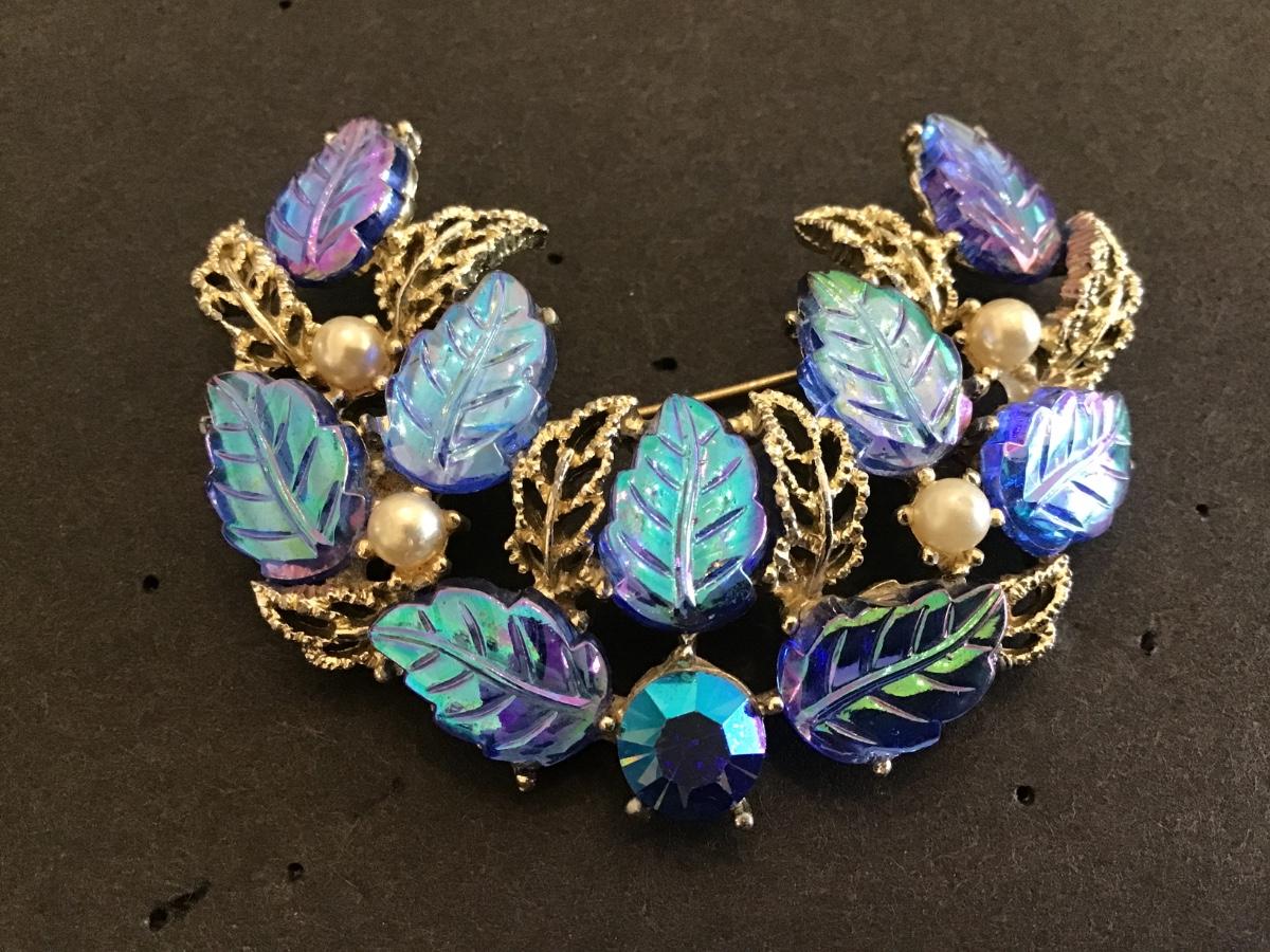 Gorgeous Molded Glass Leafs Blue Iredescent Pearl accents Vintage Brooch