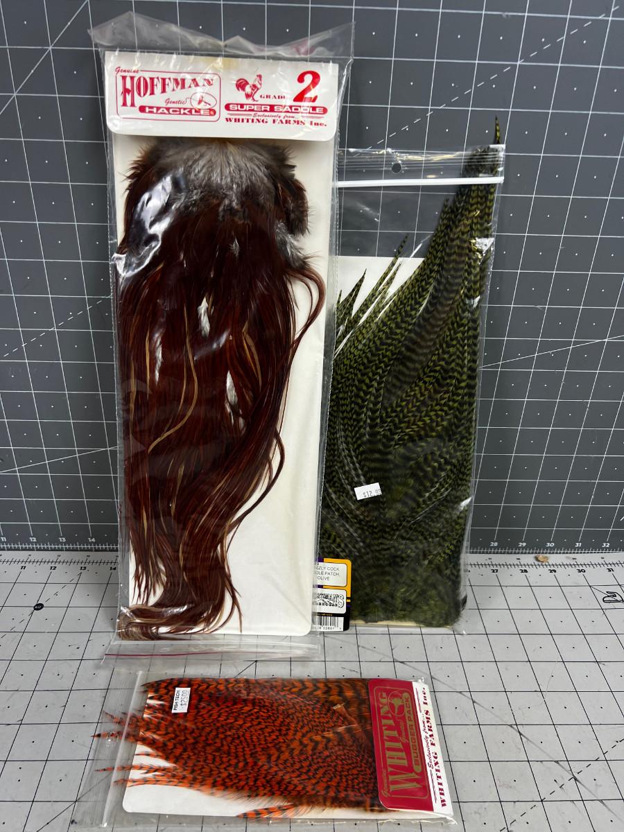 Nice Expense (One package is marked $27.00) Collection of 3 Kinds of Hackle Feather Capes. For Fly Tie making. Perfect time to start a new hobby. Or whatever else you do with feathers; earrings of something?