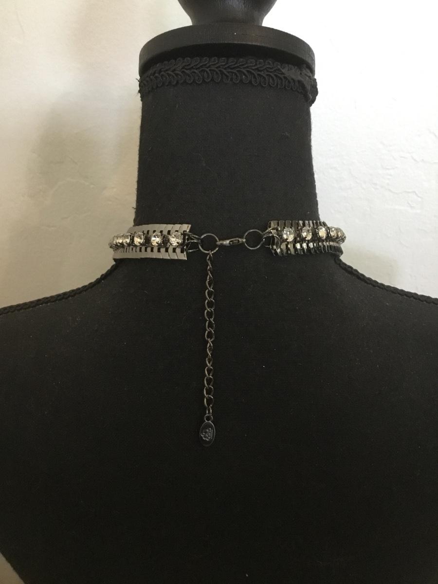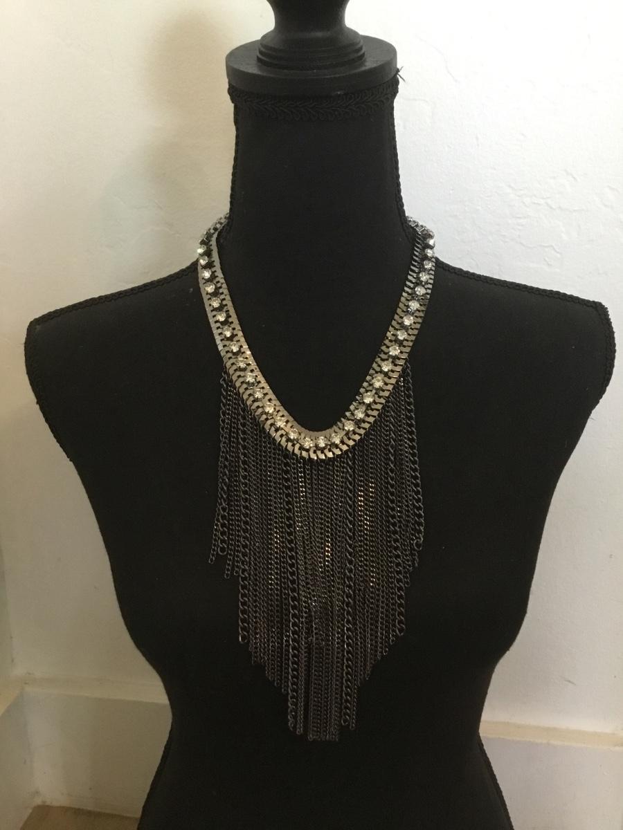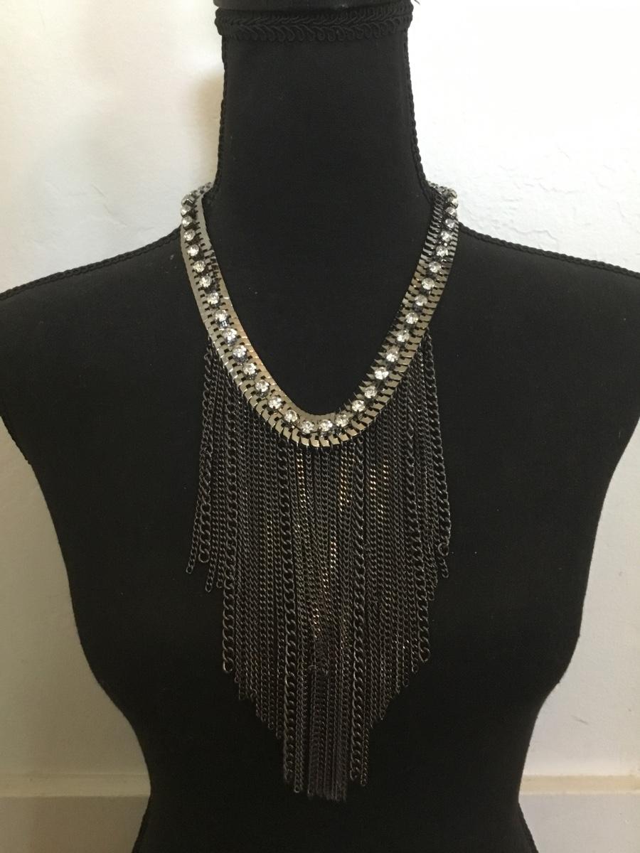 Gunmetal, gray rhinestone, tassel statement, necklace