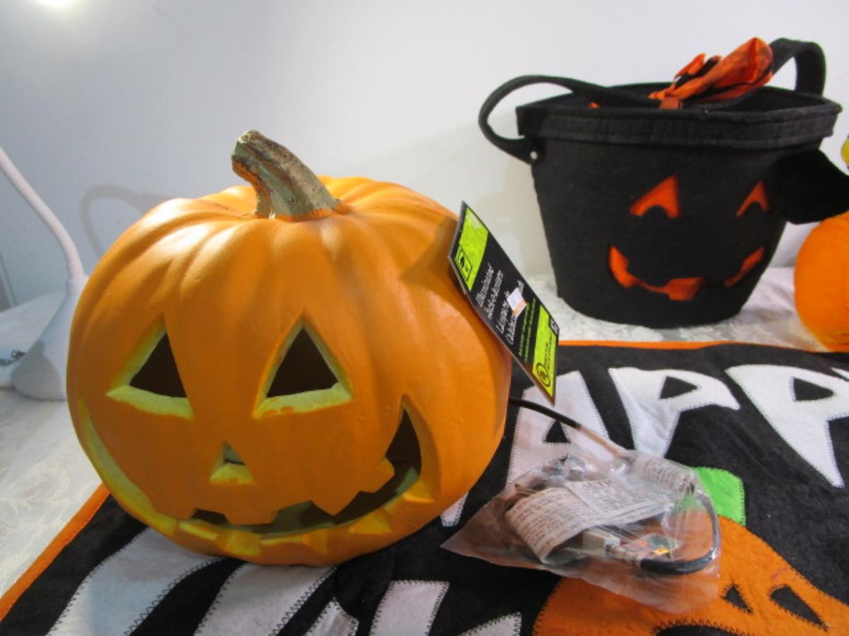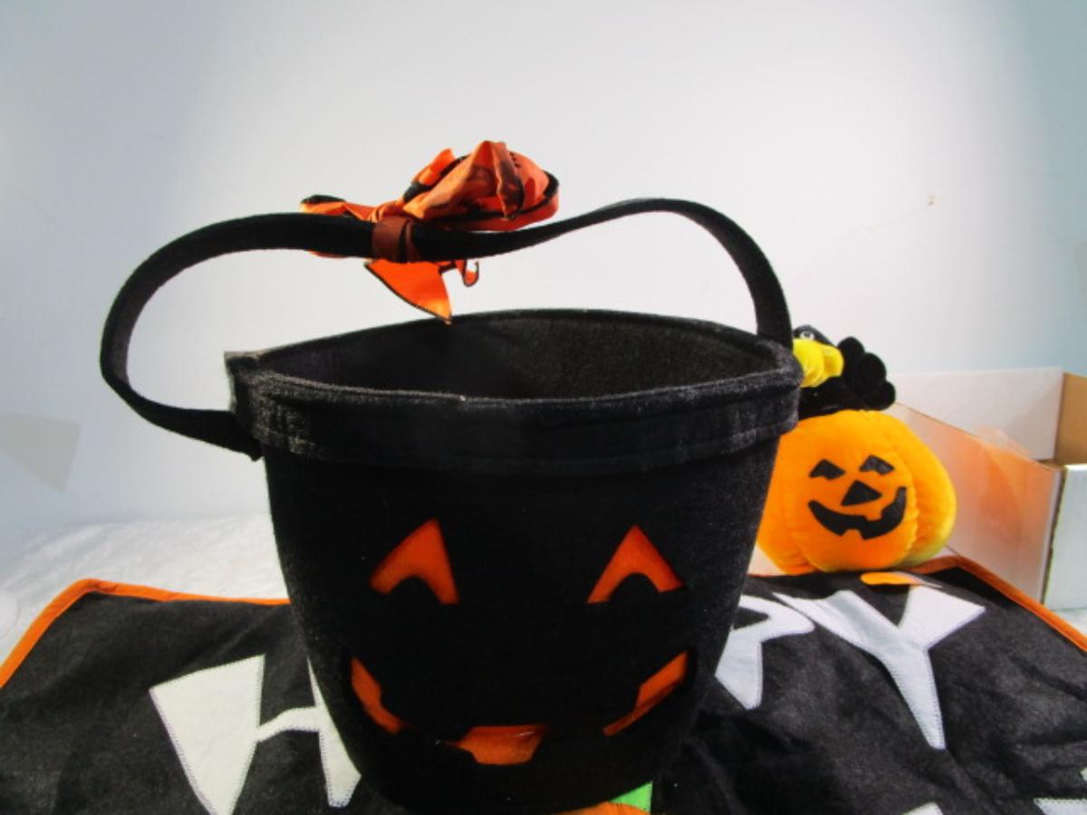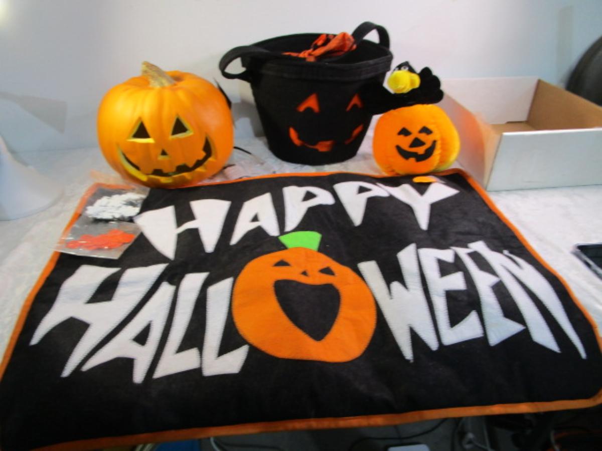 Happy Halloween doormat, new electric jack-o-lantern, Halloween basket & stuffed pumpkin, Doormat untested & takes 3 AG13 batteries not included, 2 bags Halloween confetti