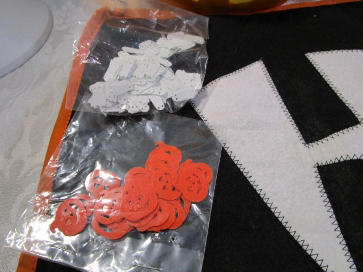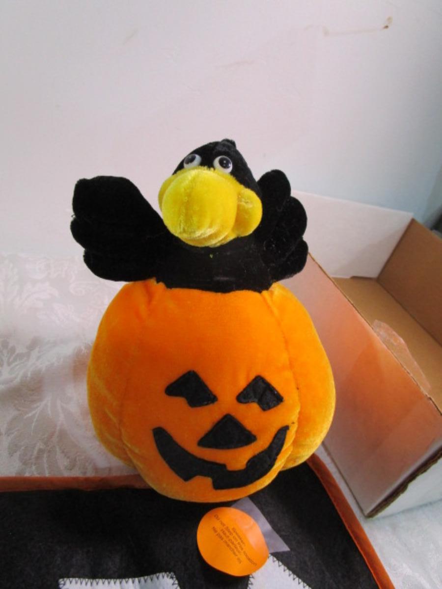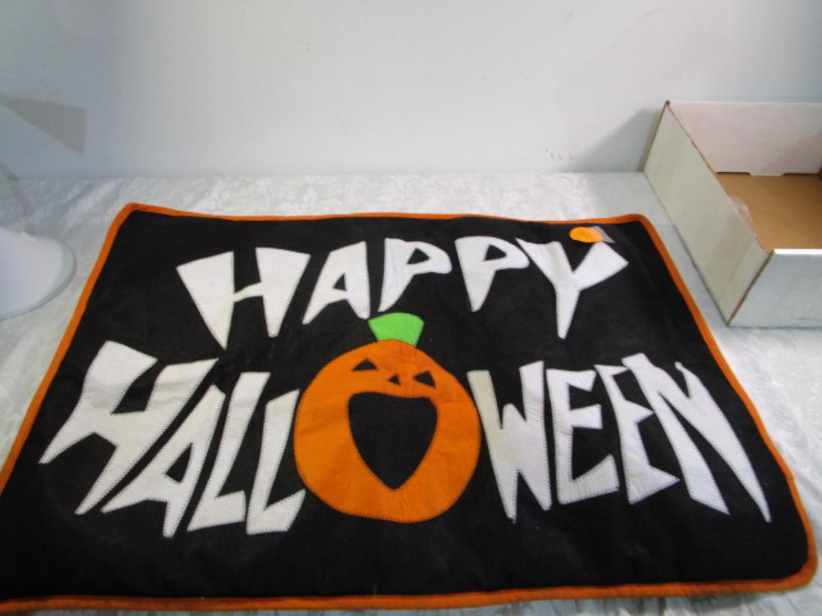 Happy Halloween doormat, new electric jack-o-lantern, Halloween basket & stuffed pumpkin, Doormat untested & takes 3 AG13 batteries not included, 2 bags Halloween confetti