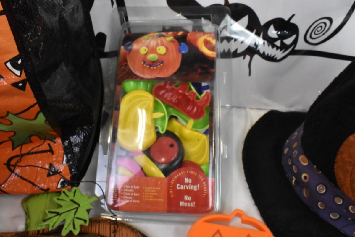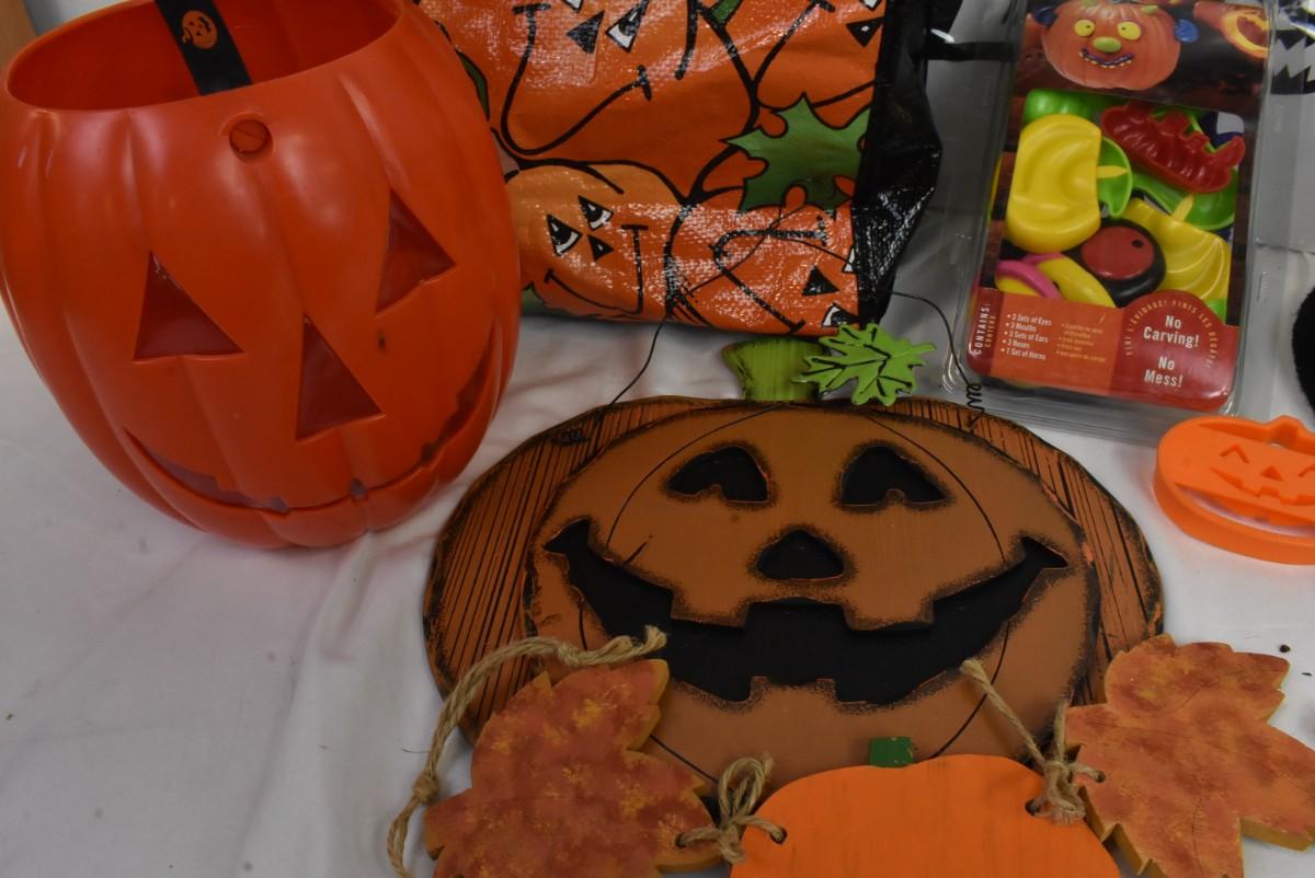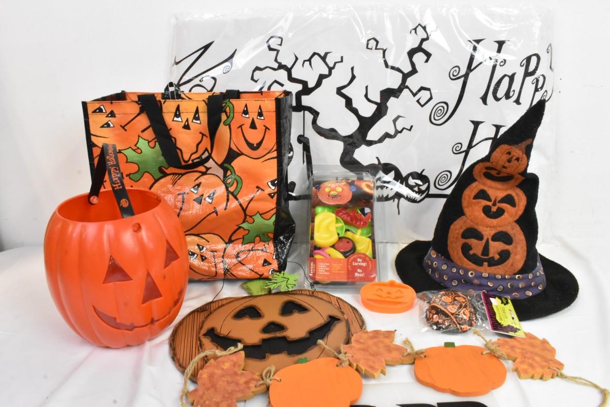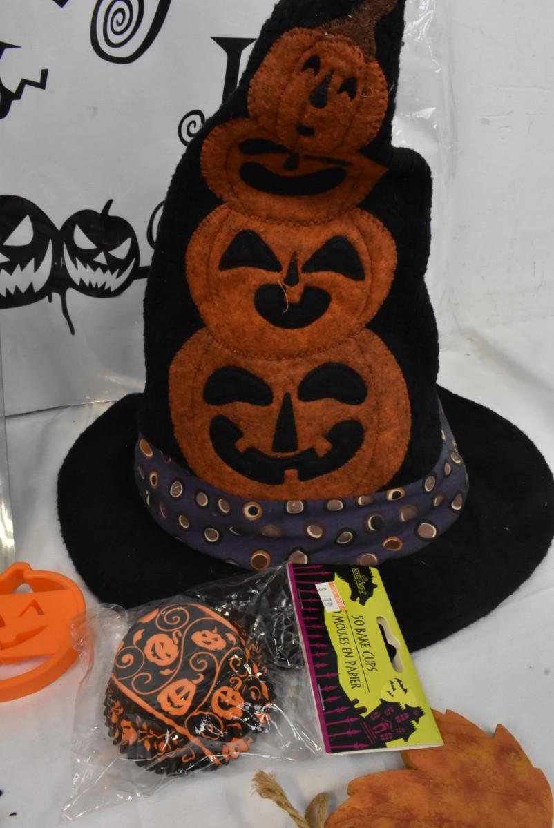Halloween lot: 9+pcs, vinyl silhouettes, metal jack-o-lantern, hat, bucket, no carving jack-o-lantern face kit, garland, cookie cutter w/ cupcake liners