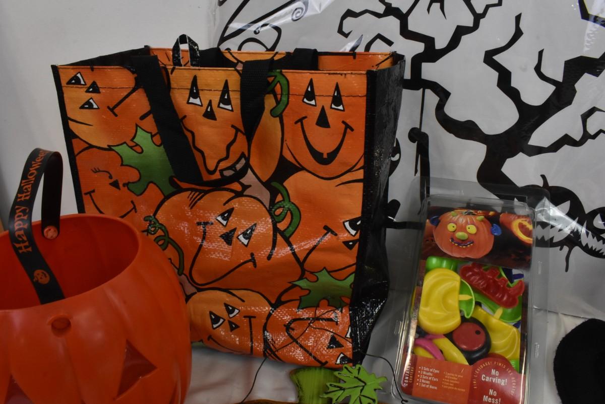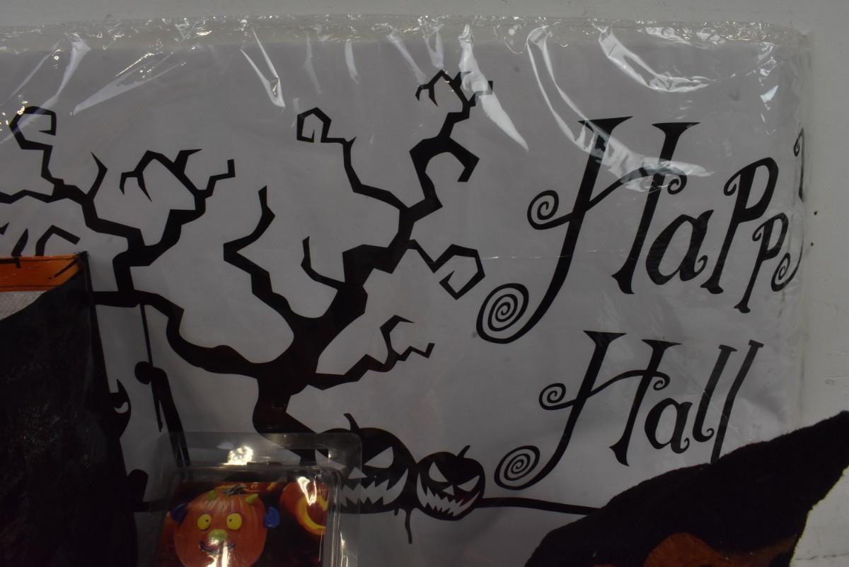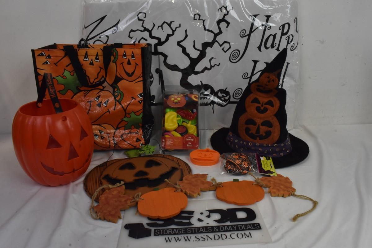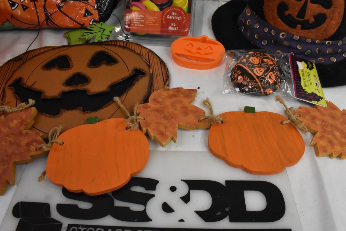 Halloween lot: 9+pcs, vinyl silhouettes, metal jack-o-lantern, hat, bucket, no carving jack-o-lantern face kit, garland, cookie cutter w/ cupcake liners