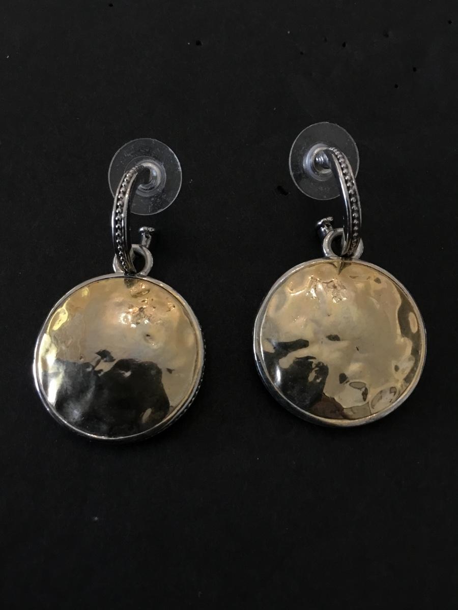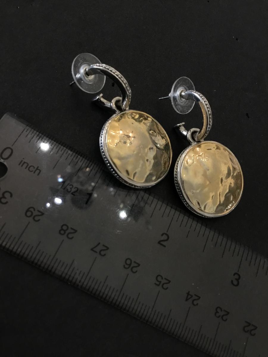 Hammered metal round disc dangle, earrings, silver and gold toned