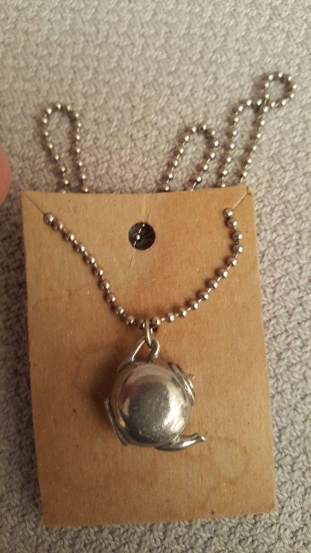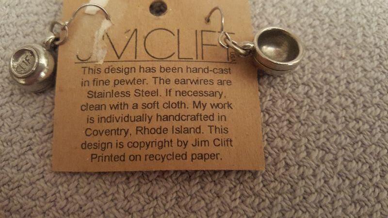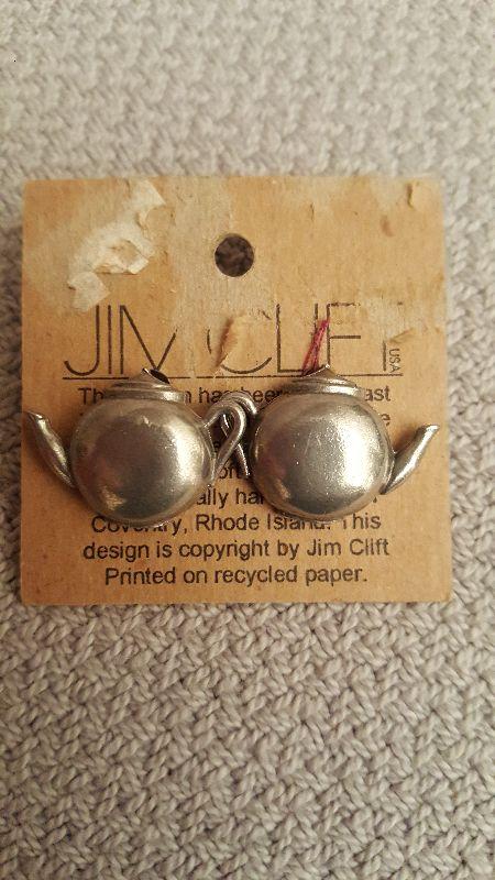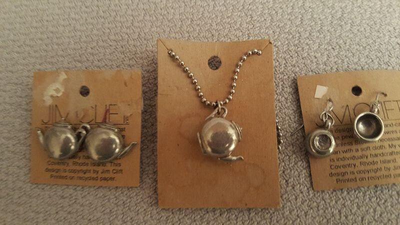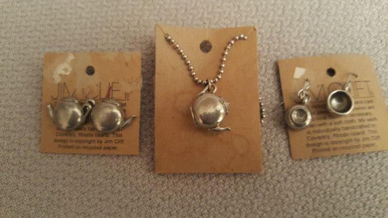 This auction lot is for a set of Handcast Jim Clift Pewter Jewelry. The set includes a necklace, and two sets of pierced earrings - one a teapot and the other tea cups. The 30-inch necklace depicts a fun teapot. See photos for details. Make in pewter in Coventry, Rhode Island and donated to the IHA Foundation Fundraiser Auction by Kay Whitlock.