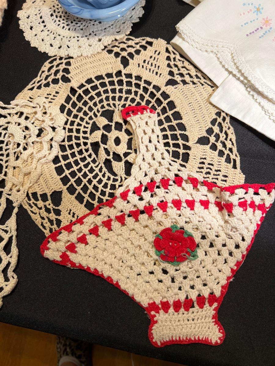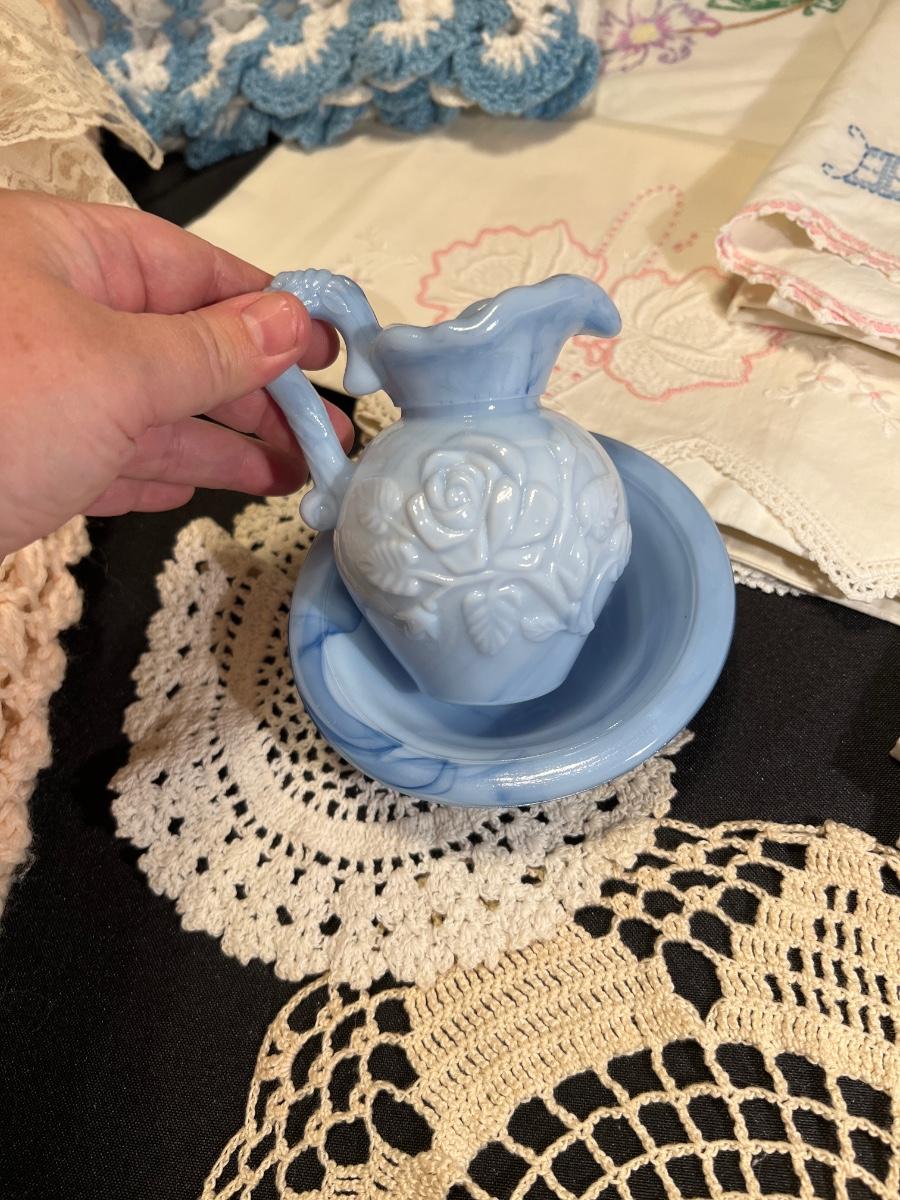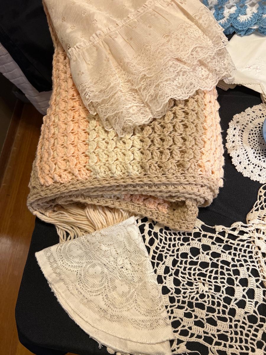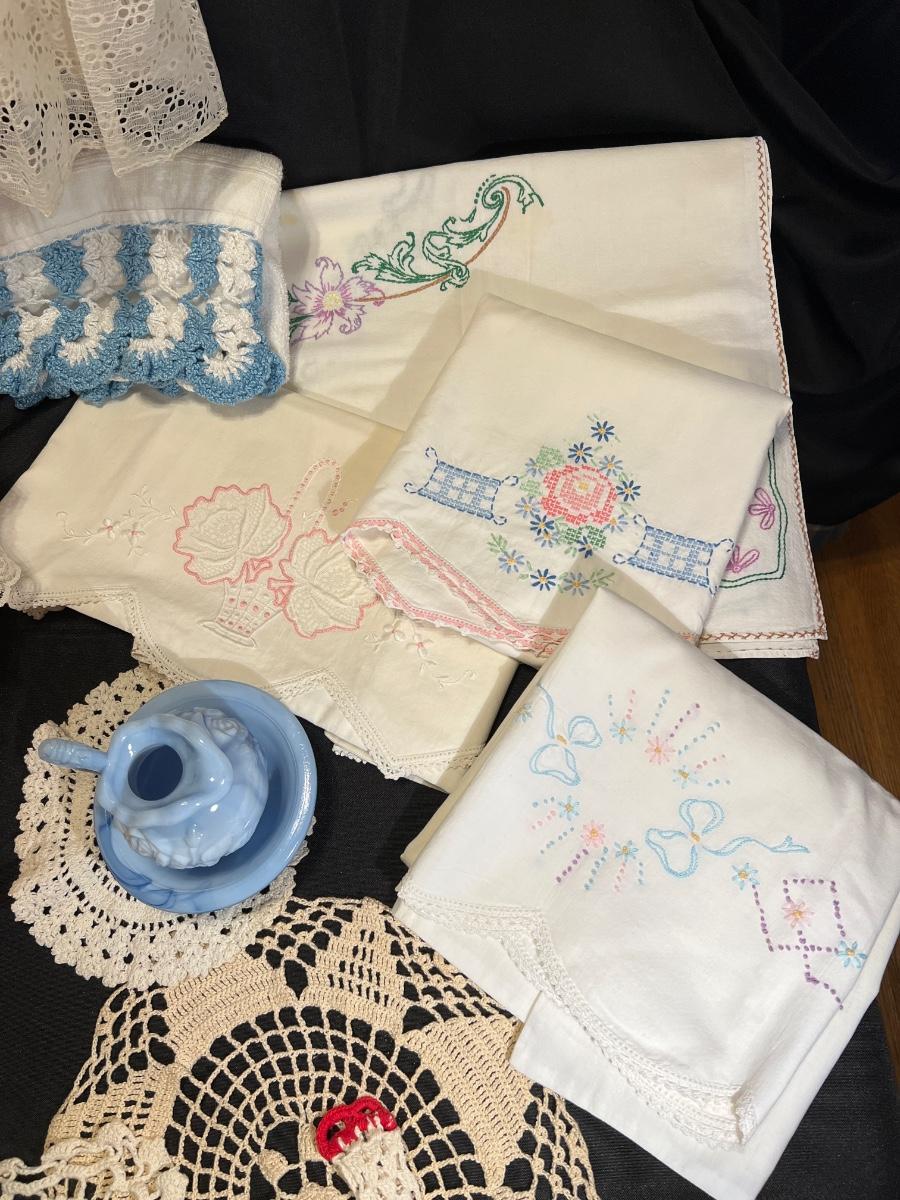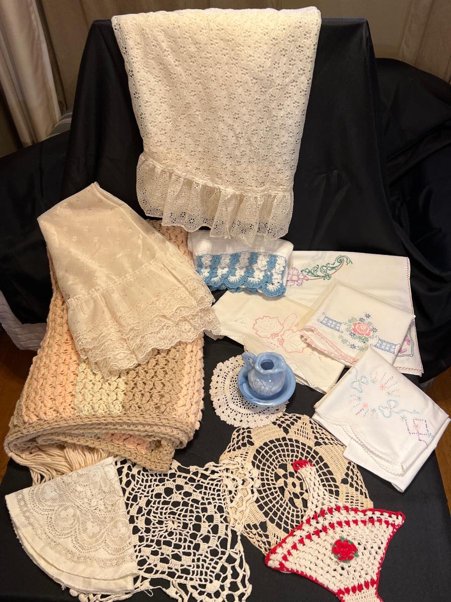 Vintage hand embroidered pillow cases (3), vintage embroidered small table cloth, crocheted towel, doilies (5), 2 lace tablecloths, blanket and Vintage Avon mini wash pitcher and basin.