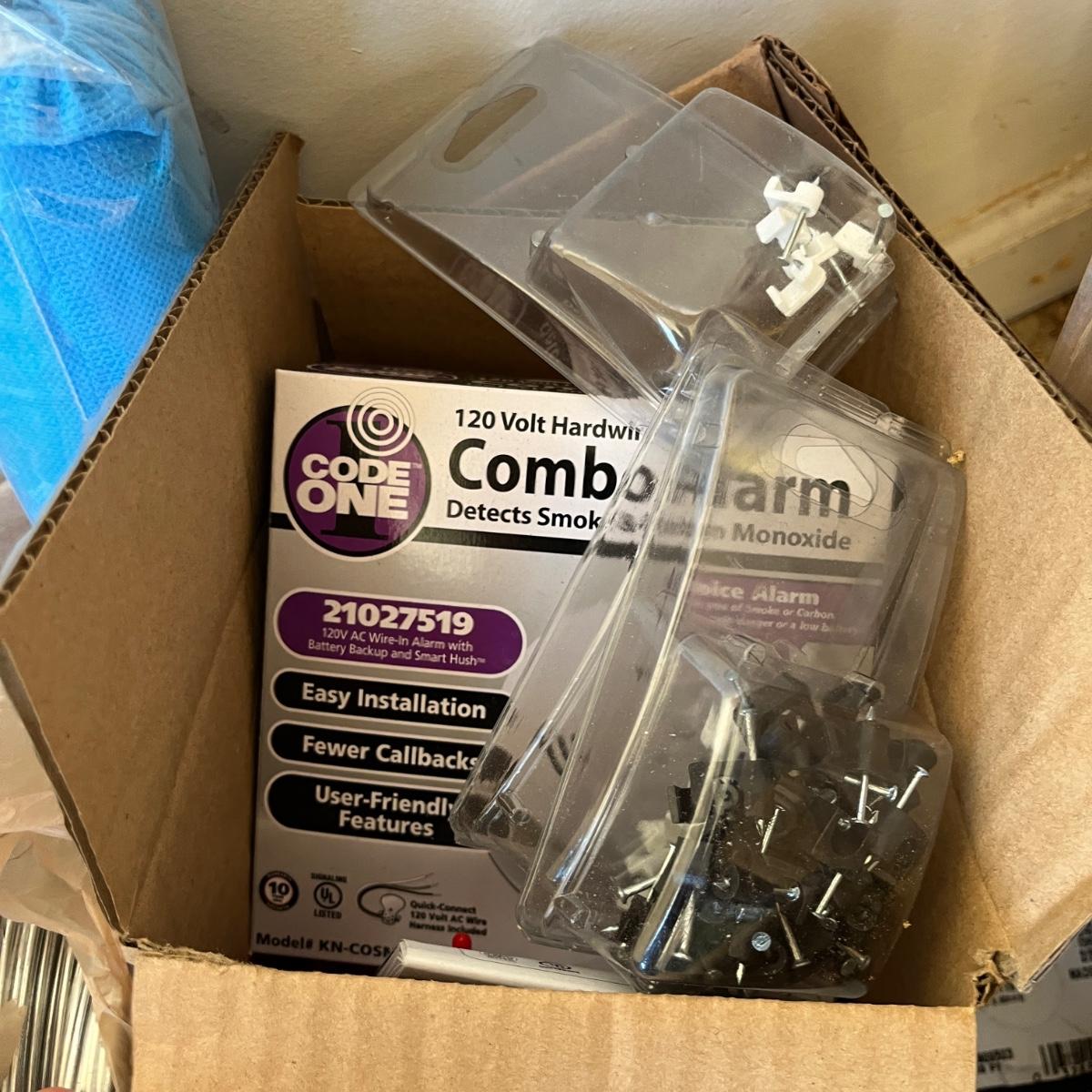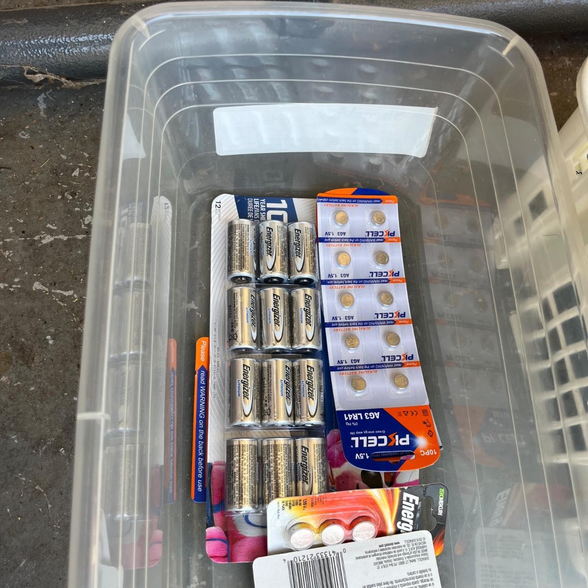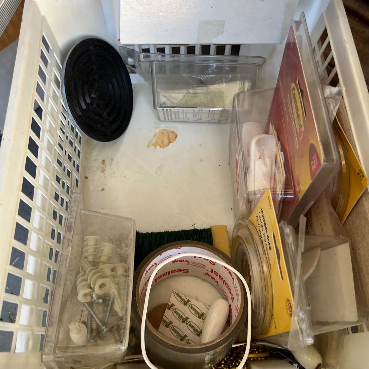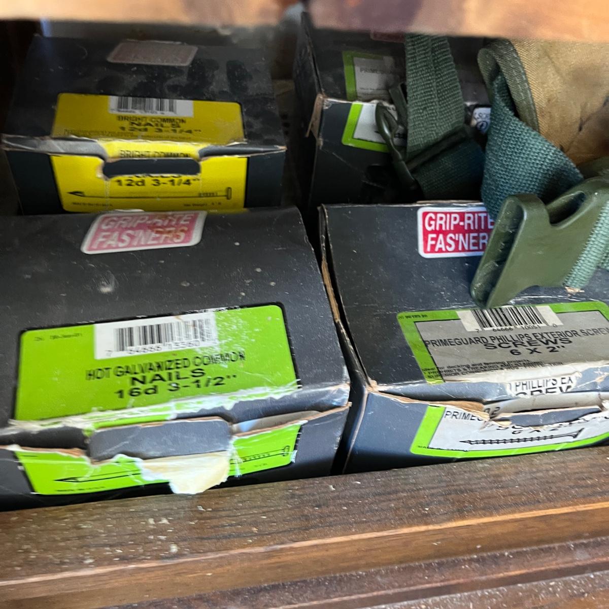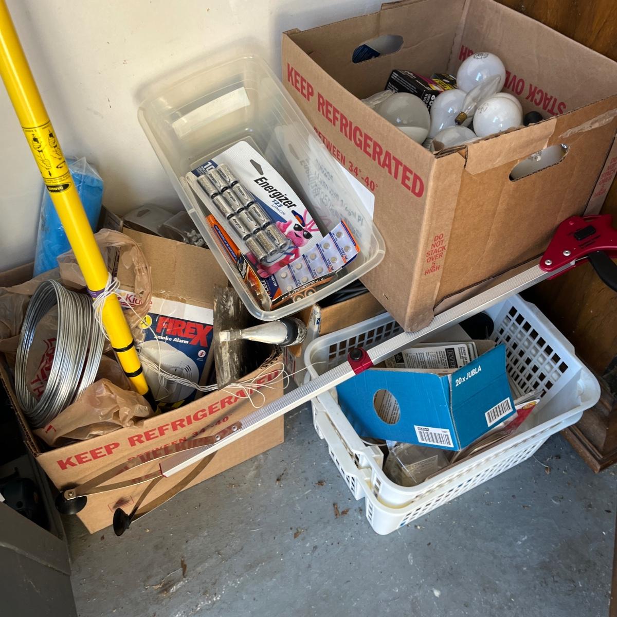 Lot contains a large selection of hardware including nails, screws, batteries, lightbulbs, bungee cords, tool belt, lock respirator, cable clamps, smoke detector and more.