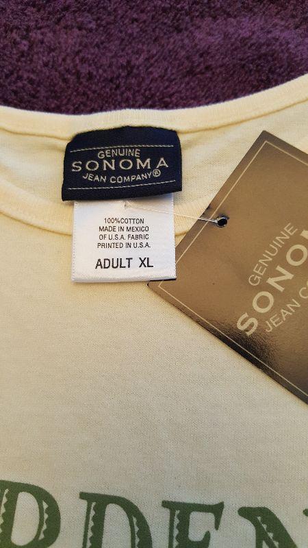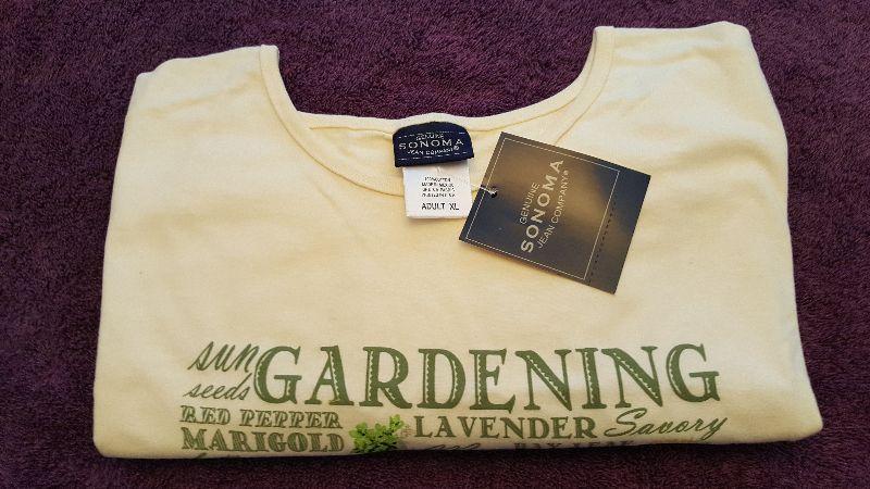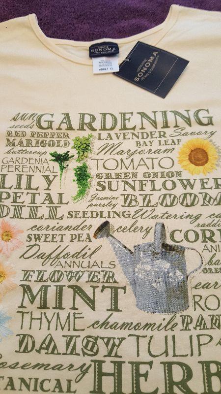 This lot is for a ladies Herby Gardener's T-Shirt in Adult size XL. Made by the Sonoma Jean Company of 100% cotton fabric. Colorful word-laden design with a soft yellow background. Sure to look great upon you or as a gift for your best friend. New, never worn. Donated by an anonymous friend of IHA.