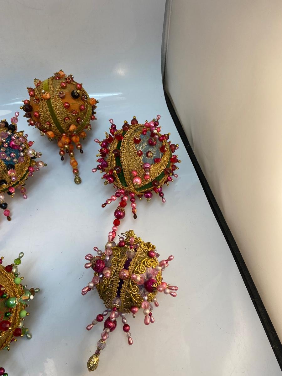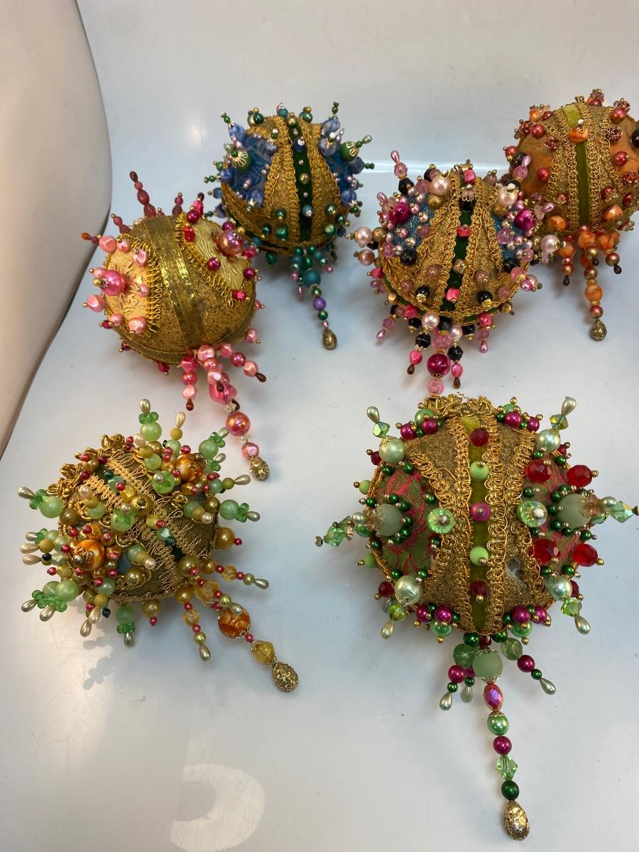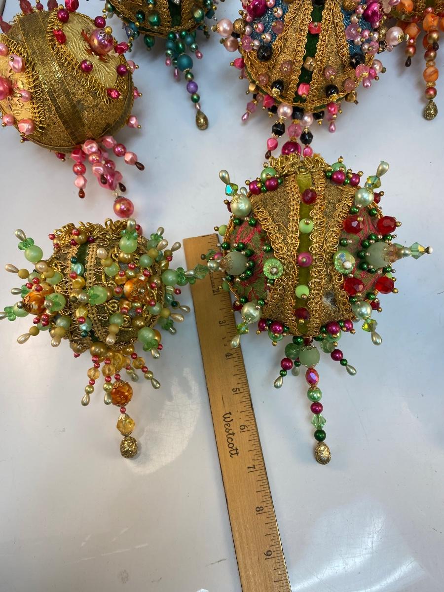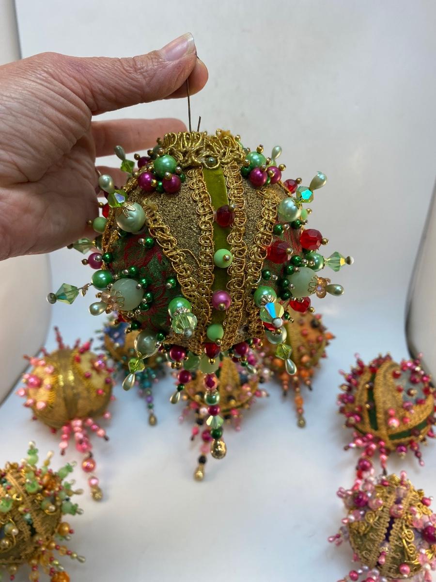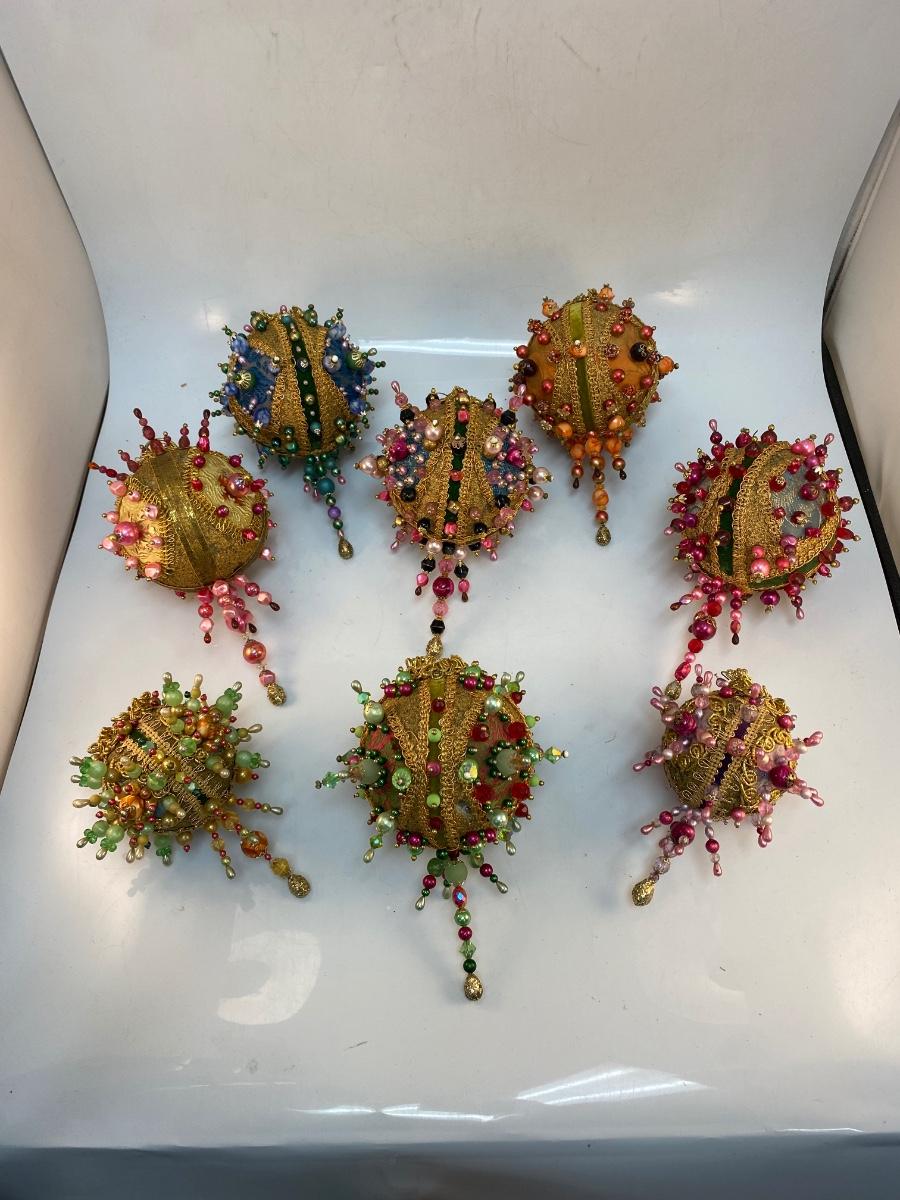 Vintage Hand-Crafted Beaded Sequin Felt Lace Pin Cushion Style Christmas Tree Holiday Hanging Ornament. Set of 8, 6 large and 2 small. Beautifully crafted.