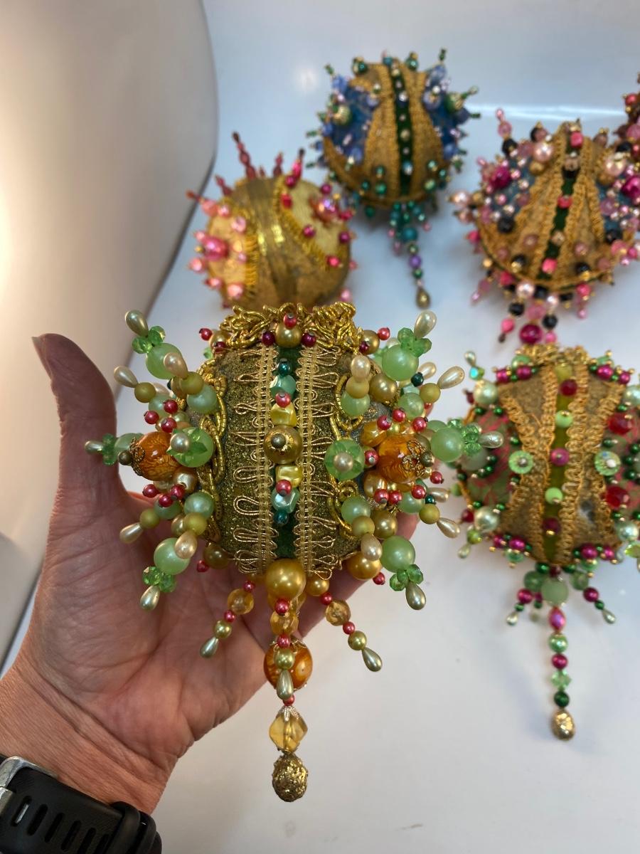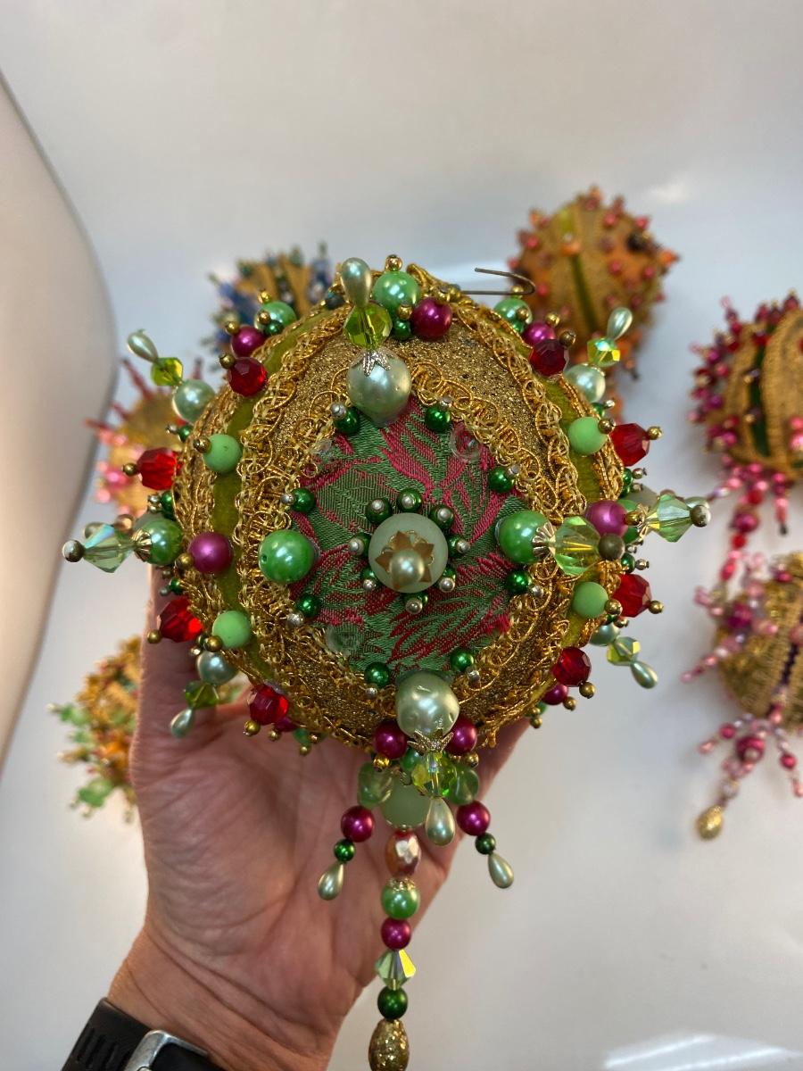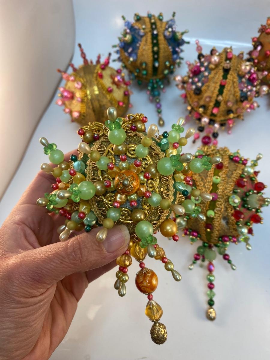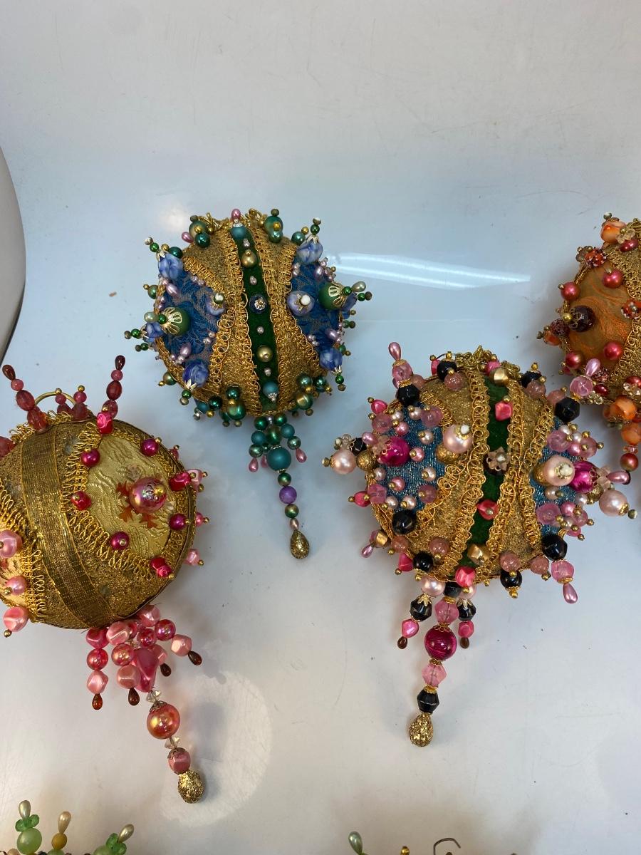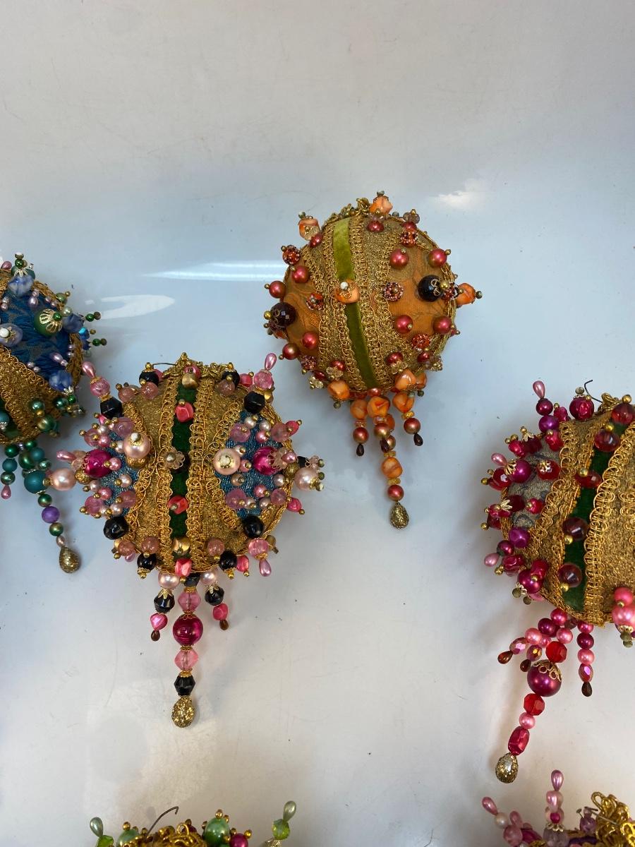 Vintage Hand-Crafted Beaded Sequin Felt Lace Pin Cushion Style Christmas Tree Holiday Hanging Ornament. Set of 8, 6 large and 2 small. Beautifully crafted.