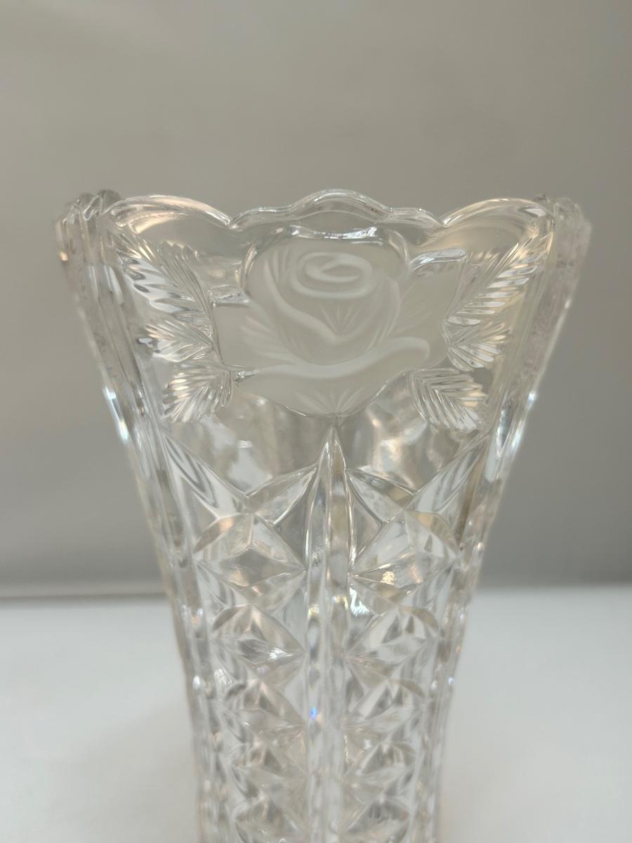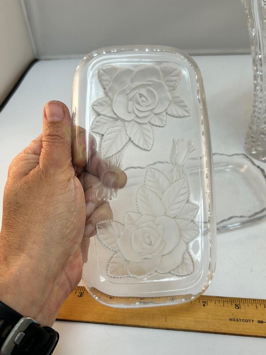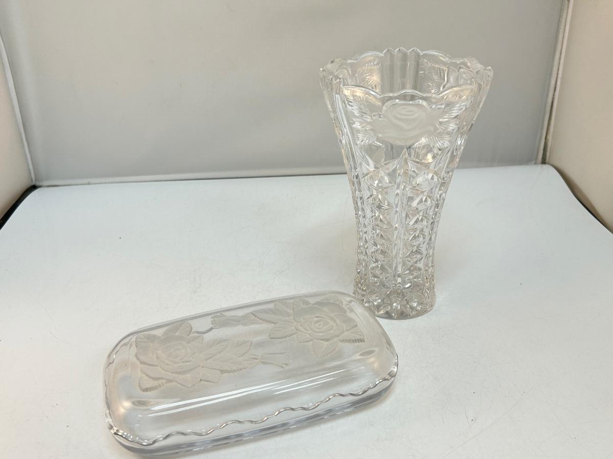 Frosted Embossed Rose Pattern Flower Vase and Lidded Trinket Dish. In good condition. Vary similar patterns.