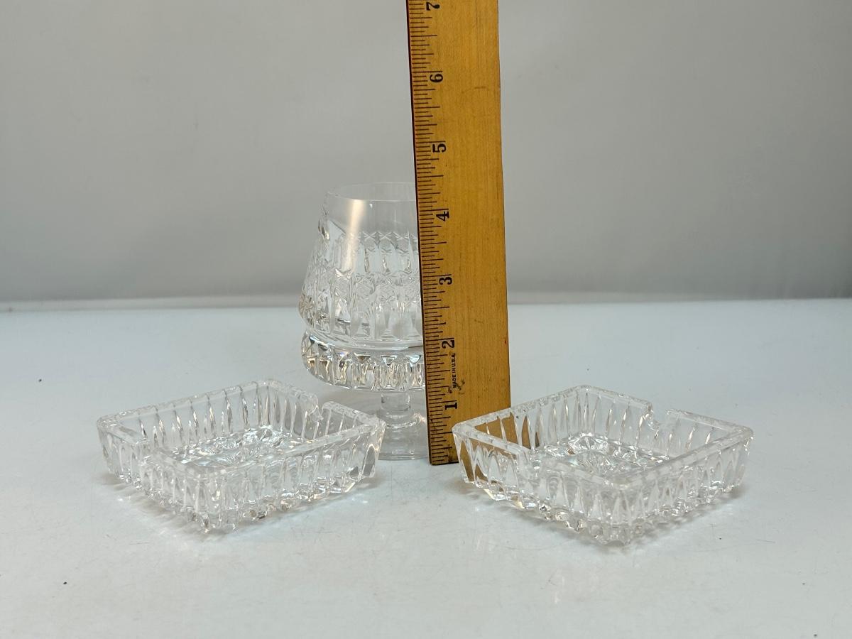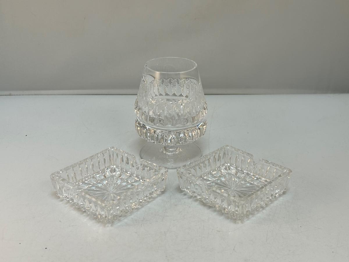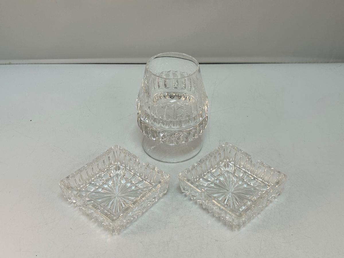 Vintage Cut Crystal Square Ashtrays and Brandy Snifter Stemware Glass