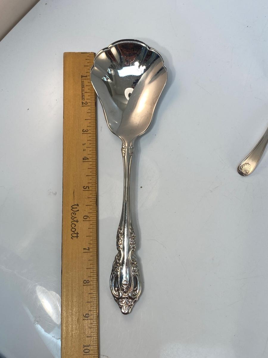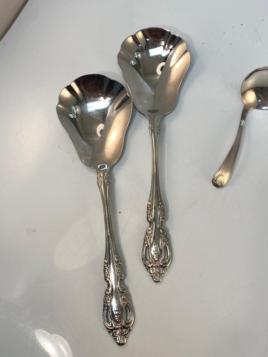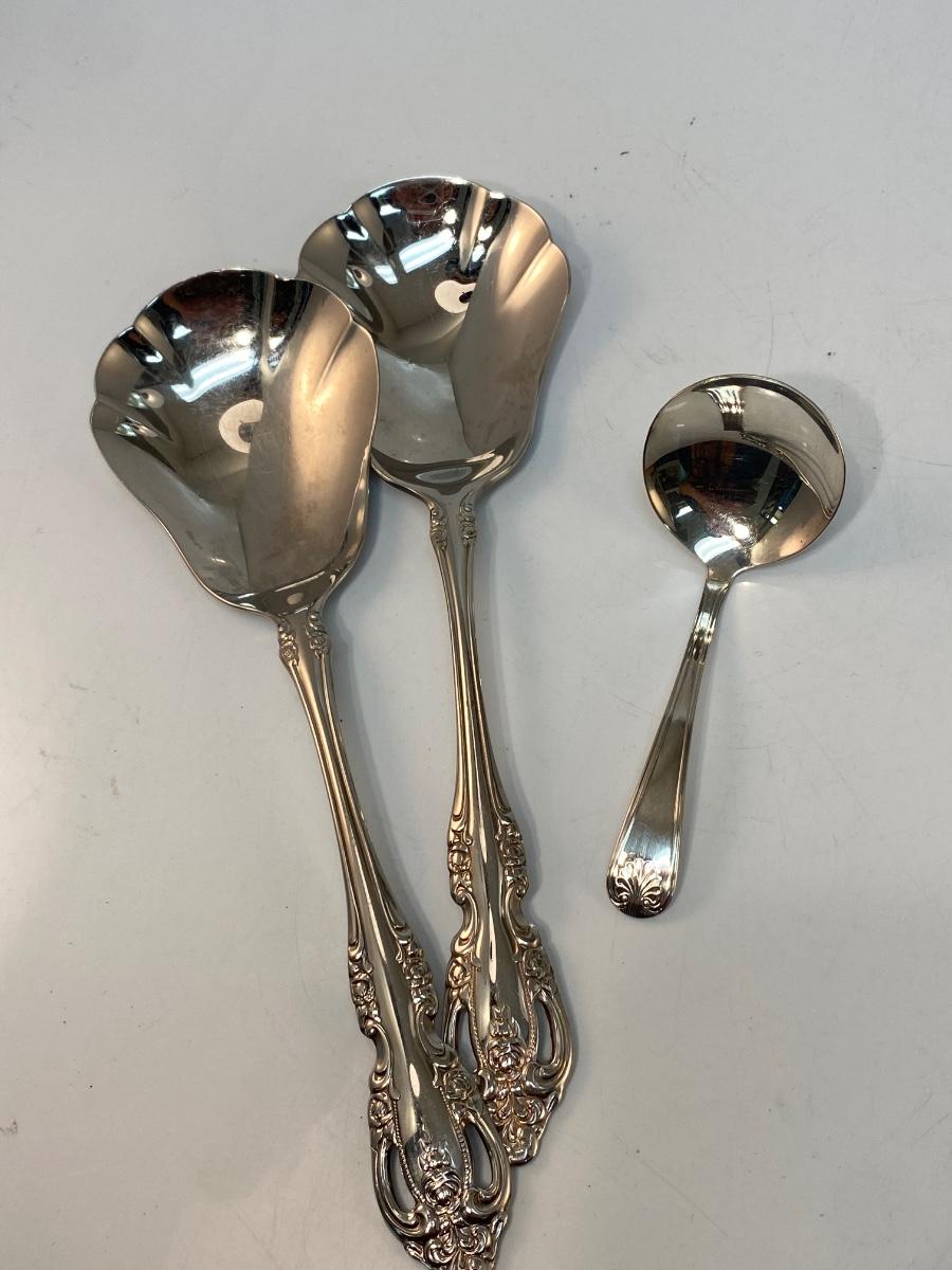 Pair of Scalloped Serving Spoons and Small Condiment Jelly Spoon. Good condition.