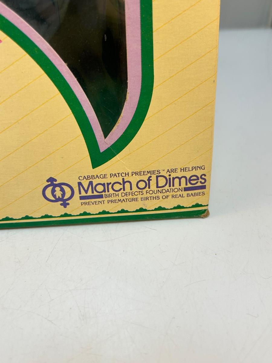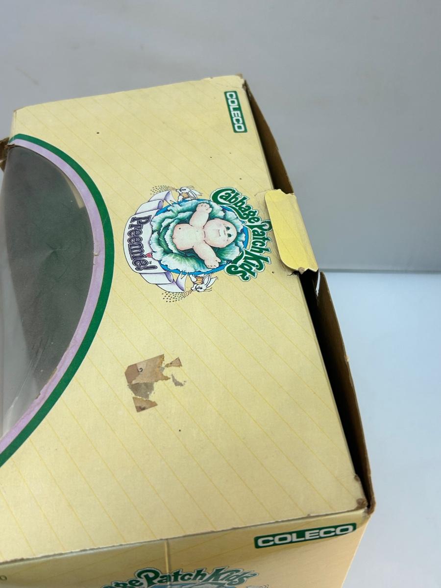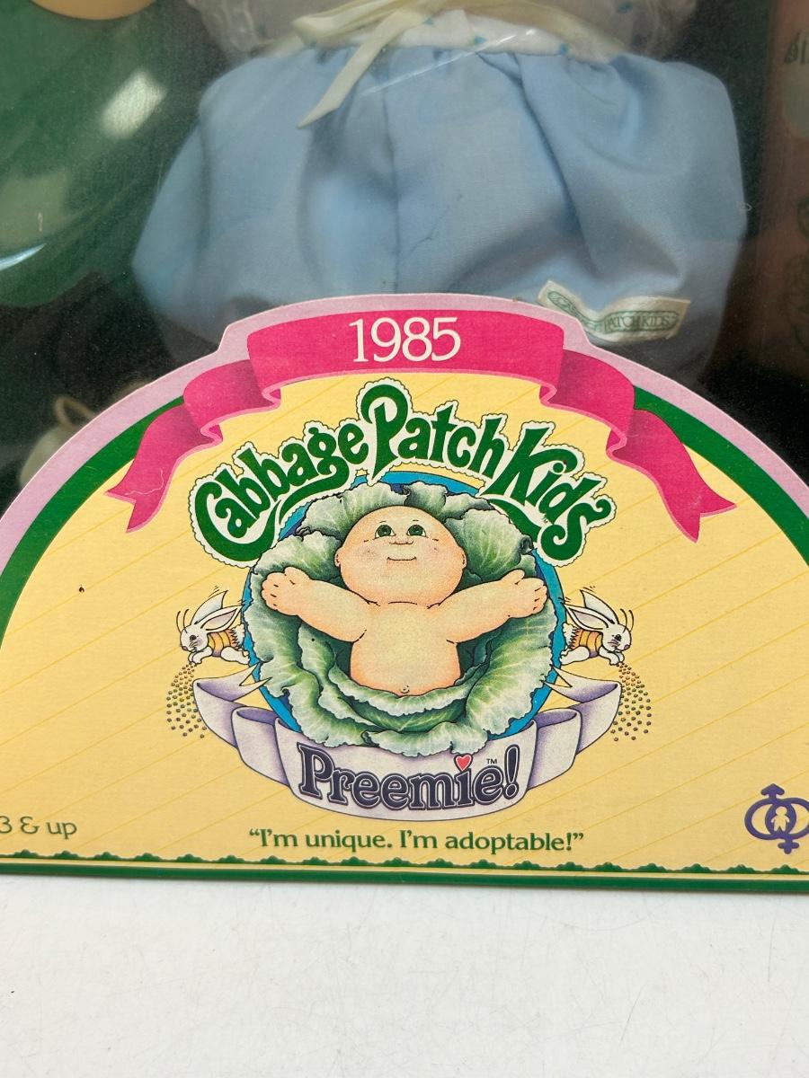 Vintage Retro 1985 Cabbage Patch Kids Preemie in Original Box. Not sure if it was ever actually removed. Box has been opened but doll still attached to inside cardboard. Has shoes and birth certificate inside.