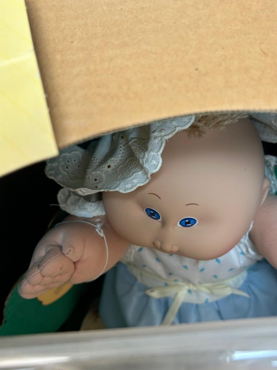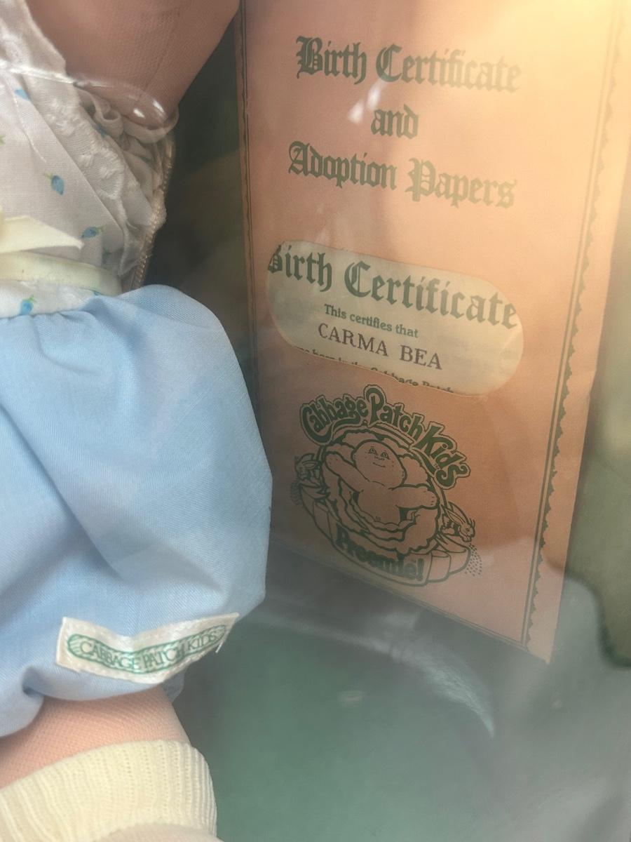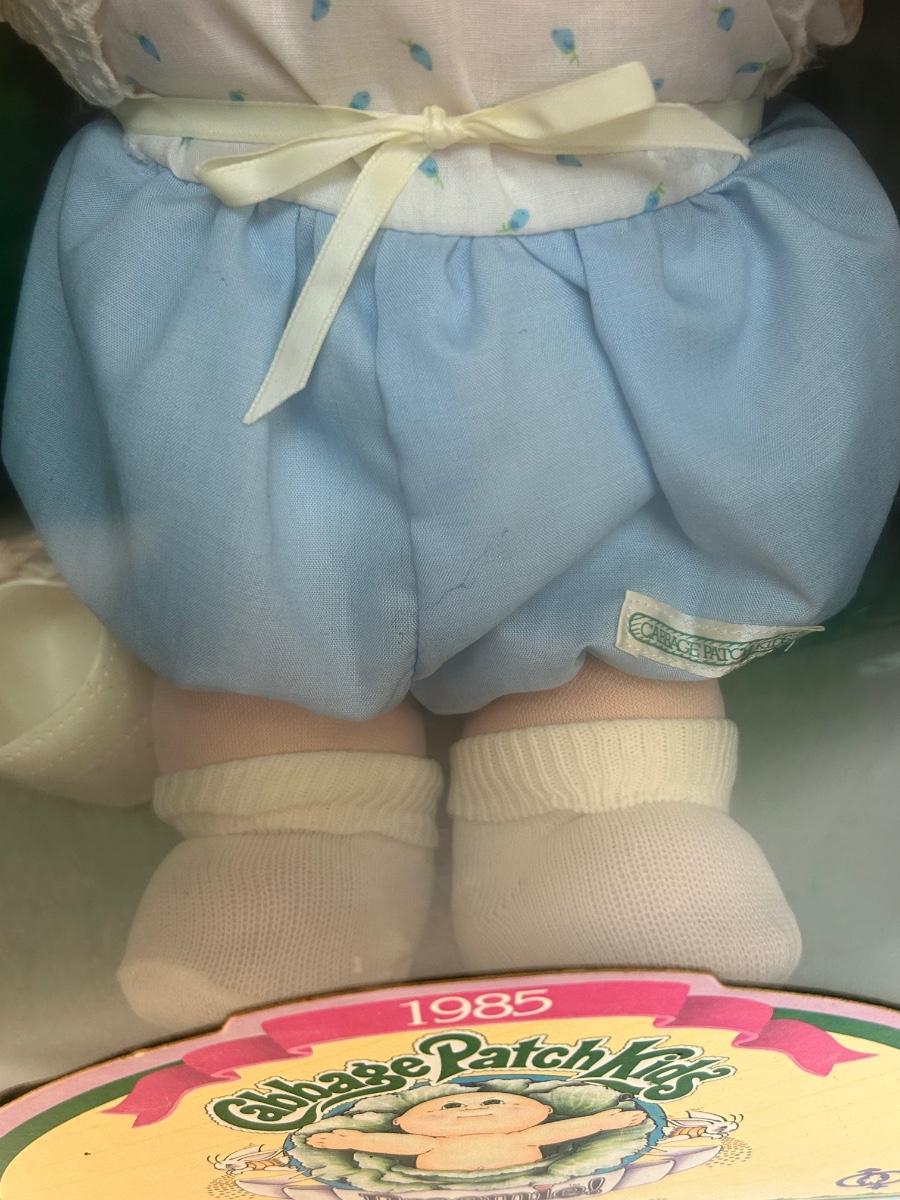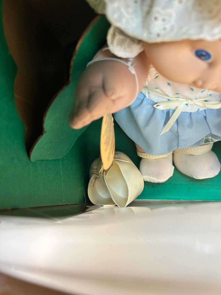 Vintage Retro 1985 Cabbage Patch Kids Preemie in Original Box. Not sure if it was ever actually removed. Box has been opened but doll still attached to inside cardboard. Has shoes and birth certificate inside.