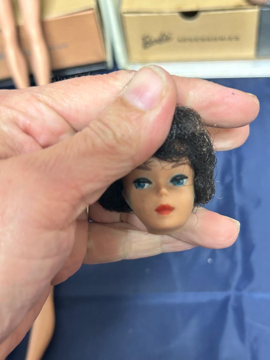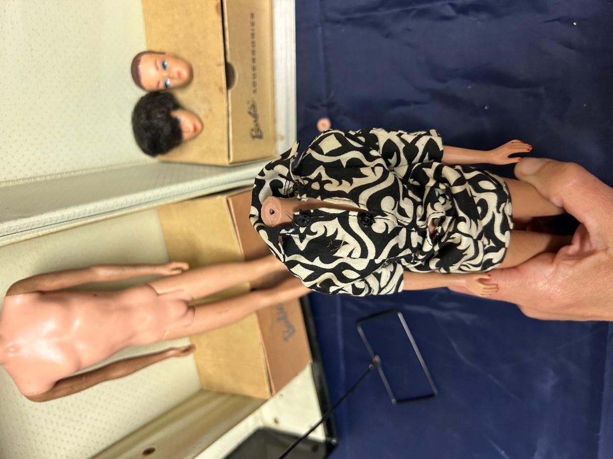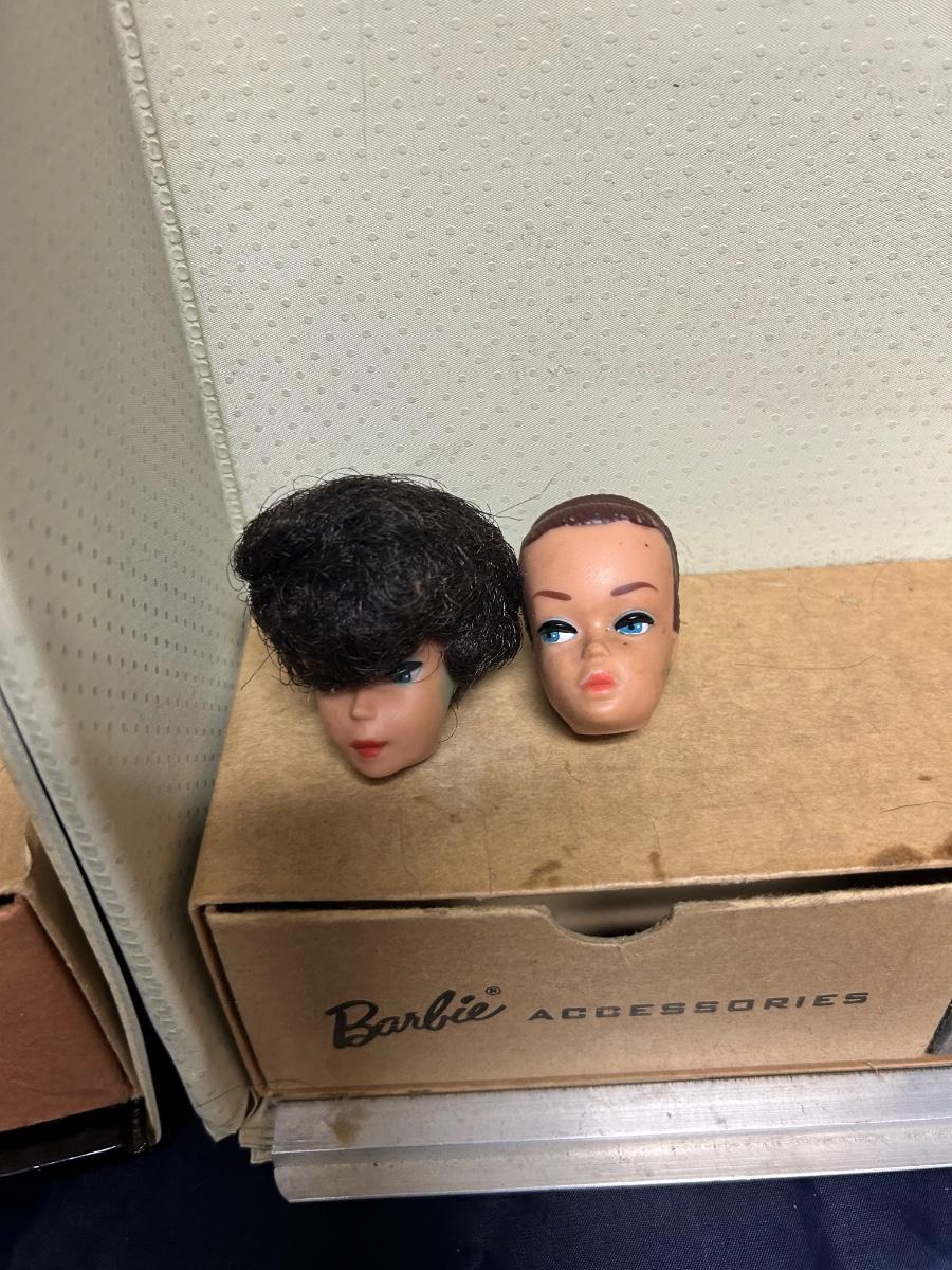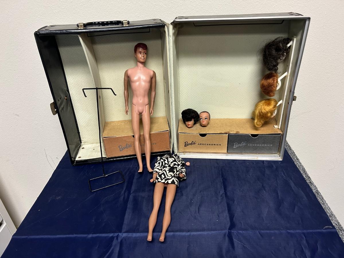 Vintage Vinyl Barbie Doll Storage Case with Ken Barbie Midge with Wigs. In various states of age. Barbie unfortunately has a broken neck, piece included for repair. The Midge head does not fit the body included. Ken has discolor to his body from age. Barbie body is dated 1958in roman numerals, Ken 1960. Case in good used condition. See photos.