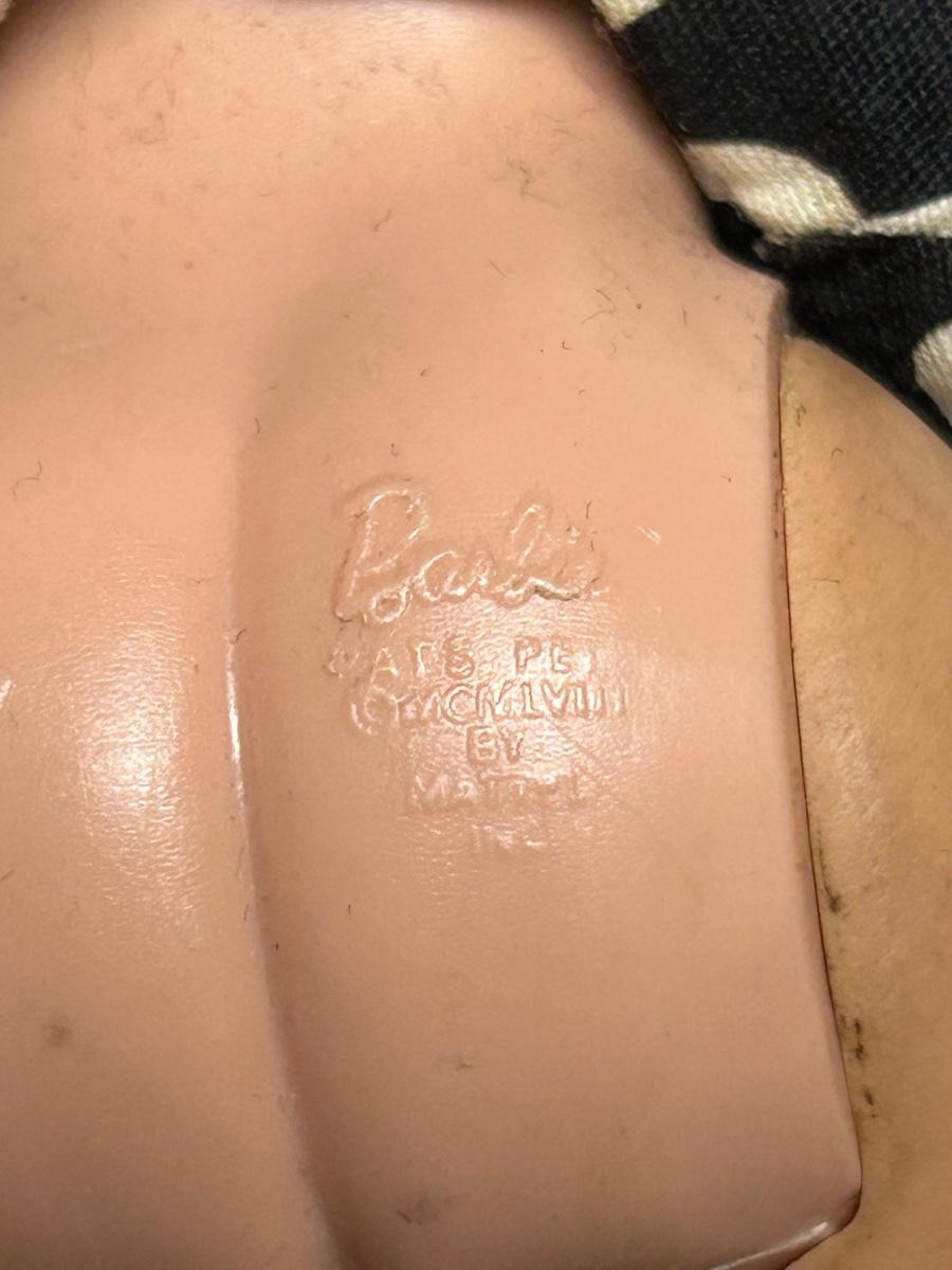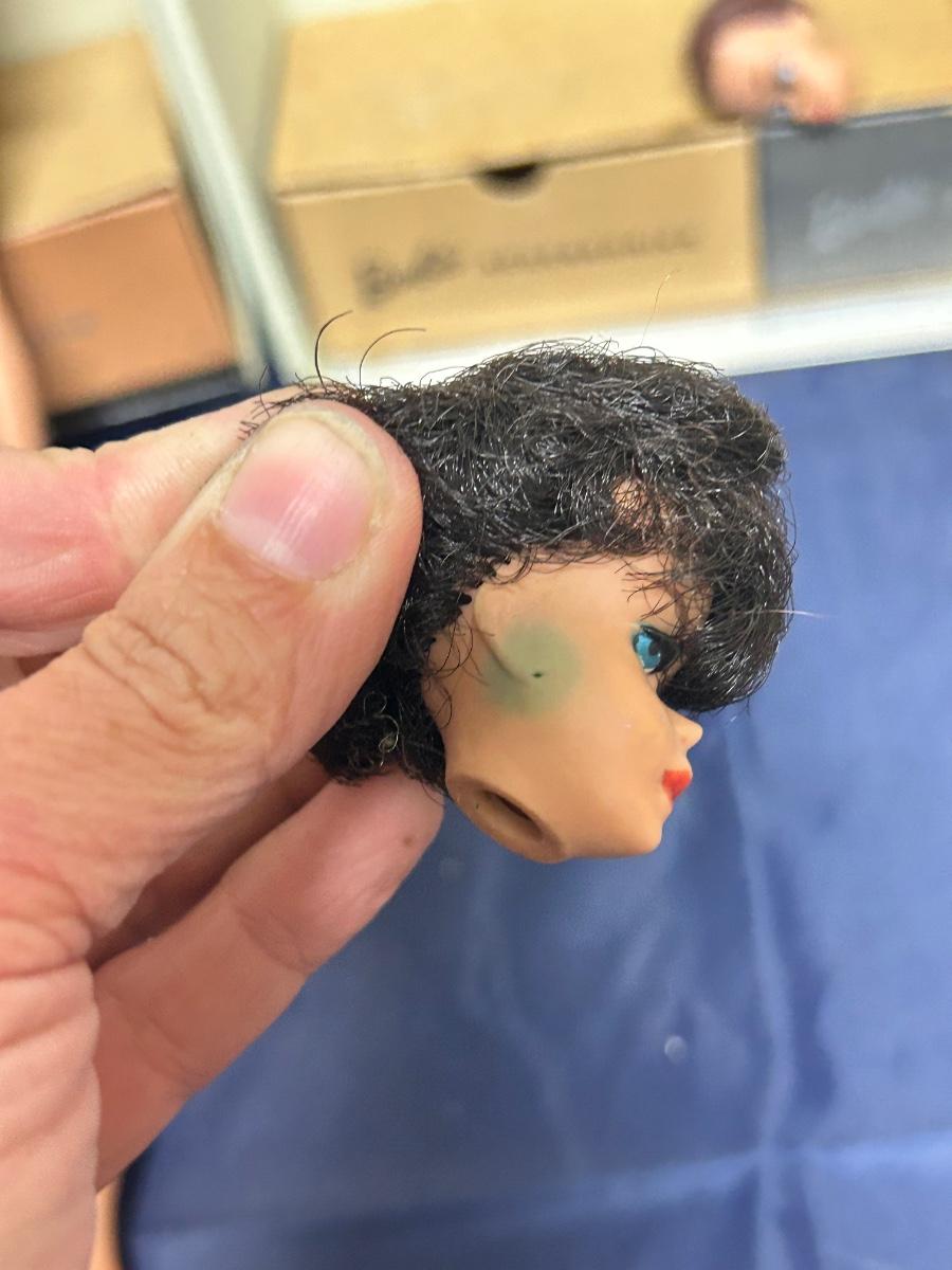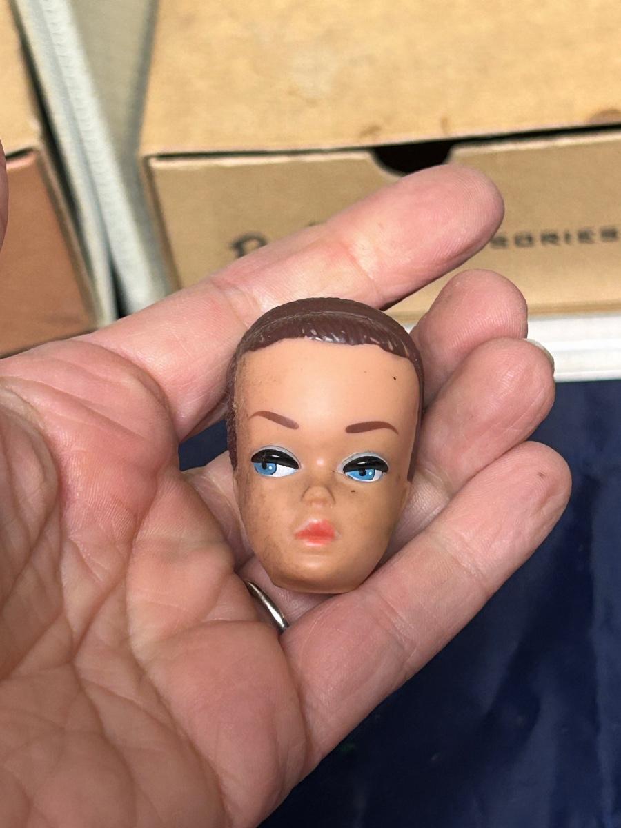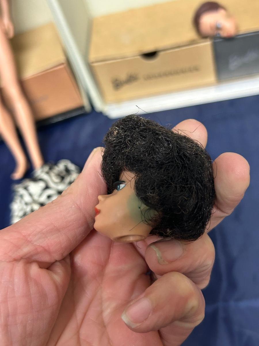 Vintage Vinyl Barbie Doll Storage Case with Ken Barbie Midge with Wigs. In various states of age. Barbie unfortunately has a broken neck, piece included for repair. The Midge head does not fit the body included. Ken has discolor to his body from age. Barbie body is dated 1958in roman numerals, Ken 1960. Case in good used condition. See photos.