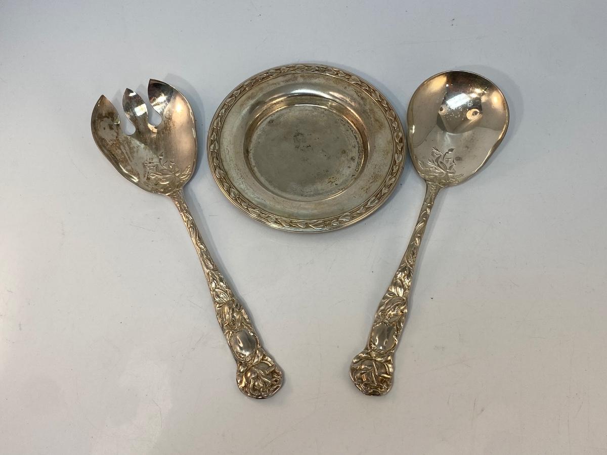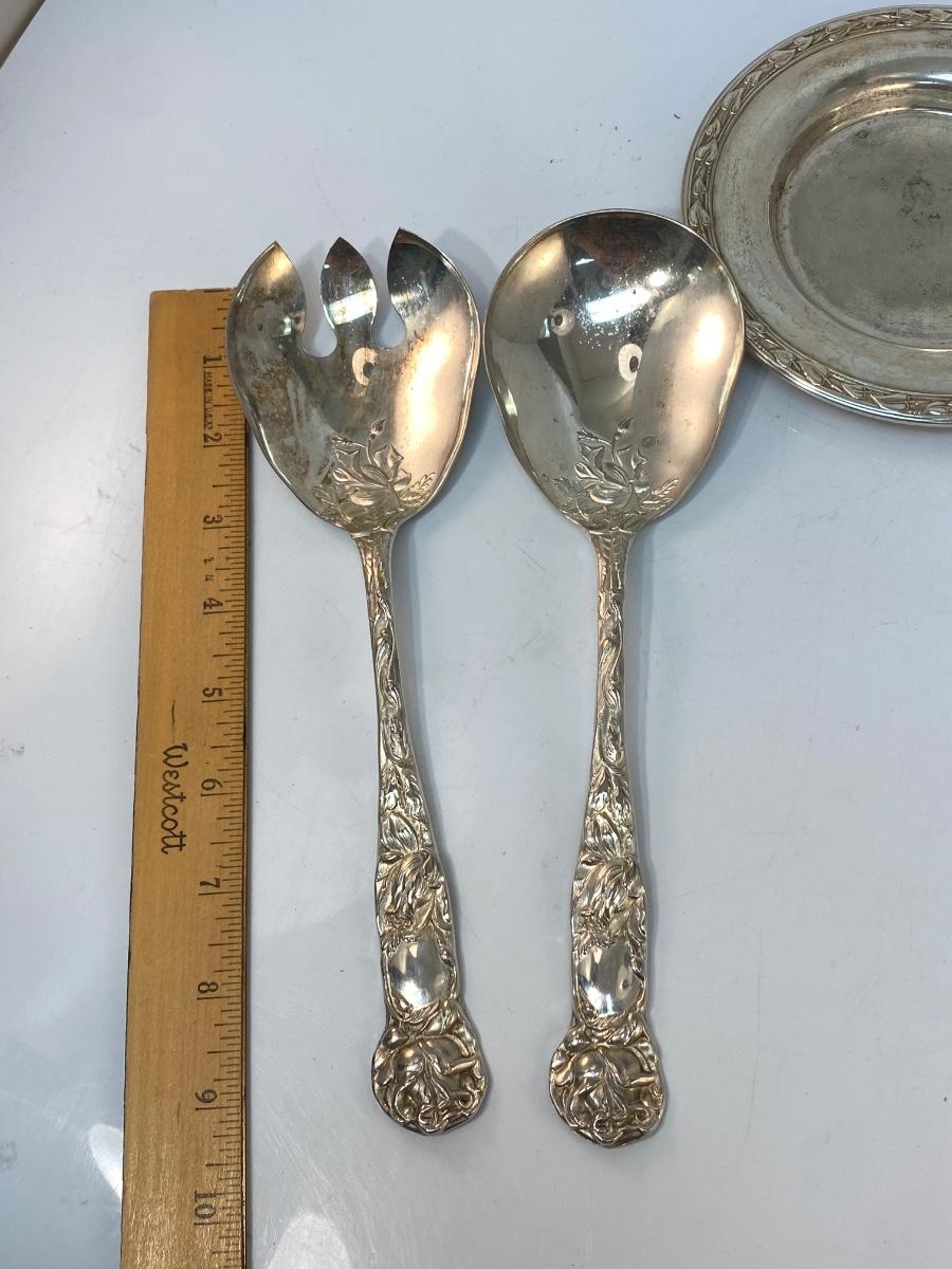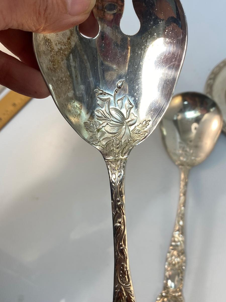 Vintage Silver Plate Ornate Floral Rose Handle Serving Tongs Spoons & Small Vine Edge Plate