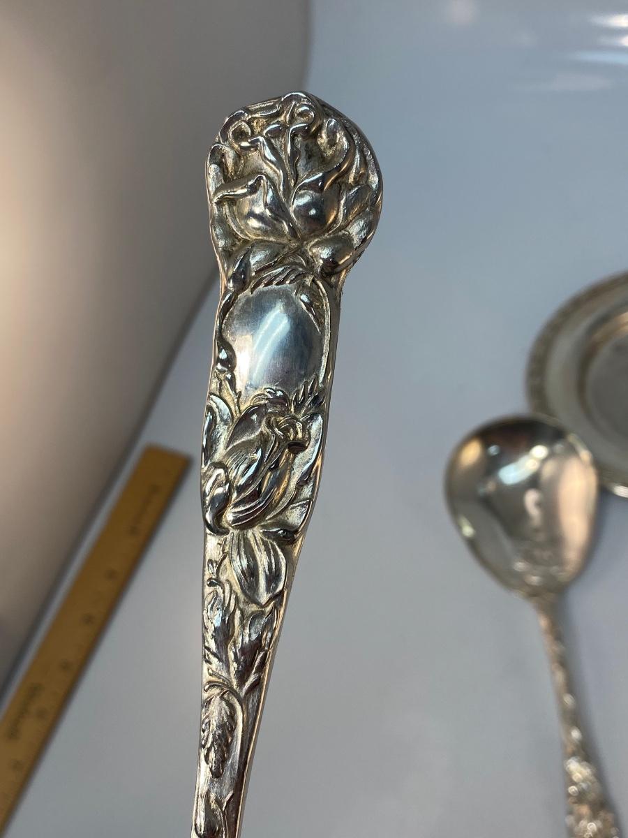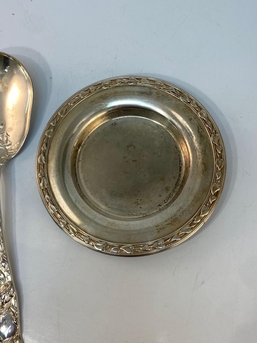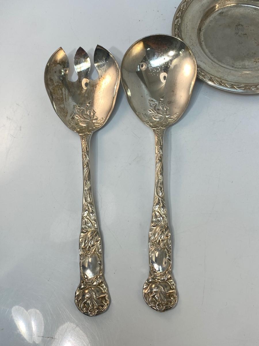 Vintage Silver Plate Ornate Floral Rose Handle Serving Tongs Spoons & Small Vine Edge Plate