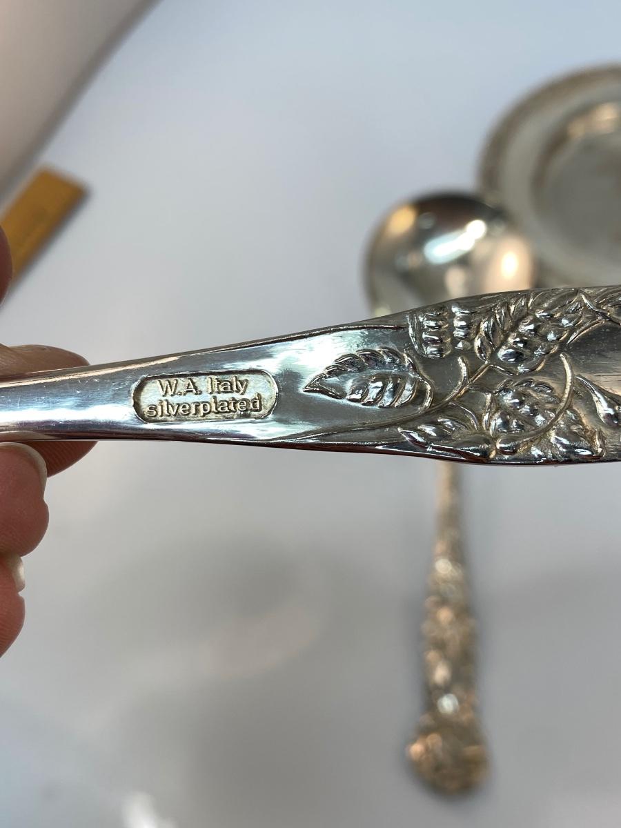 Vintage Silver Plate Ornate Floral Rose Handle Serving Tongs Spoons & Small Vine Edge Plate. In good condition. Serving tongs have a floral pattern, made by W.A. Italy. Plate is from Roger Bros.