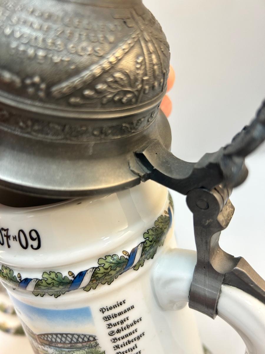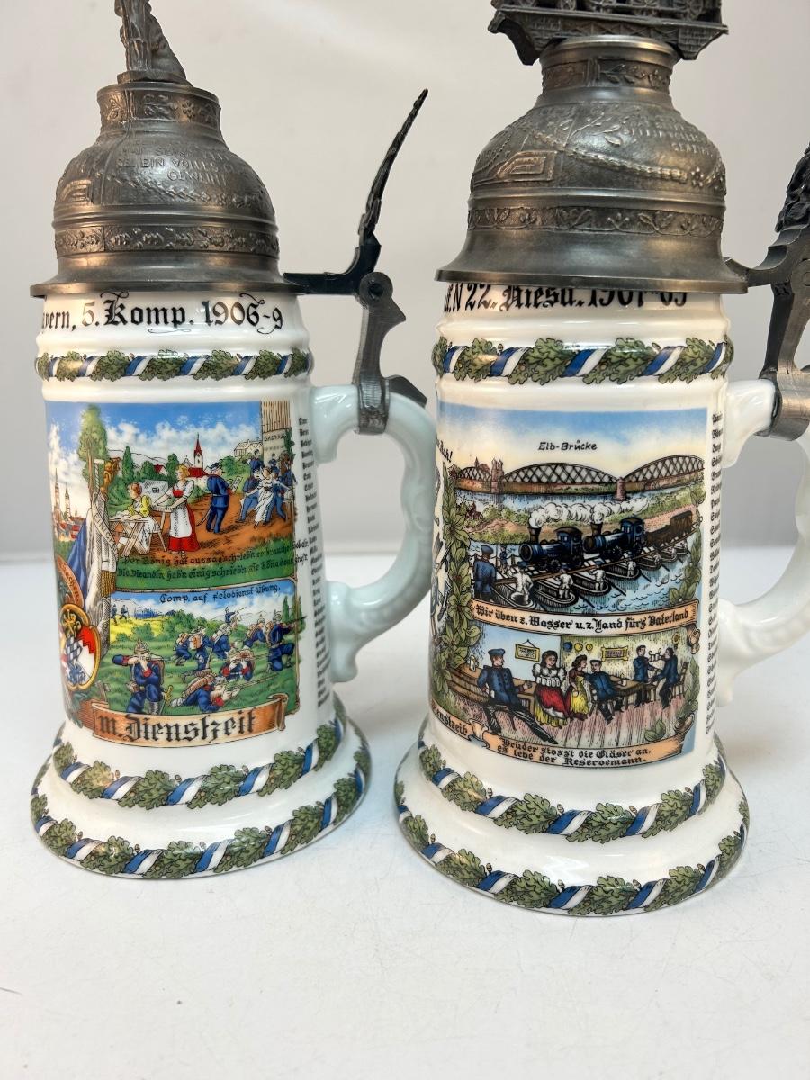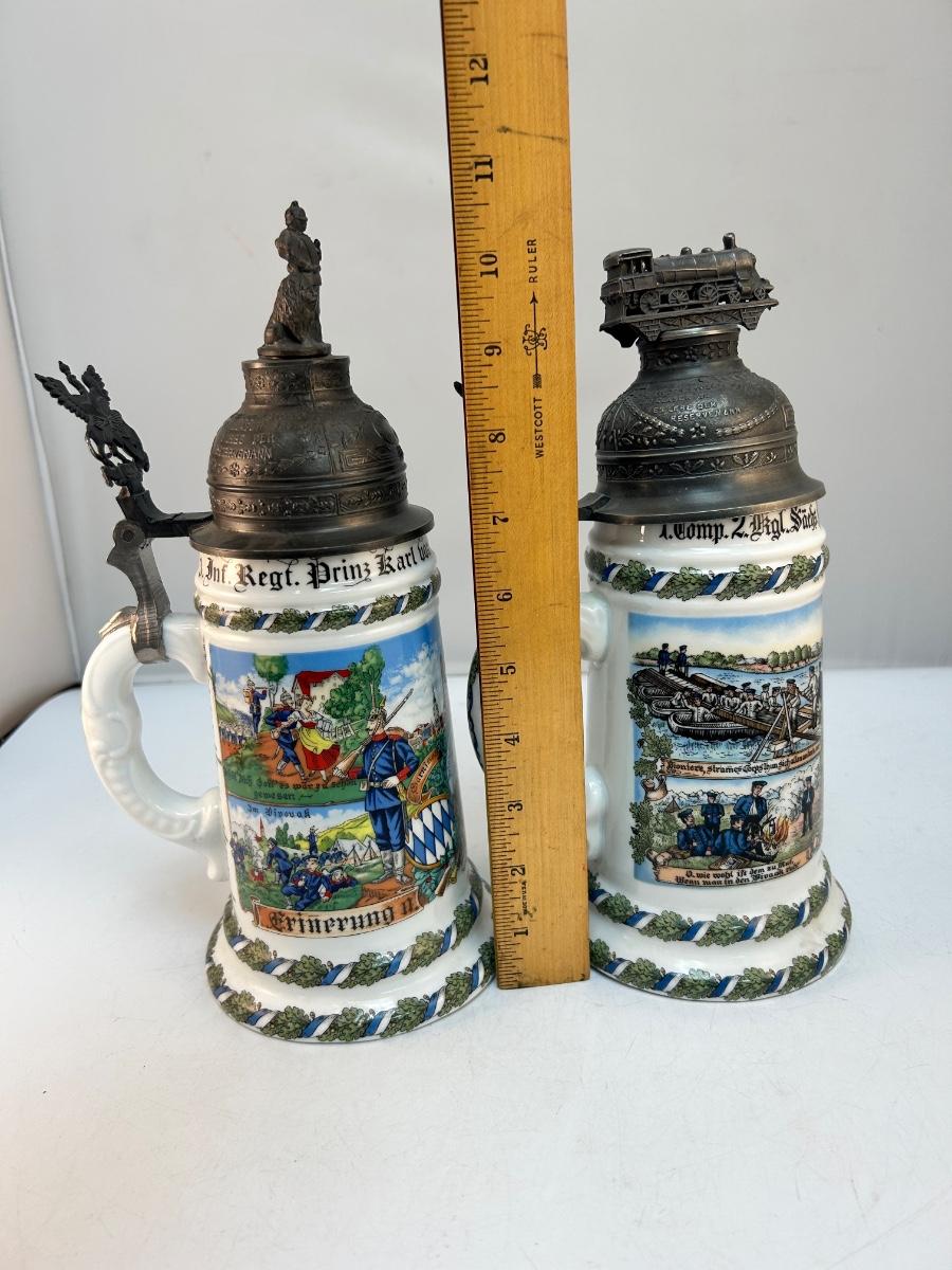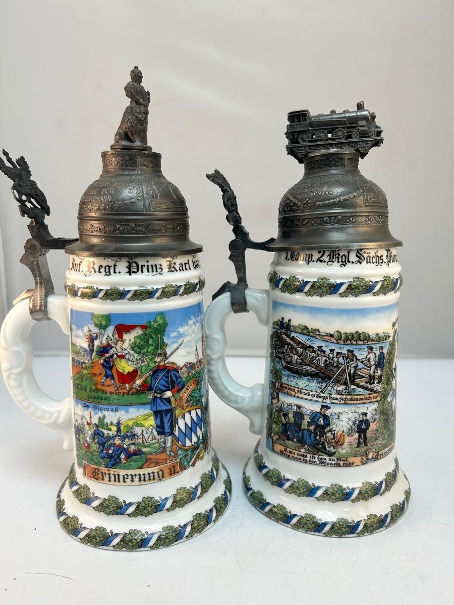 Pair Of Colorful White Ceramic Lidded German Beer Steins. The locomotive lid does have a crack at the hinge and is a little crooked.