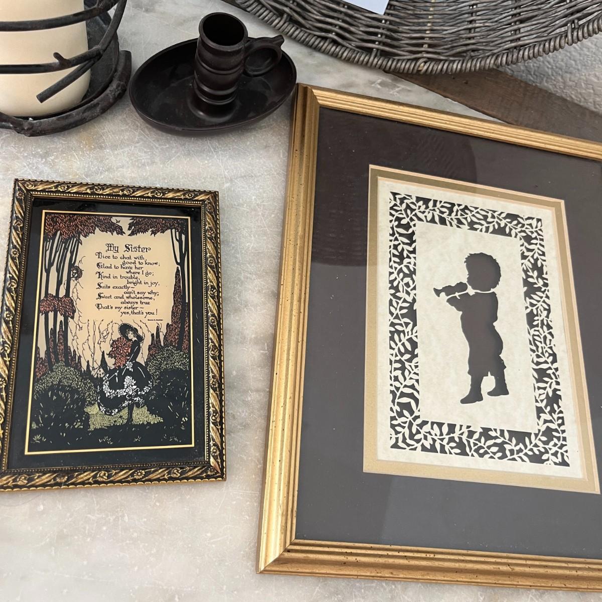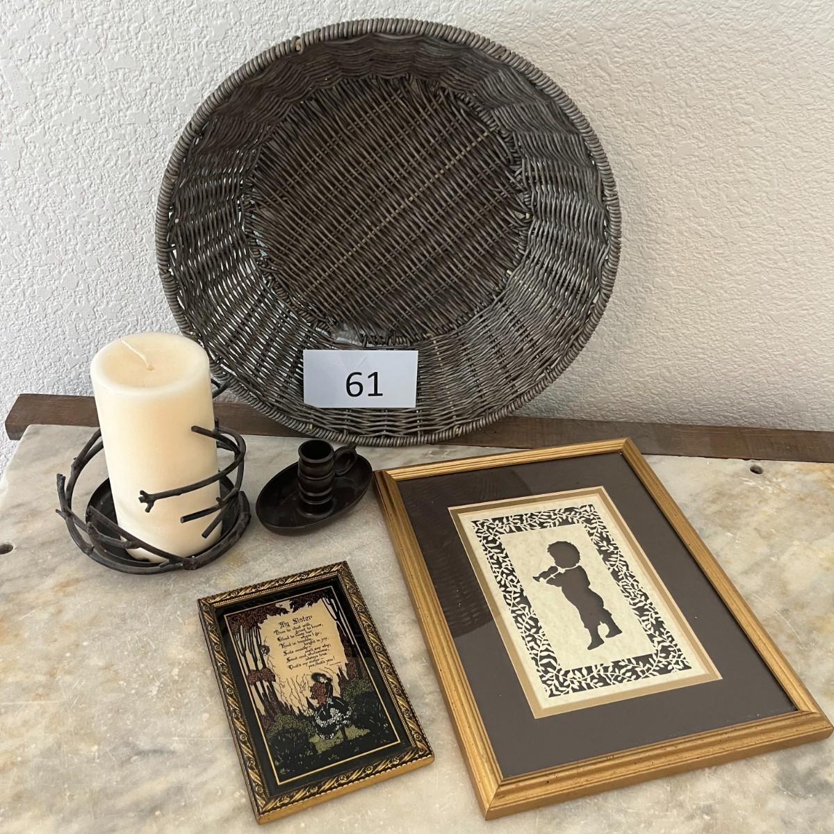 Basket, candle/candle holders, and frame prints