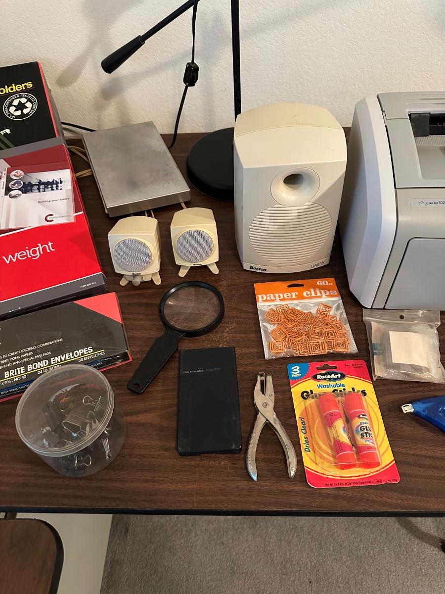 HP LASERJET 1020, BOSTON SPEAKERS & VARIOUS OFFICE SUPPLIES