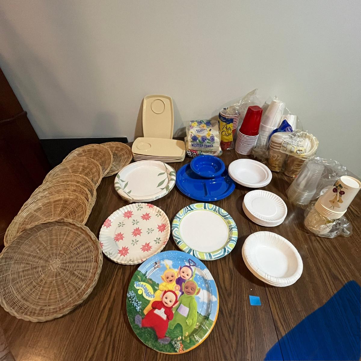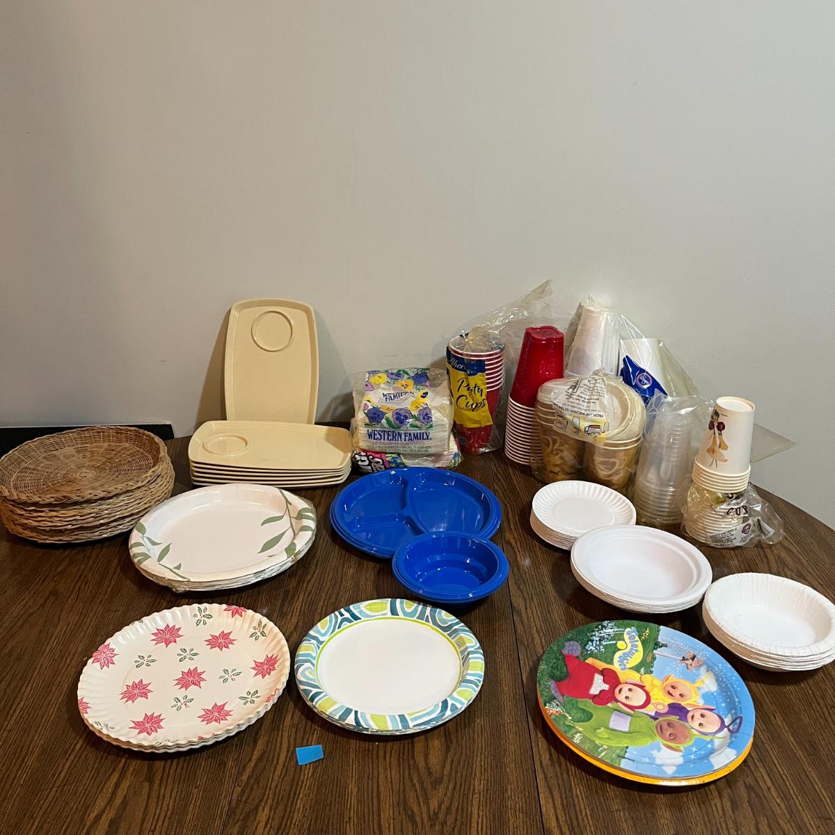 Paper and plastic plates – multiple sizes, styles & themes (including holiday & kids' designs).Plastic serving trays (beige and blue with compartments).Cups – paper & plastic, various sizes (hot & cold beverage types).Paper bowls