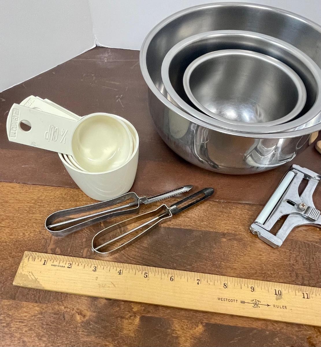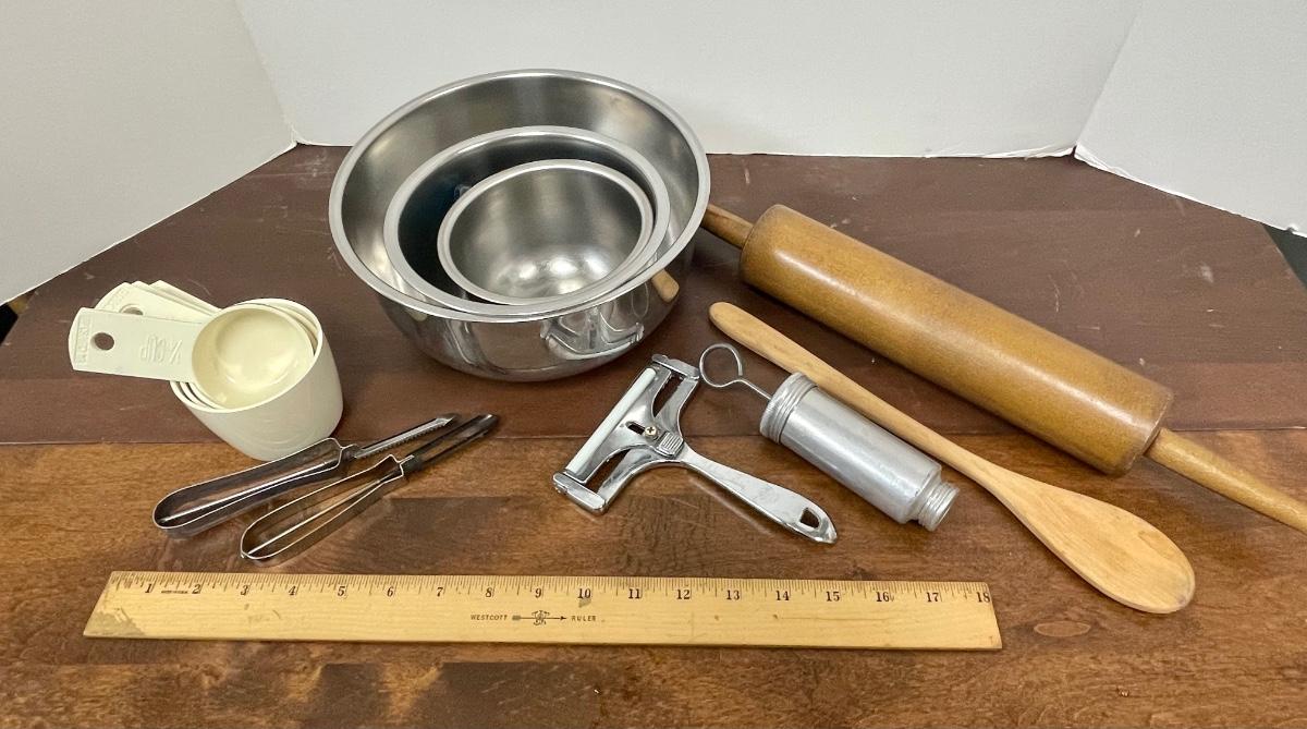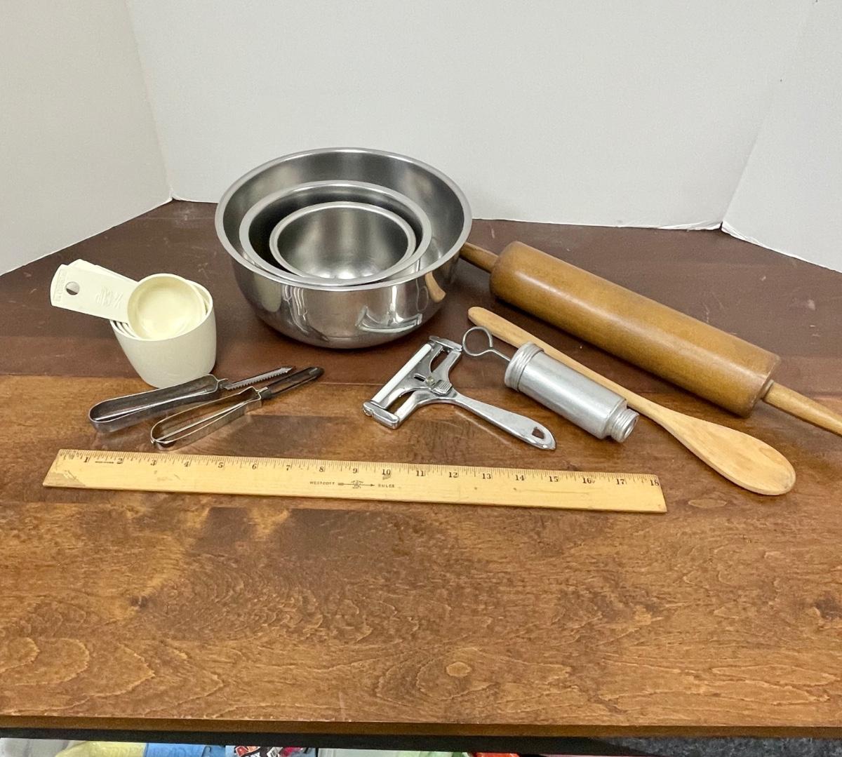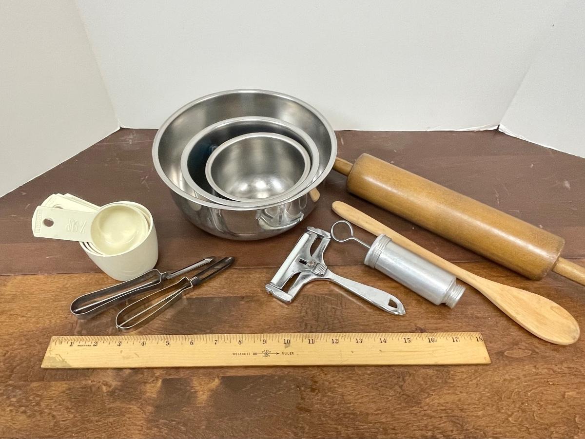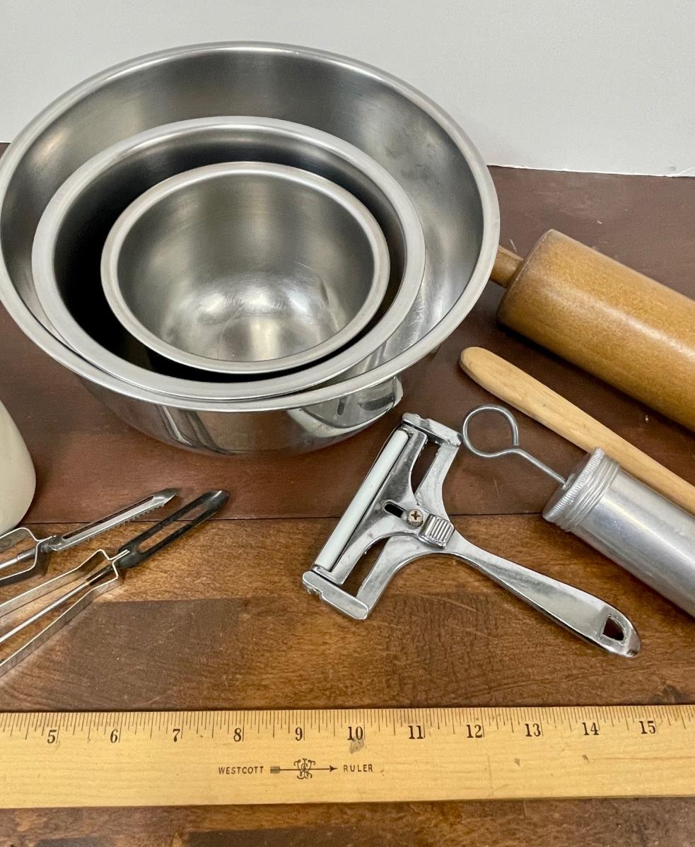 Vintage Kitchen Lot - Aluminum mixing bowls, rolling pin, measuring cups, peelers, slicer, press