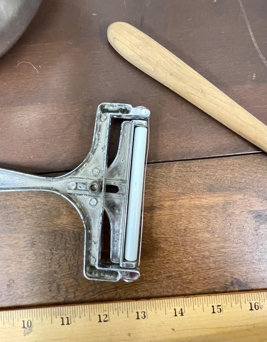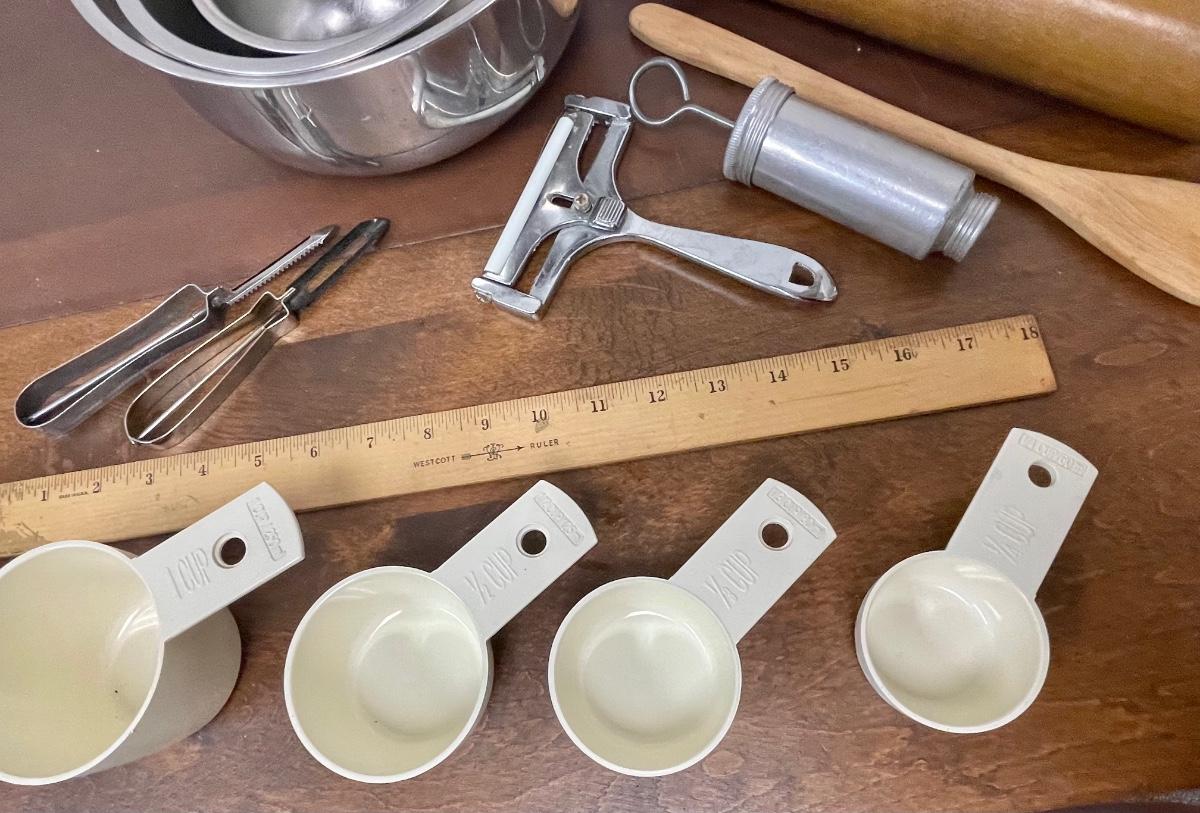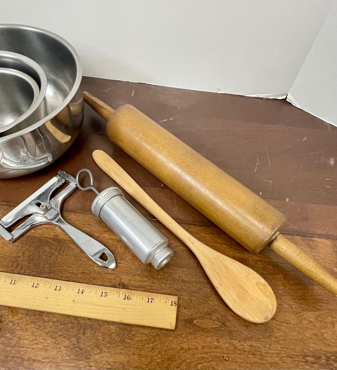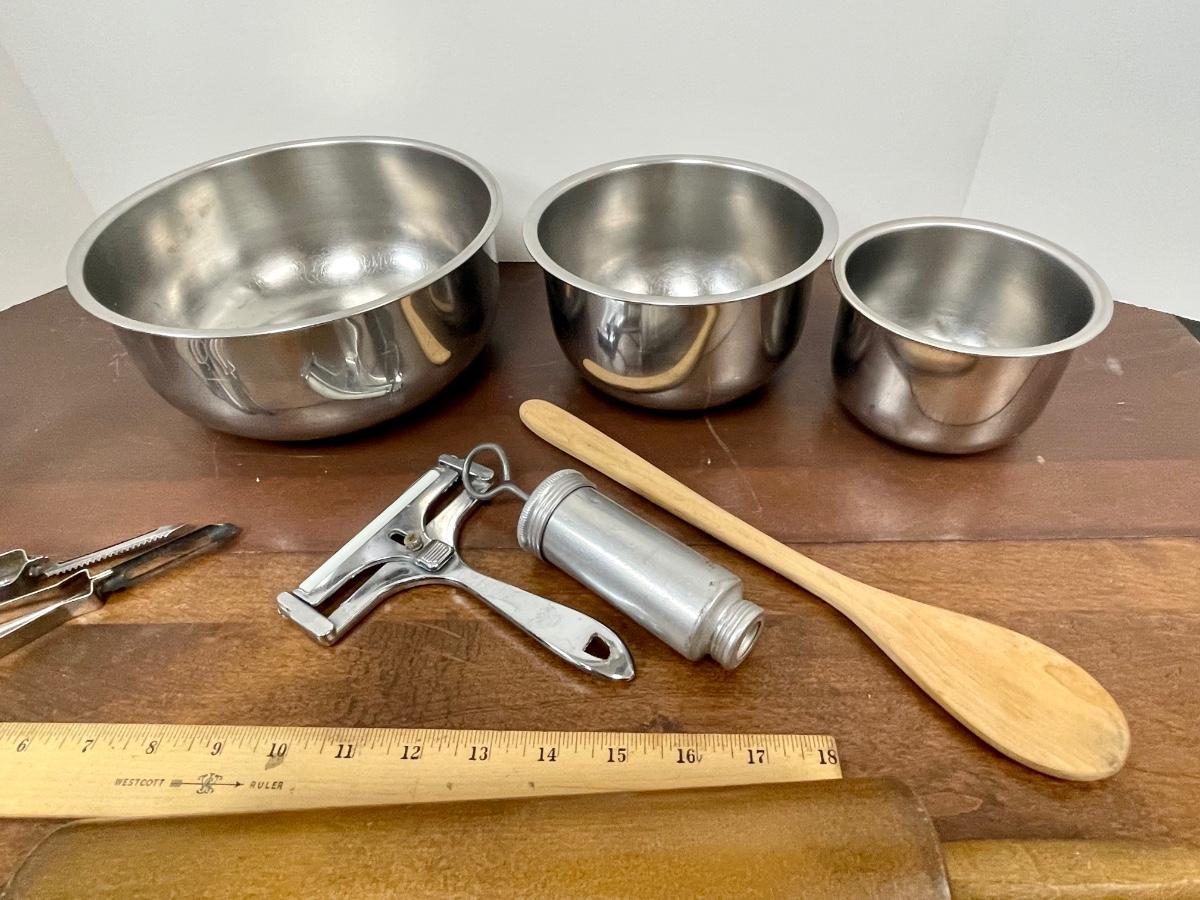 Vintage Kitchen Lot - Aluminum mixing bowls, rolling pin, measuring cups, peelers, slicer, press