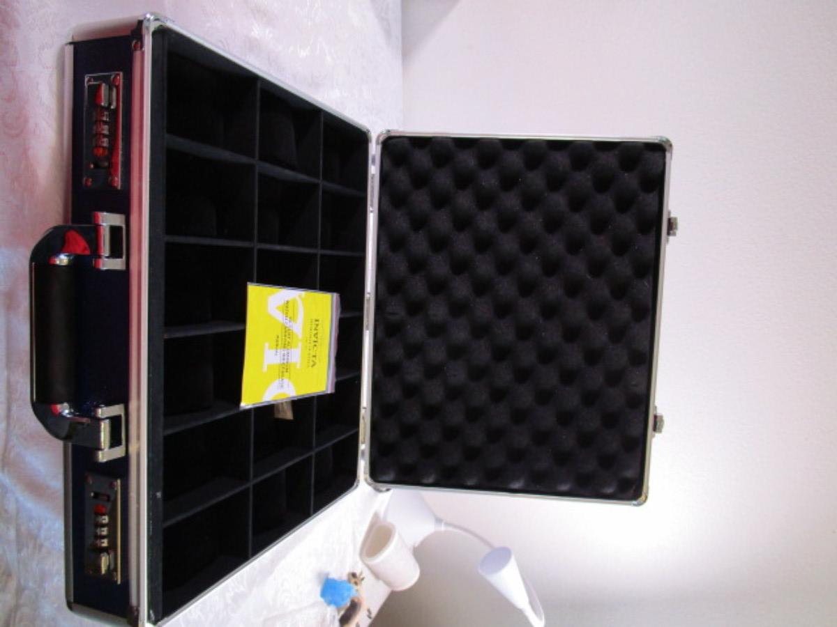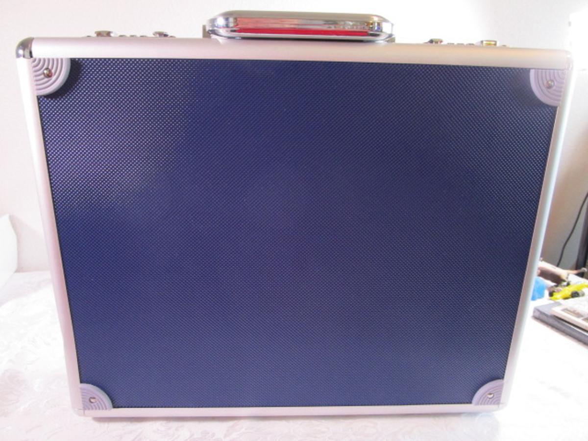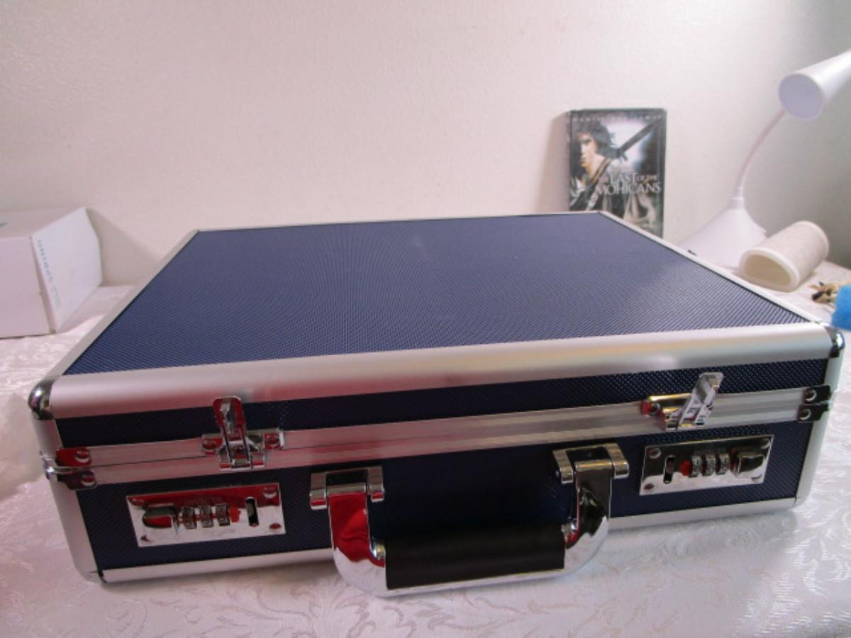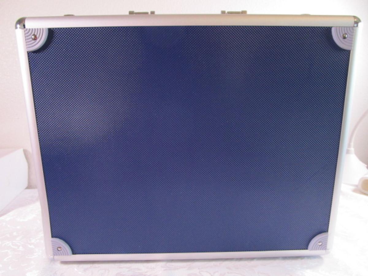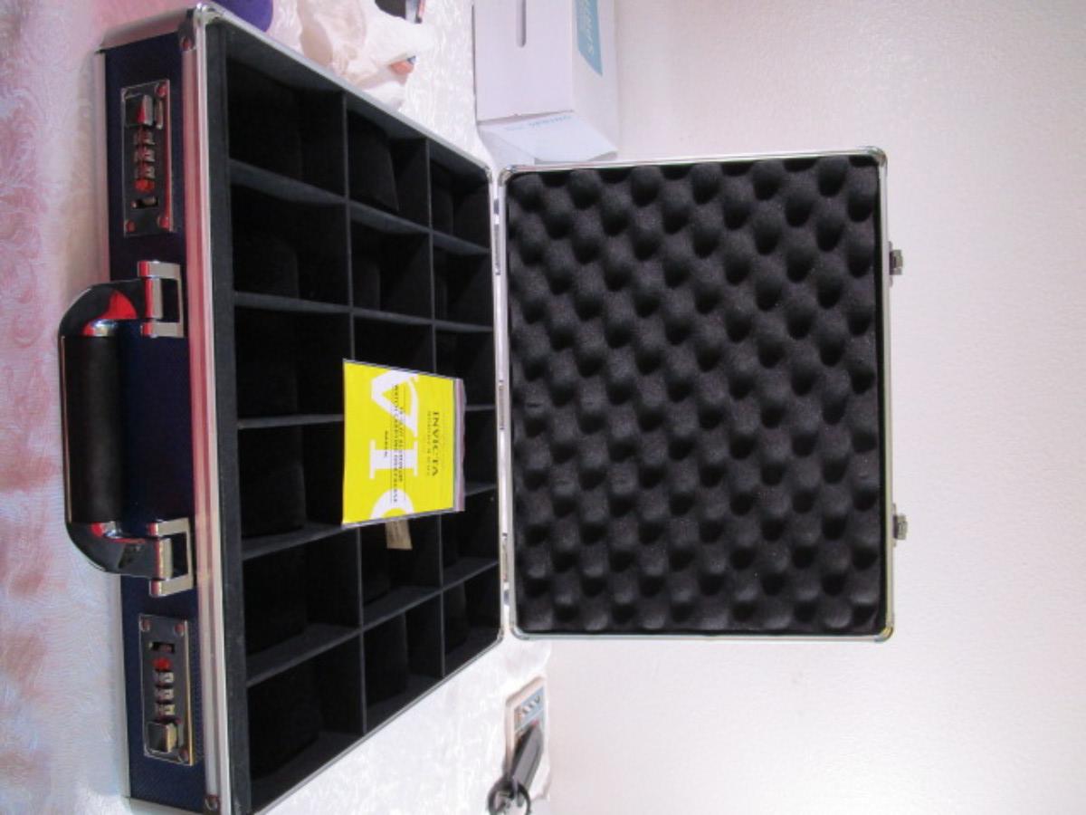 New, but a few small dents, look closely at pictures, holds 18 watches, padded inside, blue & silver