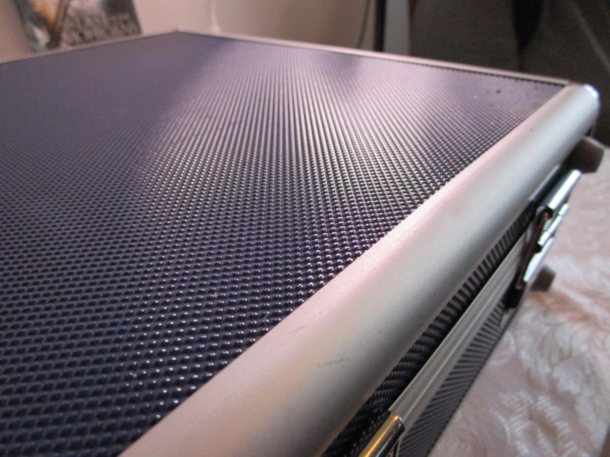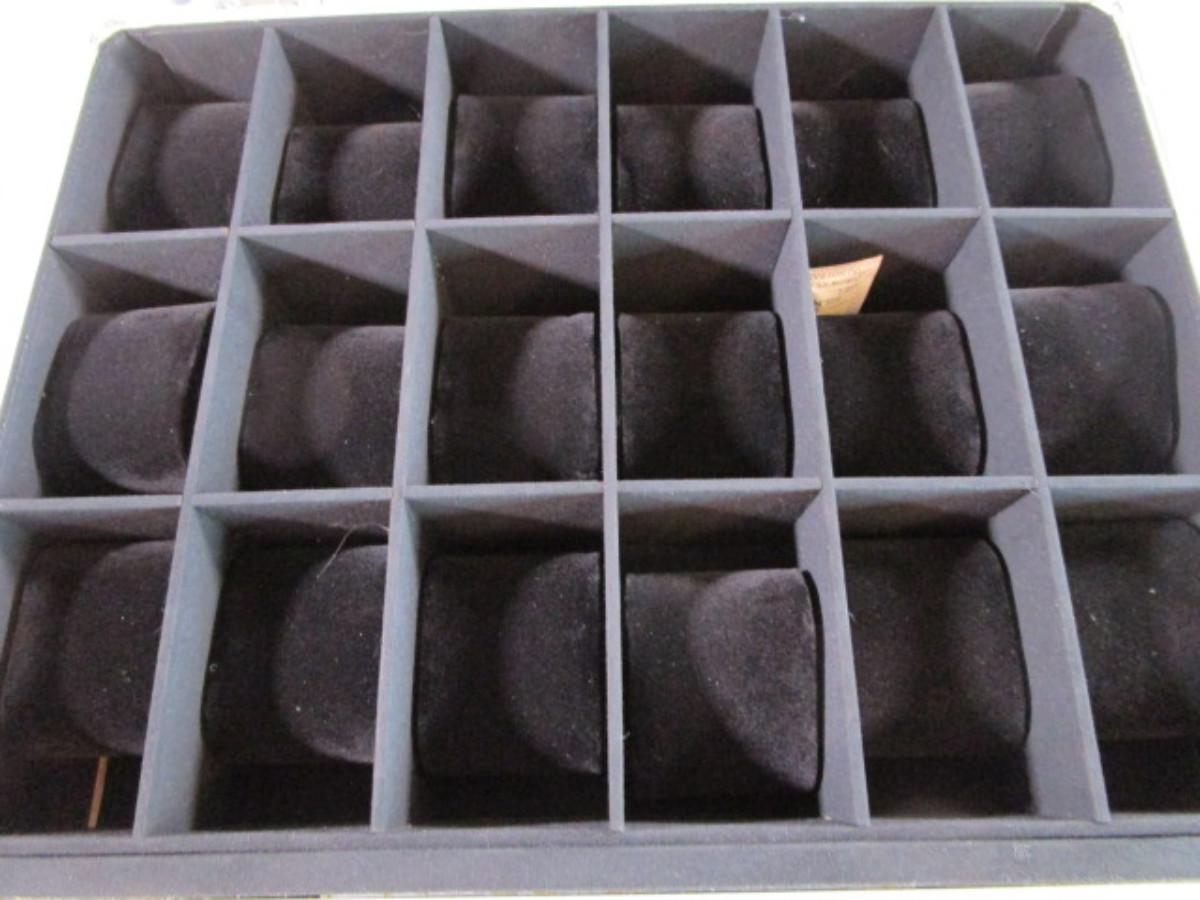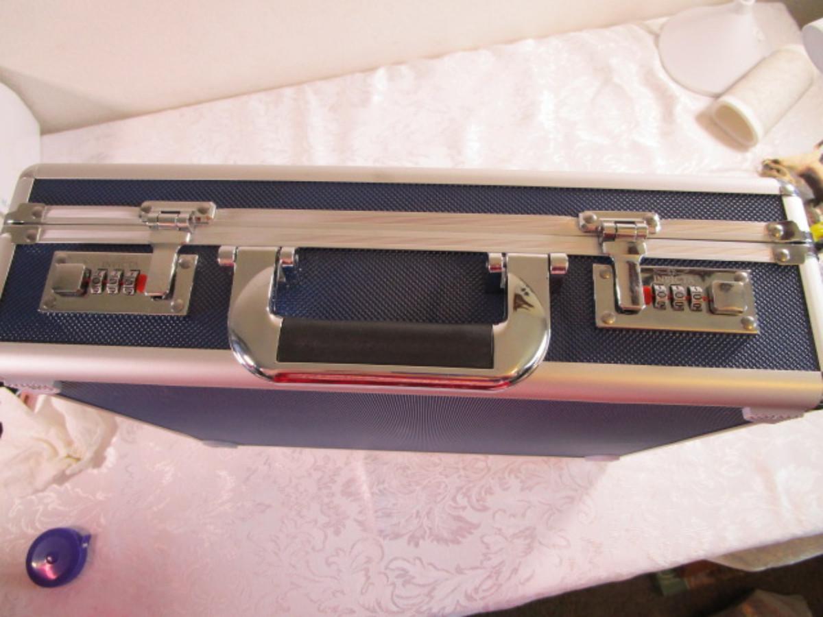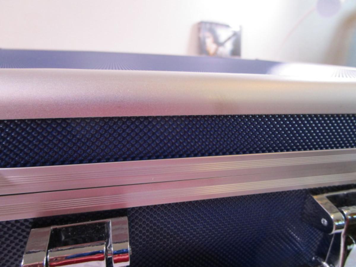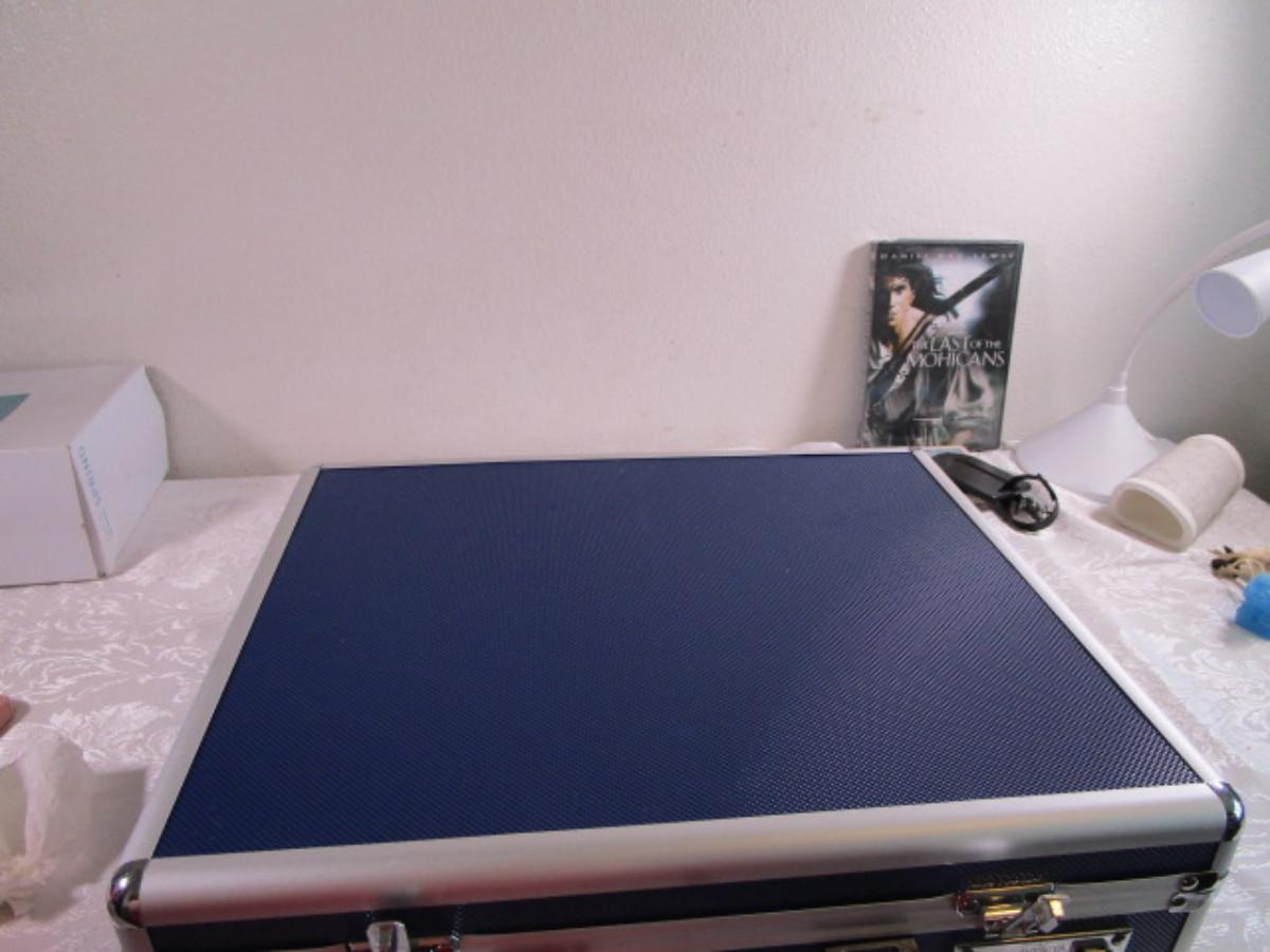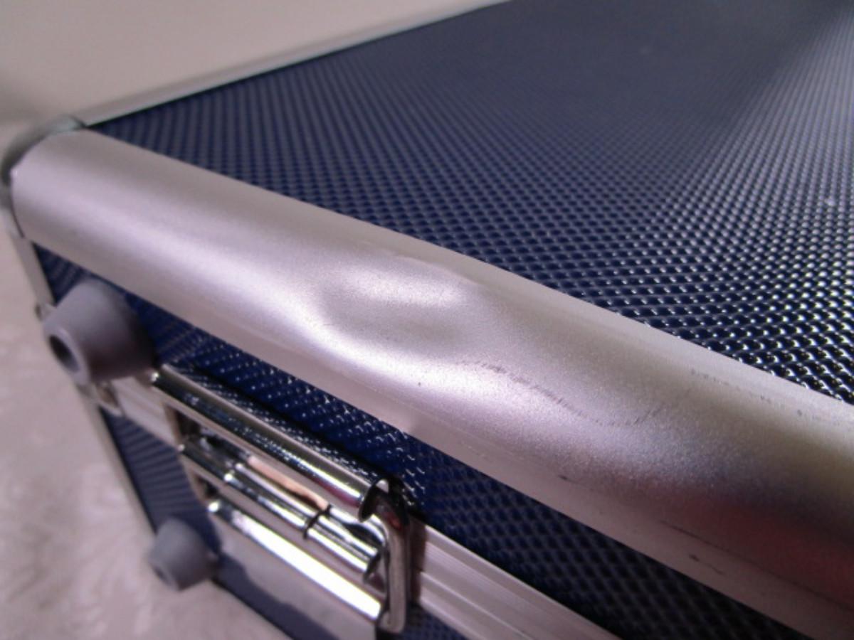 New, but a few small dents, look closely at pictures, holds 18 watches, padded inside, blue & silver