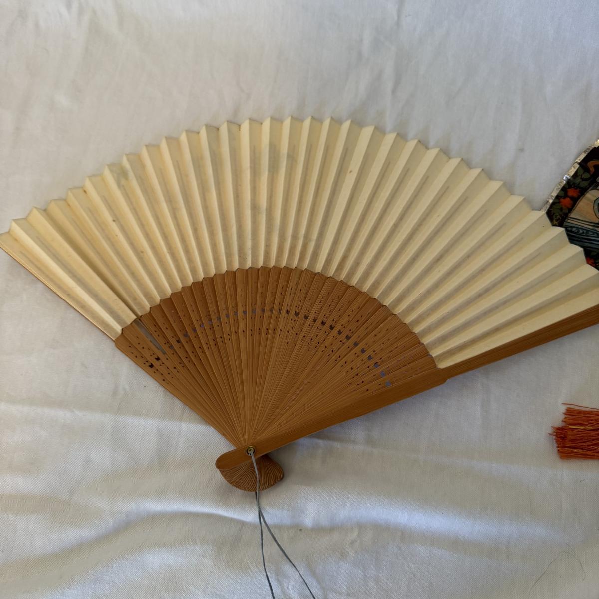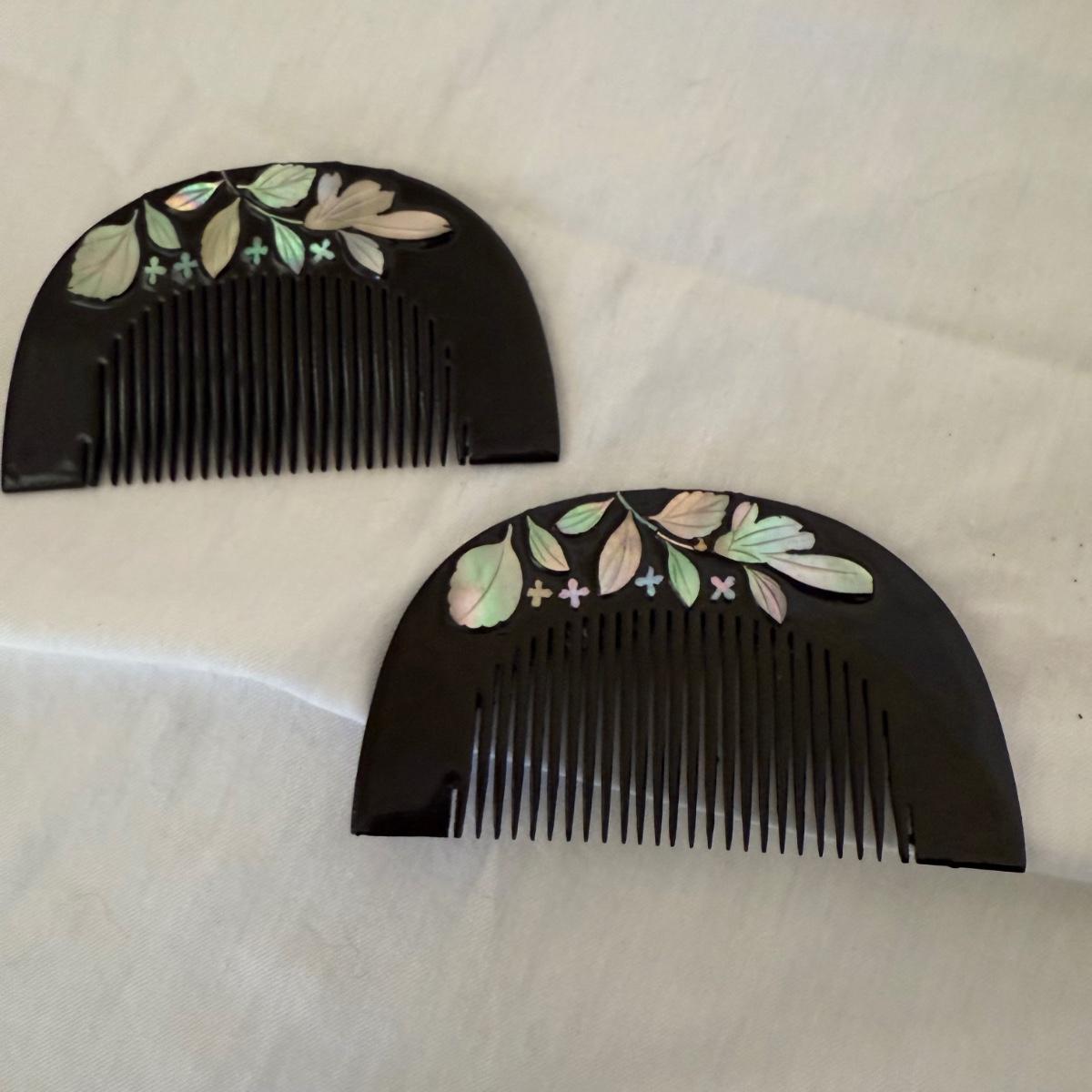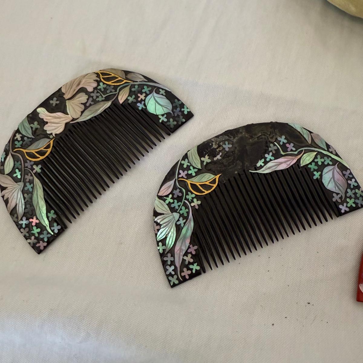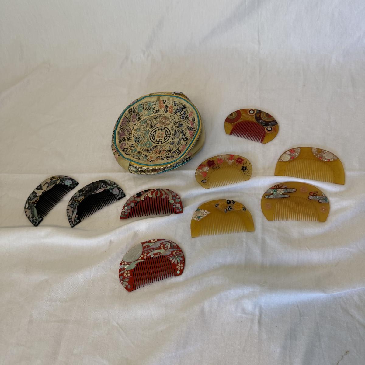 This lot contains nine Japanese hair combs with a case, three fans, and a gorgeous hand-painted navy silk parasol. Starting with the parasol, this piece has a bamboo handle and features beautiful blooming roses. It measures about 32”D when erect x 26”H. There is a small tear, see pictures for details. Next is a small collection of nine stunning Japanese decorative combs, all with slightly different ornate details. They all measure approximately 3.5” x 2” and come with what appears to be silk, case. One of the black combs has some shell inlays that have chipped, see pictures for details. Next we have three folding hand fans. The first appears to be plain bamboo and paper. The second also appears to be bamboo and paper and has what appears to be a hand-painted fruit bloom on one side. The last fan is a stunning, what appears to be hand-painted bamboo fan with a detailed rendition of a harbor scene on the leaf part of the fan. This fan is a bit torn in some places, see pictures for details. Shipping available.